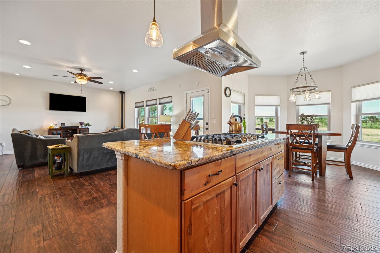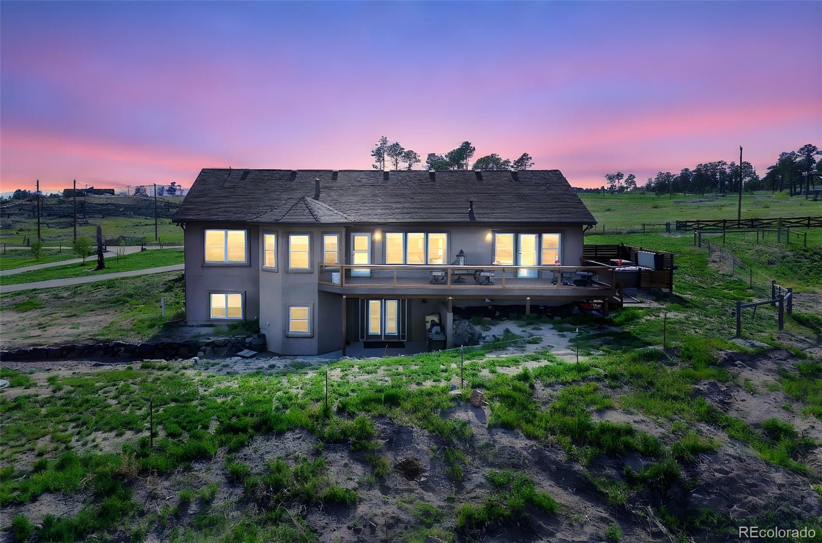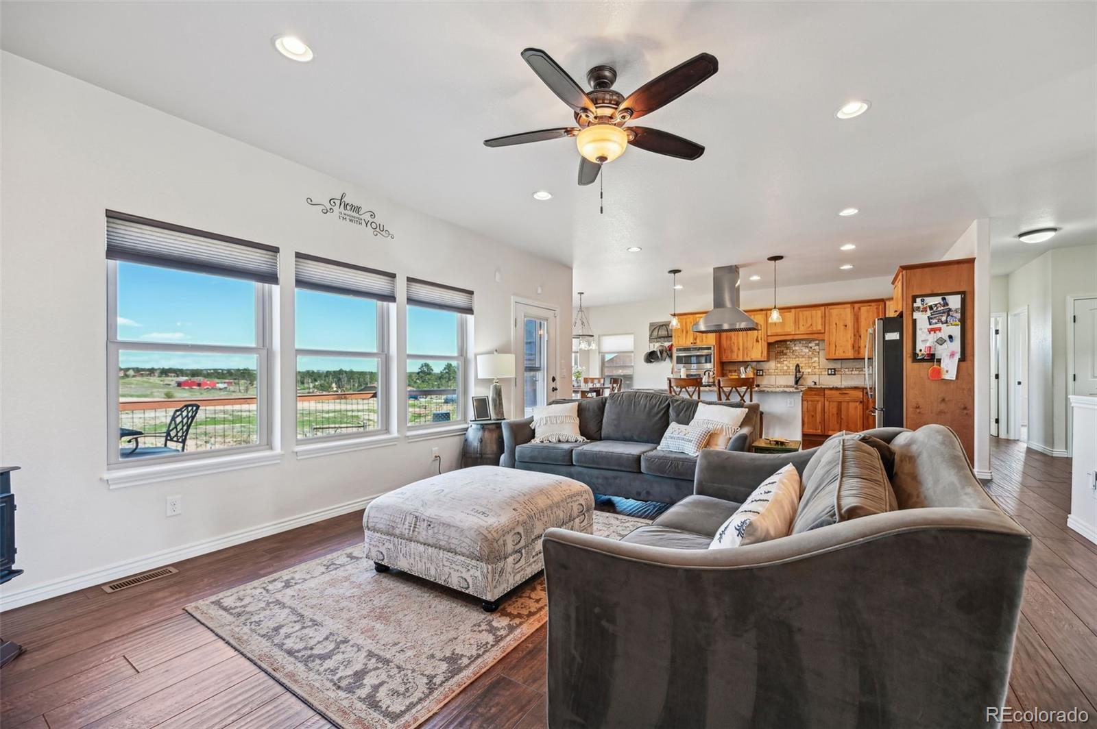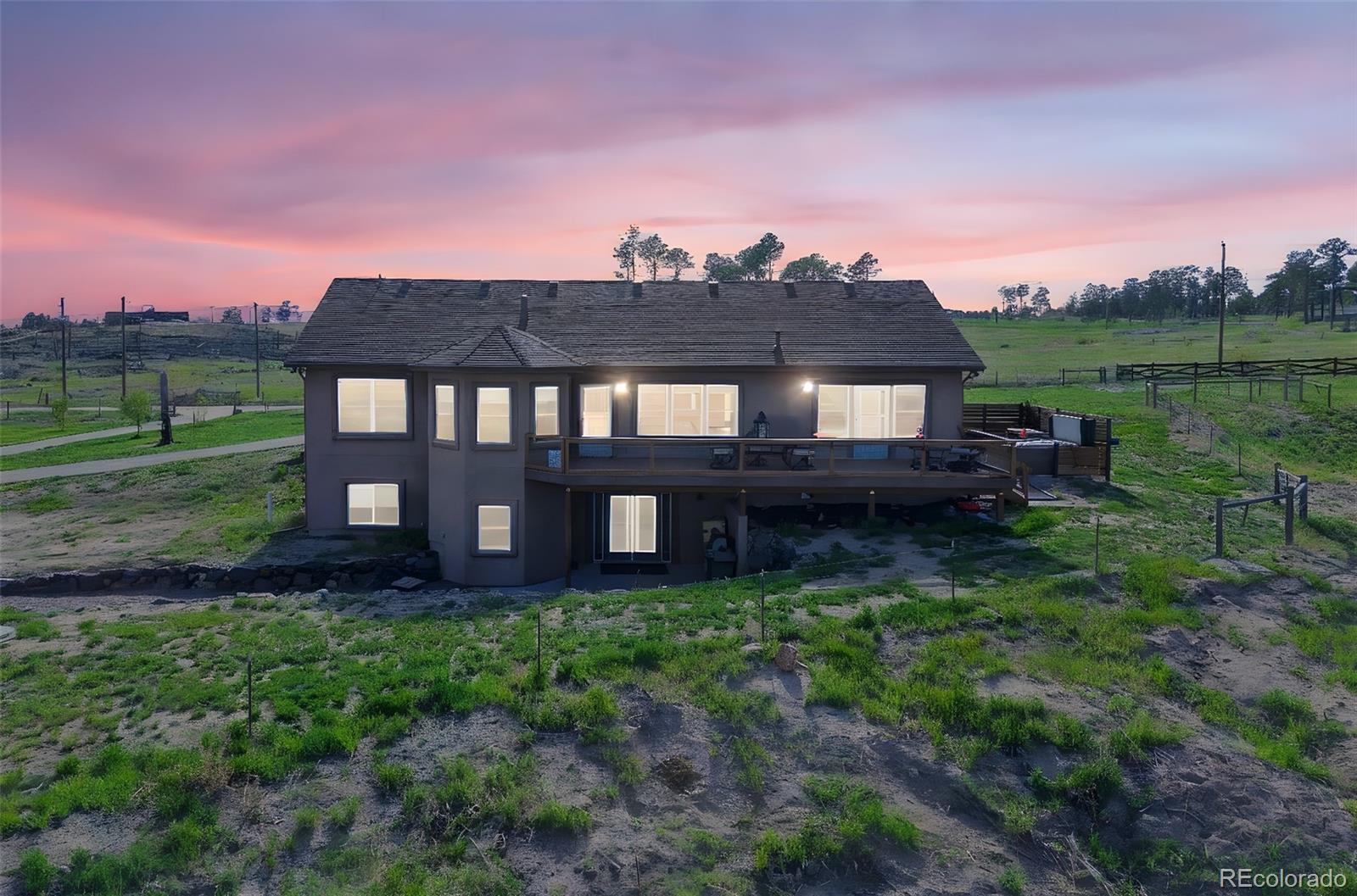 Move-in-ready rancher in Black Forest County Club Estates. This 7.35-acre property is just what you have been waiting for! 5 bdrm, 3 ba home perfectly blends upscale finishes and thoughtful utility with room to work, live, and play. This home offers a gourmet kitchen with beautiful alder cabinets, an oversized granite island, a gas cooktop, a convection microwave, and a wall oven. The master bath features a custom double vanity and a tiled two-person walk-in shower. There are two additional bedrooms and a main-level office. The main level walks out to an oversized composite wood deck. This great home has zoned radiant heat in the basement and forced air natural gas heat with a/c on the main level. The finished basement features a Bowling Alley wood-topped wet bar with a built-in microwave oven and refrigerator. There are two pellet stoves, one on each level. The one in the basement will keep you warm while you play a game of ping-pong or watch a movie in the home theatre. Two additional bedrooms and a large bath make this a great space for you and your guests to enjoy! Lastly is the awesome 40 x 40 foot insulated RV/shop. This space will cover almost every need, whether to store your RV or give you that space for tinkering on cars or building your next project! 3-garage doors, 2-man doors, sheetrocked interior, 30 amp RV plug-in, and dump station, 220 plug for your welder. Built-in shelving, outdoor generator hookup, enclosed and installed on a concrete slab at the pole, ready for emergency power when needed. Buried fiber internet to both the shop and the home. The 7.35-acre lot has been cleared and fenced. The property is zoned for animals. The private hot tub area is a great place to retreat to at the end of a long day, or you may prefer the front porch, which gives you a perfect spot to sit and enjoy the beautiful sunset over Pikes Peak. So put this home on your must-see short list and come and see for yourself all this great house has to offer and MORE!