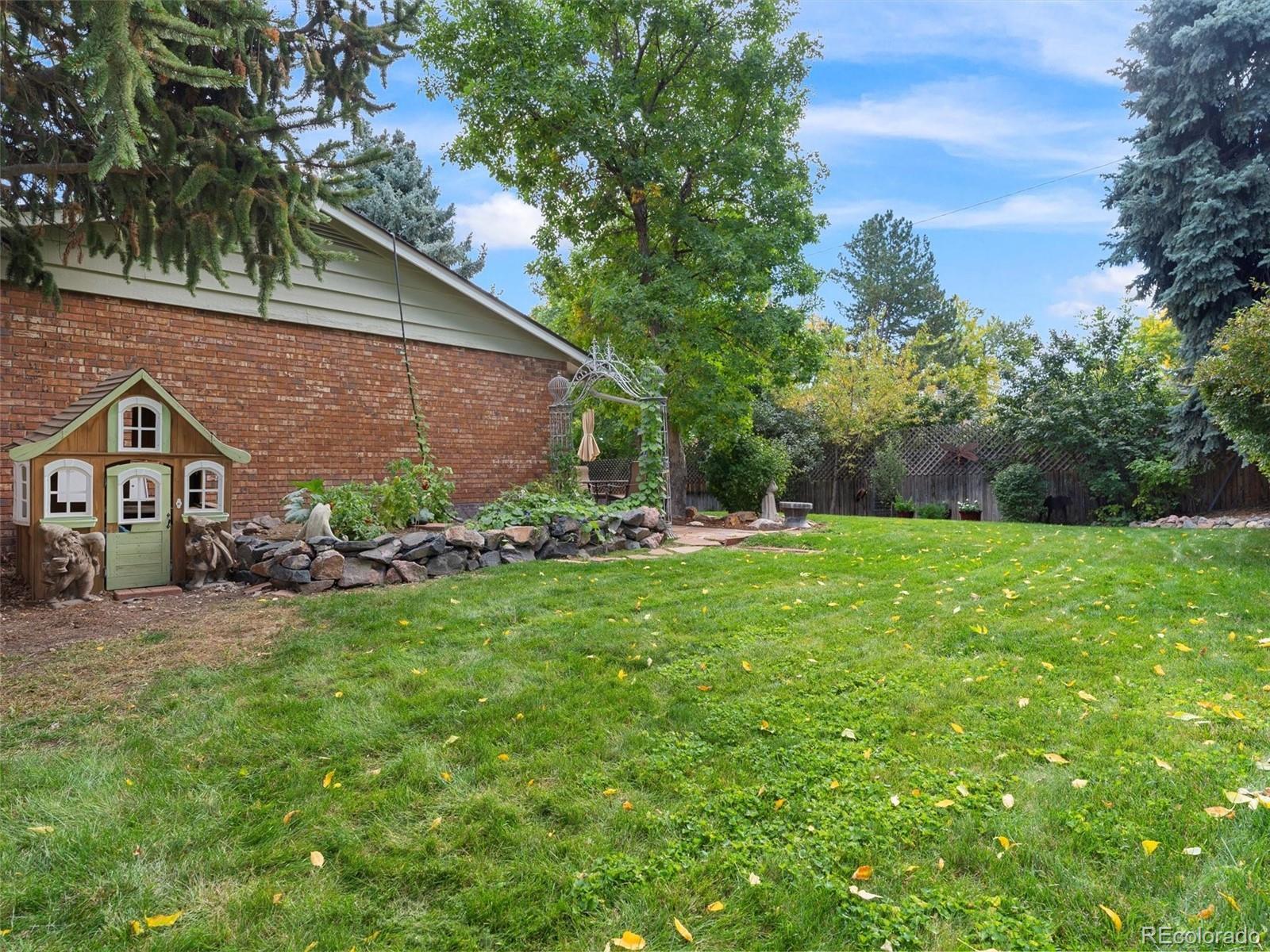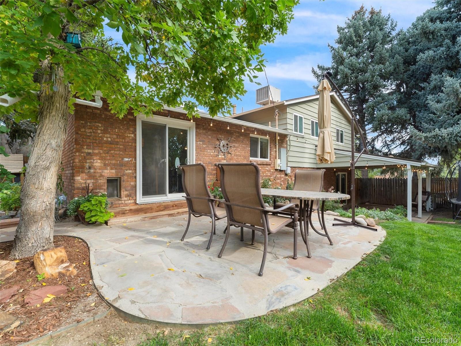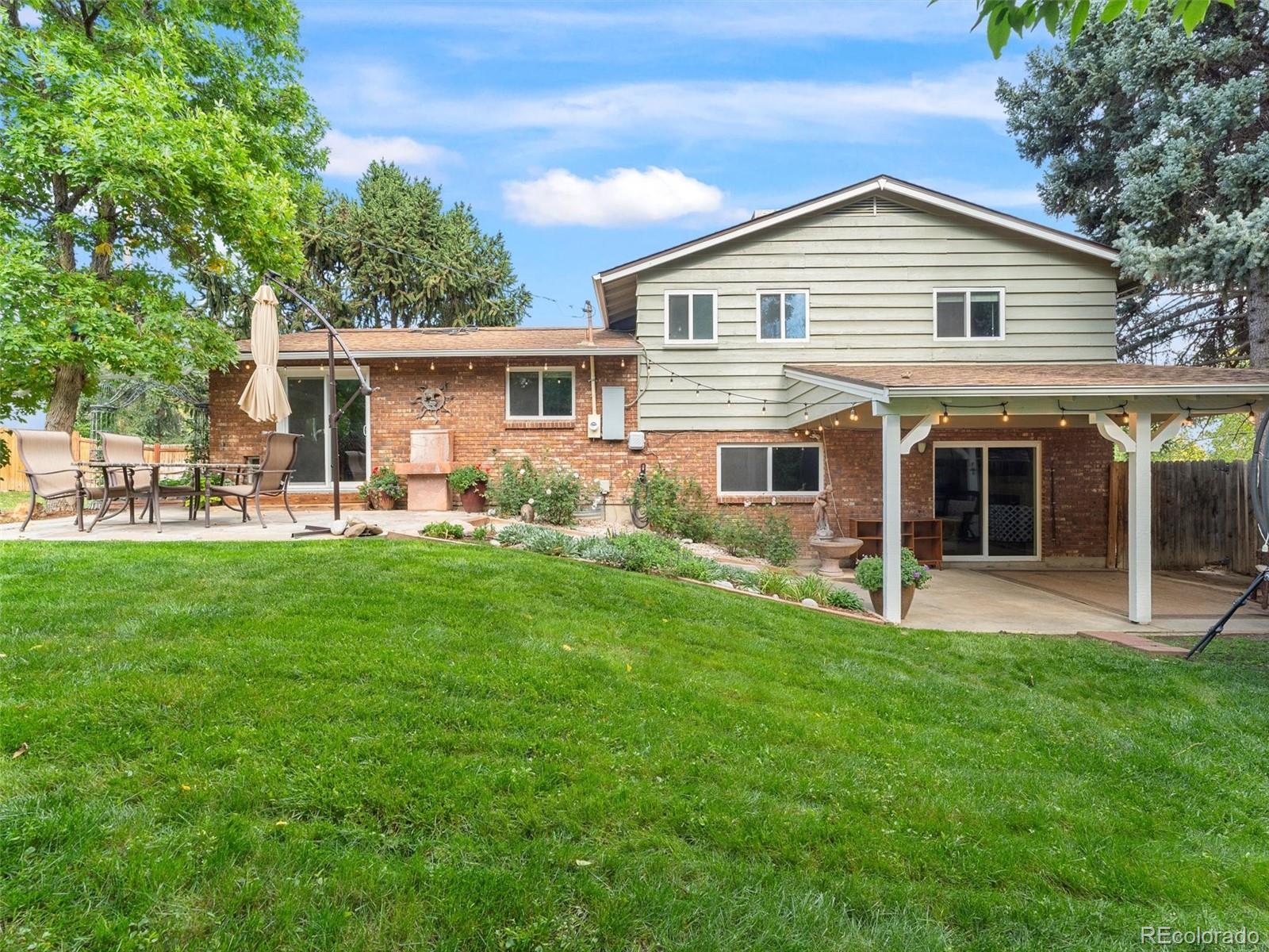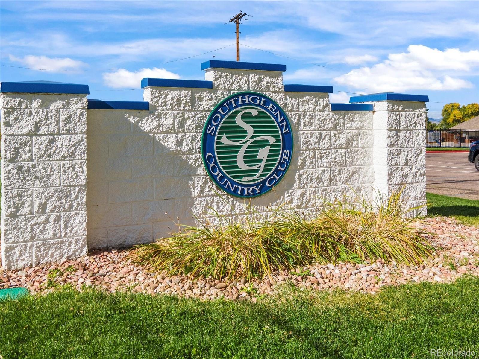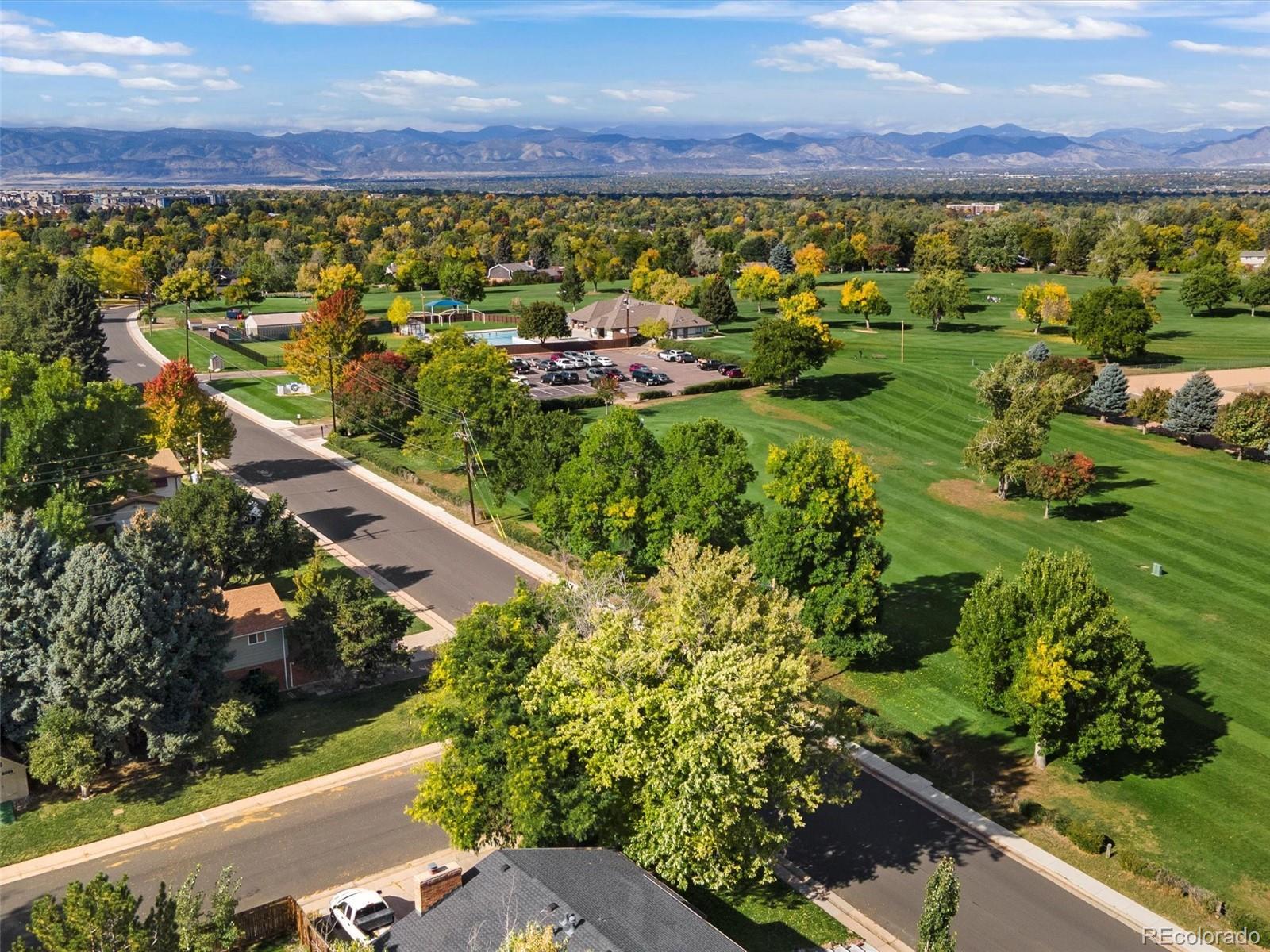 Terrific home and location looking at the Southglenn Country Club golf course with a mountain view out the front window. Walk into the home with a tile entry and a very open floor plan ( walls taken down ) on the main level. White Kitchen cabinets along with granite countertops, stainless appliances, recessed lighting, custom sconces over a kitchen island. Sliding door gives great access to the patio in the back yard. Family room on the lower level is very large with fireplace and custom surround and mantel and includes the TV over the fireplace. Another sliding glass door gives access the the covered portion of the patio which leads to a very private back yard, which includes the bistro lighting and trampoline. Home has new interior paint throughout and there is hardwood flooring on the stairs and wood laminate flooring in the family room, with all new carpet on the upstairs level. Primary bedroom comes with a ceiling fan and has its own private bath area which is all updated with two sinks and a custom shower and tile flooring. The basement is partially finished with a laundry area that has shelving, a non conforming bedroom and a large storage room with shelving and a large work bench. Neighborhood is a wonderful place to buy a home, close to all the conveniences, including the Streets of Southgelnn. Floor plan is in supplements.