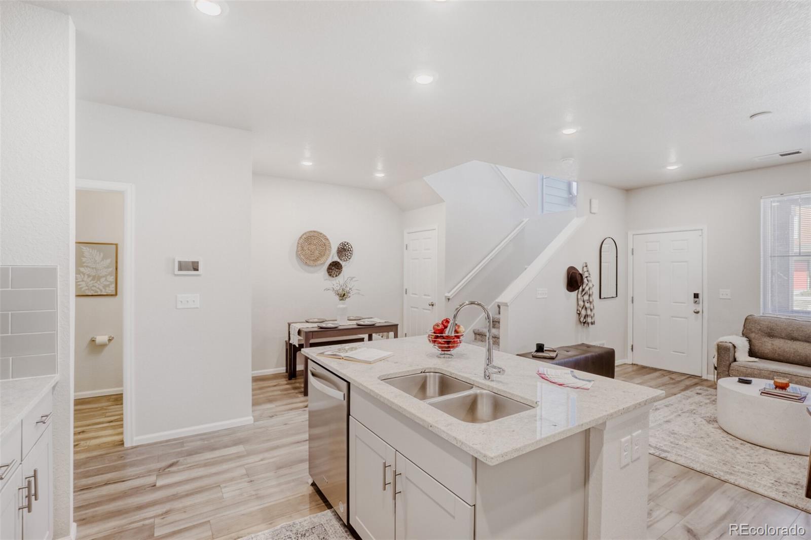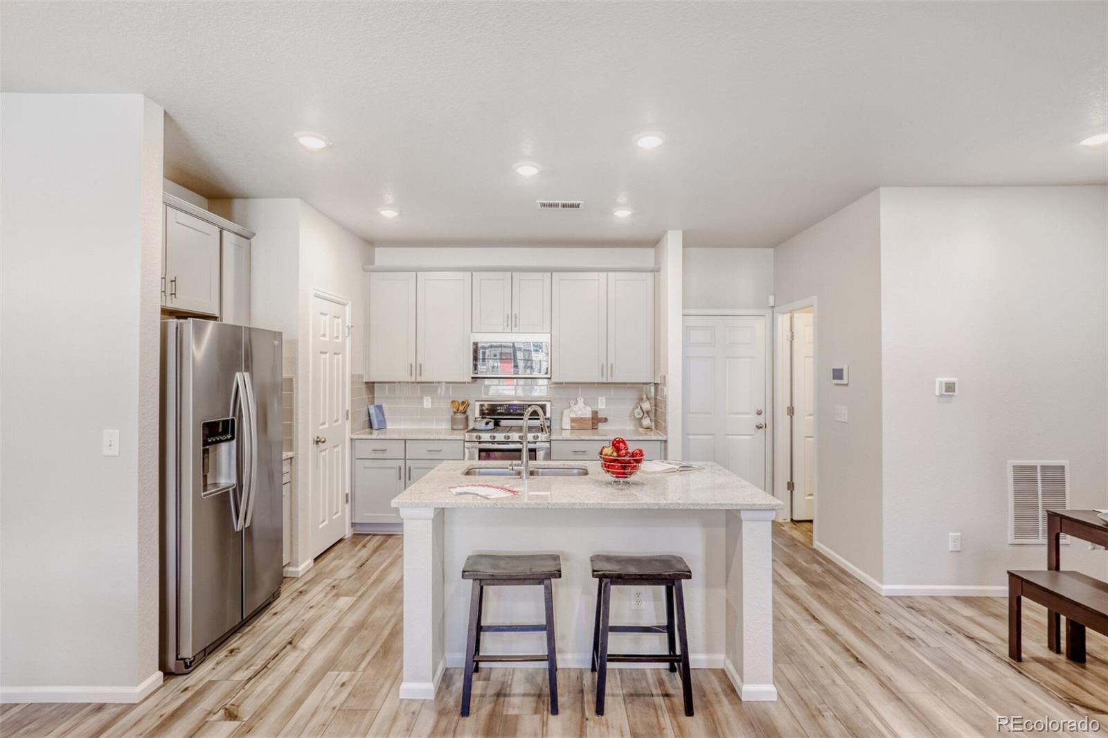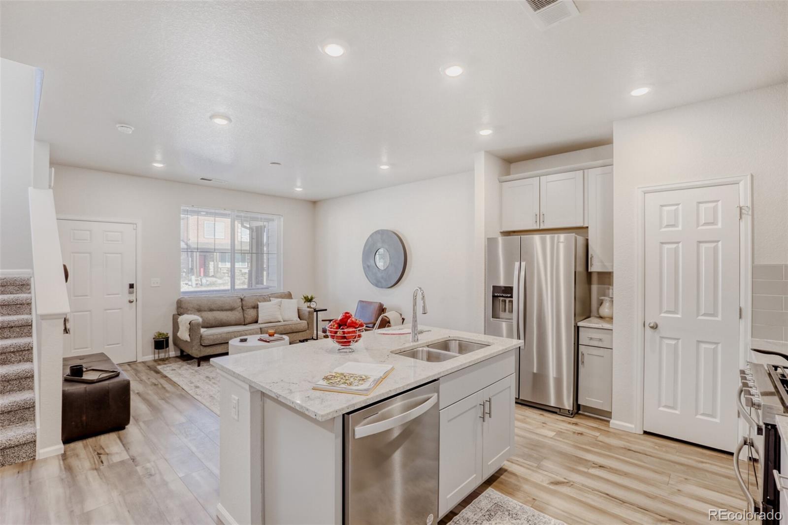 **Up to 2% below market rates with preferred lender!** Better value than new construction, this like-new Painted Prairie townhouse combines low maintenance, great location and thoughtful layout in the perfect lock-and-leave package. Gorgeous kitchen features a large pantry, beautiful granite island, glass tile backsplash and true convection dual oven with 5-burner gas range. Attractive luxury vinyl plank flooring throughout main level. Spacious master retreat with large walk-in closet and luxurious bathroom. Convenient upper-level laundry room. Additional upgrades include security and smart-home integration package and 220v EV charger. Amazing Painted Prairie neighborhood with award-winning parks, community garden, outdoor art and even a neighborhood gathering space right off your front patio! Easy commute by car or train to downtown, and DIA, Gaylord Rockies and dozens of major employers are just a few minutes away, making it the perfect location for jet-setters and investors alike.
