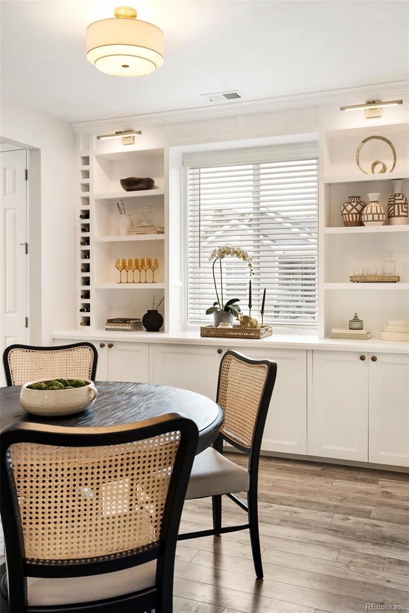 A curated balance of design and livability, this Crystal Valley Ranch residence offers refined single-level living on a private corner lot with sunny southern exposure. Thoughtfully finished in organic, earth-toned materials, the open floorplan is enhanced by 9-foot ceilings. The heart of the home is the spacious kitchen, anchored by a large island and stainless steel appliances. Custom built-ins with cabinetry and shelving elevate the dining area, which can easily be converted back to a third bedroom per the original design option. The primary suite boasts a custom closet system and a tranquil bath with double sinks and a walk-in shower, while the secondary bedroom offers its own custom closet and a nearby full bath. An office nook provides ideal work-from-home flexibility. Outside, a newly poured concrete patio and fresh landscaping with trees and perennials create a private outdoor haven. With ceiling-mounted garage storage, an LG washer and dryer set and updated lighting, this home delivers true lock-and-leave ease. The floor-plan is designed with the option to convert the current dining space to a third bedroom per original builder plans.