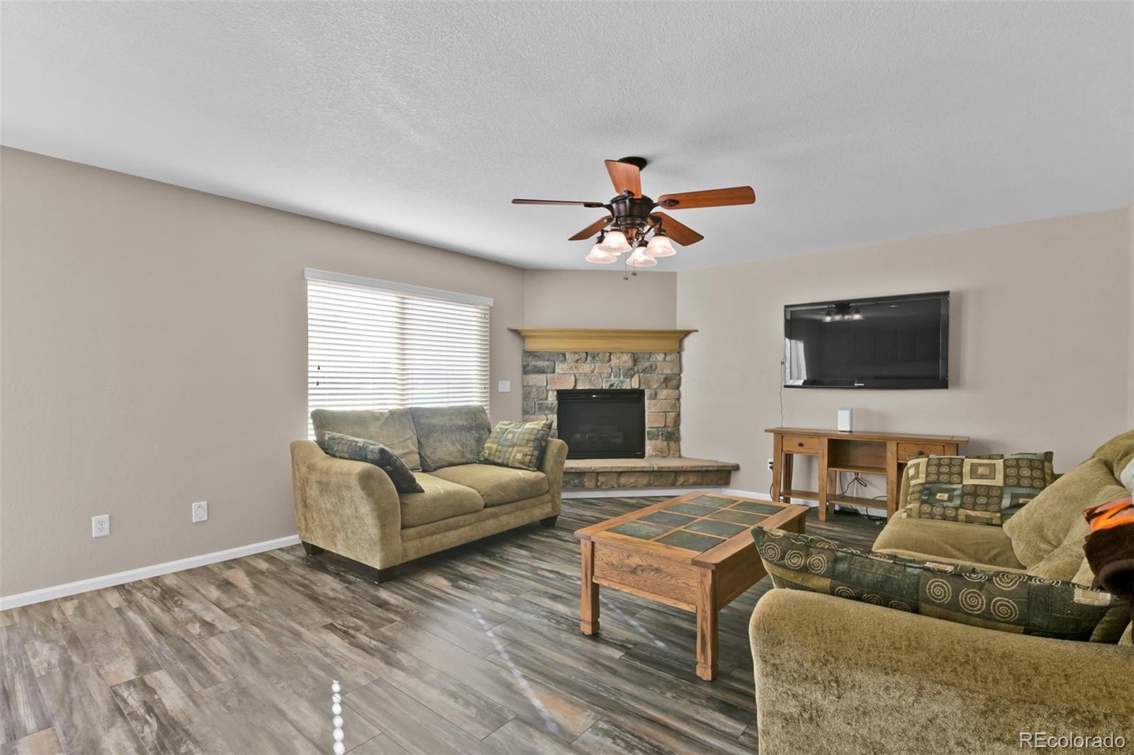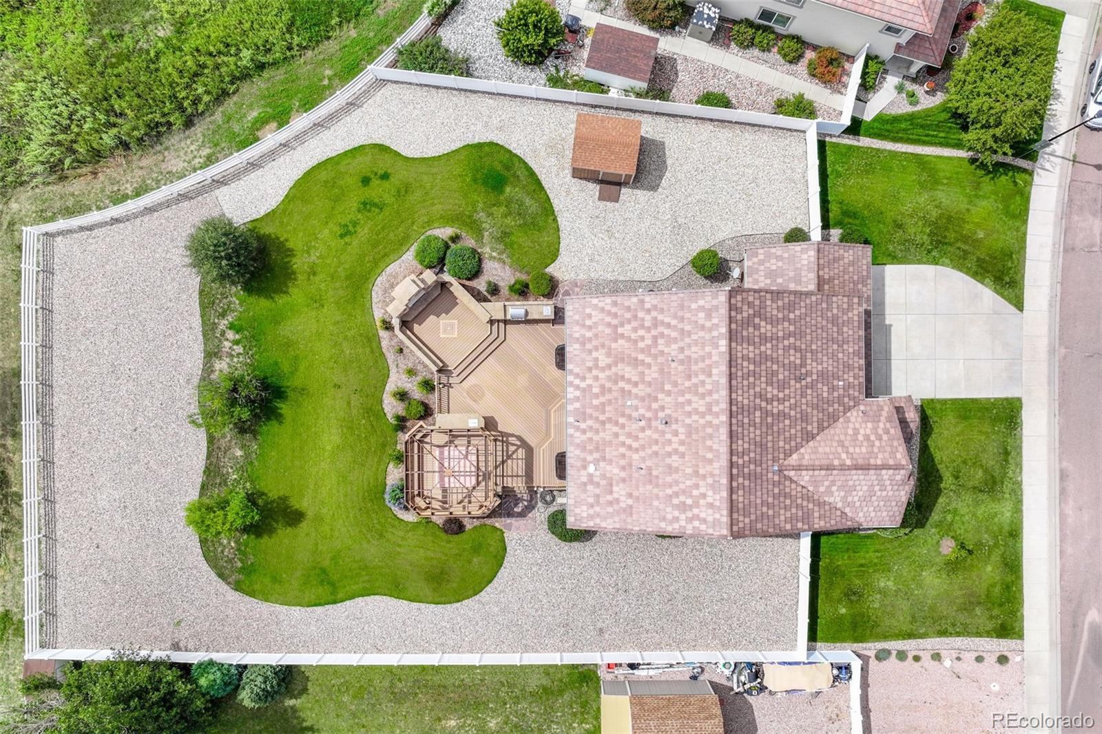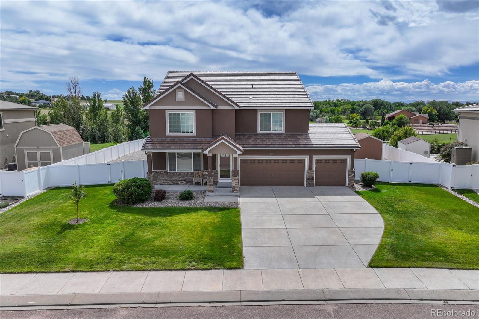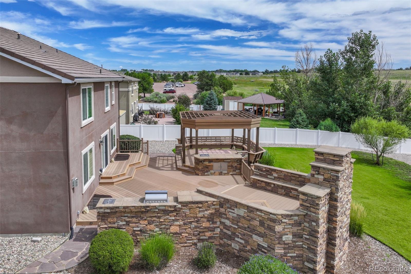 Welcome to this stunning 5,300+ sq ft home, where elegance and functionality meet. The exterior showcases stucco siding, a tile roof, vinyl fencing, and a three-car attached garage. Step into the backyard oasis featuring a large composite deck with a built-in fireplace, outdoor kitchen with cooler, covered hot tub, wired patio speakers, and a backyard shed, the perfect setting for entertaining or relaxing under the Colorado skies. Inside, the gourmet kitchen is a chef’s dream, boasting corian countertops, dual ovens (including convection), a large pantry, and a center island designed for both prep and gathering. The main level includes a spacious family room, a living room with a cozy gas fireplace, a formal dining room, and a private office ideal for remote work or study. Upstairs, you’ll find four generous bedrooms and a versatile loft. The primary suite offers a luxurious escape, featuring a five-piece bath with a jetted tub, stand-alone shower, his-and-her closets, and dual vanities. A laundry room on this level adds convenience to daily living. The finished basement extends your entertaining space with a bedroom, den, living room, and a dry bar. Plus a 17.1 surround-sound system and tanning bed, perfect for movie nights or guests. Additional highlights include a sump pump, water softener, home humidifier, central vacuum, and dual furnaces, providing comfort and efficiency year round. This exceptional home truly has it all, space, sophistication, and lifestyle. Offering the ideal blend of indoor luxury and outdoor enjoyment.