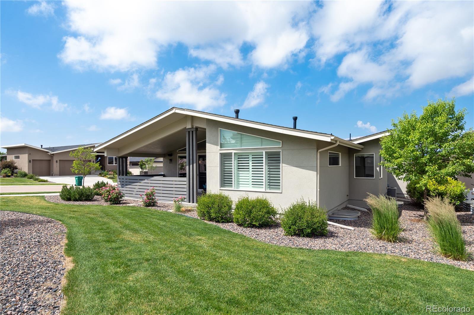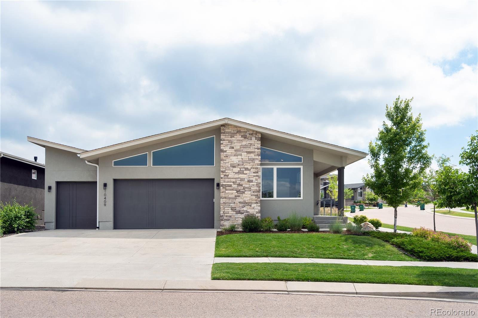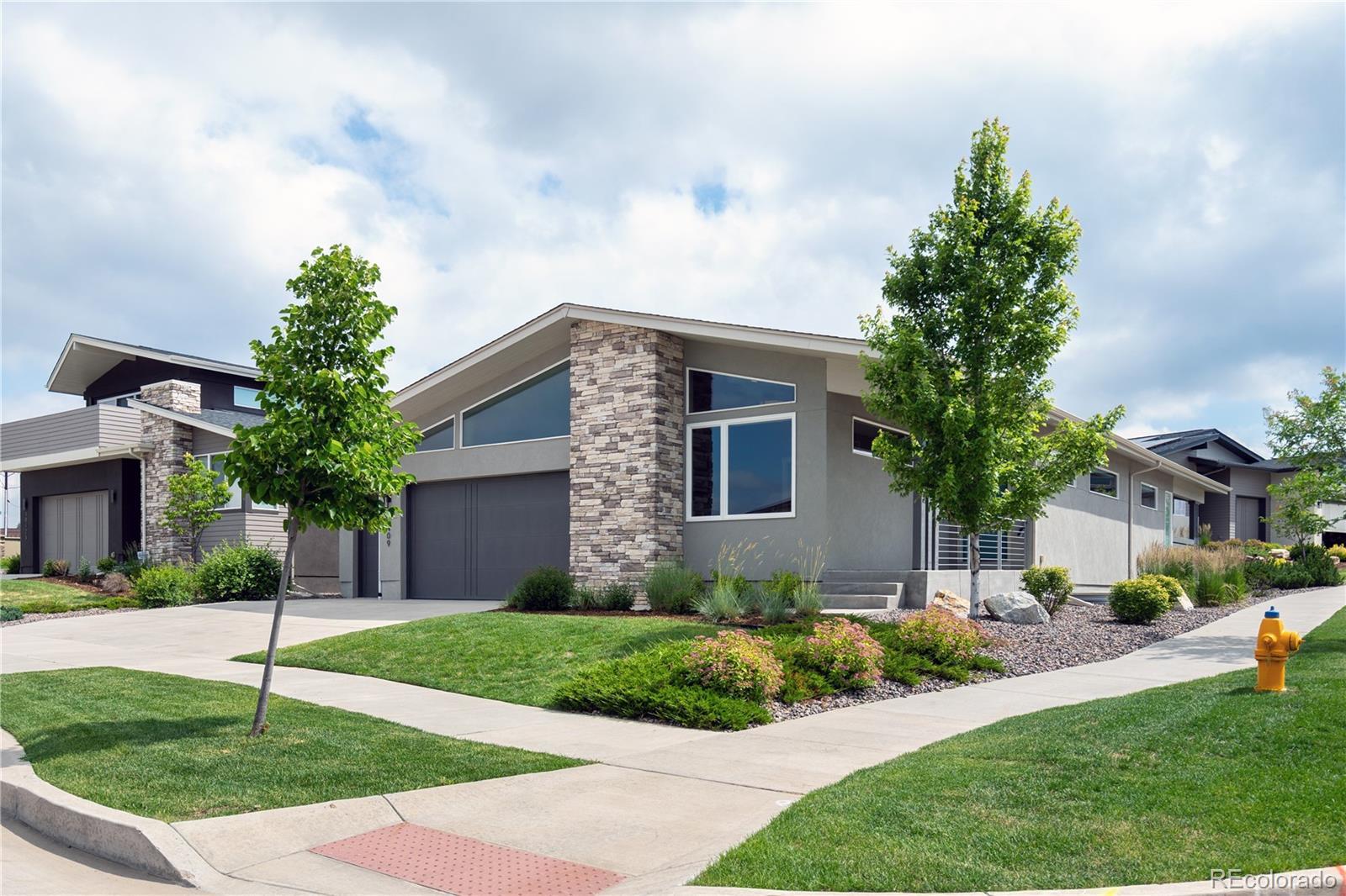 Welcome to this stunning 4-bedroom, 5-bath, 3-car garage ranch-style home in the highly sought-after Élan section of Cordera. Formerly a model and Parade of Homes showcase, this mid-century modern gem is filled with high-end designer upgrades and custom finishes throughout—including custom window treatments throughout the home. Step inside to an open-concept floorplan that seamlessly connects the kitchen, living, and dining areas—perfect for both daily living and entertaining. The great room features a dramatic 12-foot brick fireplace wall, while the entry makes a statement with a custom wood accent wall. The gourmet kitchen impresses with quartz countertops, a striking herringbone backsplash, upgraded appliances, and a unique display cabinet on the island. The main level includes a luxurious primary suite with an upgraded bathroom, a second bedroom with its own ensuite full bath, a stylish powder bath for guests, and a conveniently located laundry room. The fully finished lower level is designed for versatility and comfort, offering a spacious family room with a gas fireplace, wet bar, a yoga room with a mirrored wall, an additional bedroom, two more bathrooms, and an oversized storage room—ideal for a future bedroom, home theater, or fitness studio. Step outside to enjoy the expansive covered concrete patio, complete with a gas line for a firepit, ambient lighting, outdoor speakers, and a privacy wall—an ideal space for relaxing or entertaining. Take in beautiful Front Range views from the front porch, and enjoy the convenience of a 3-car garage with professionally coated floors for easy cleaning and durability. Located close to top-rated schools, shopping, restaurants, hospitals, and Powers Boulevard, this low-maintenance community includes lawn care, irrigation system maintenance, and snow removal—perfect for those who travel often or prefer easy living. All furniture in the home is available for purchase, making this an exceptional turnkey opportunity.
