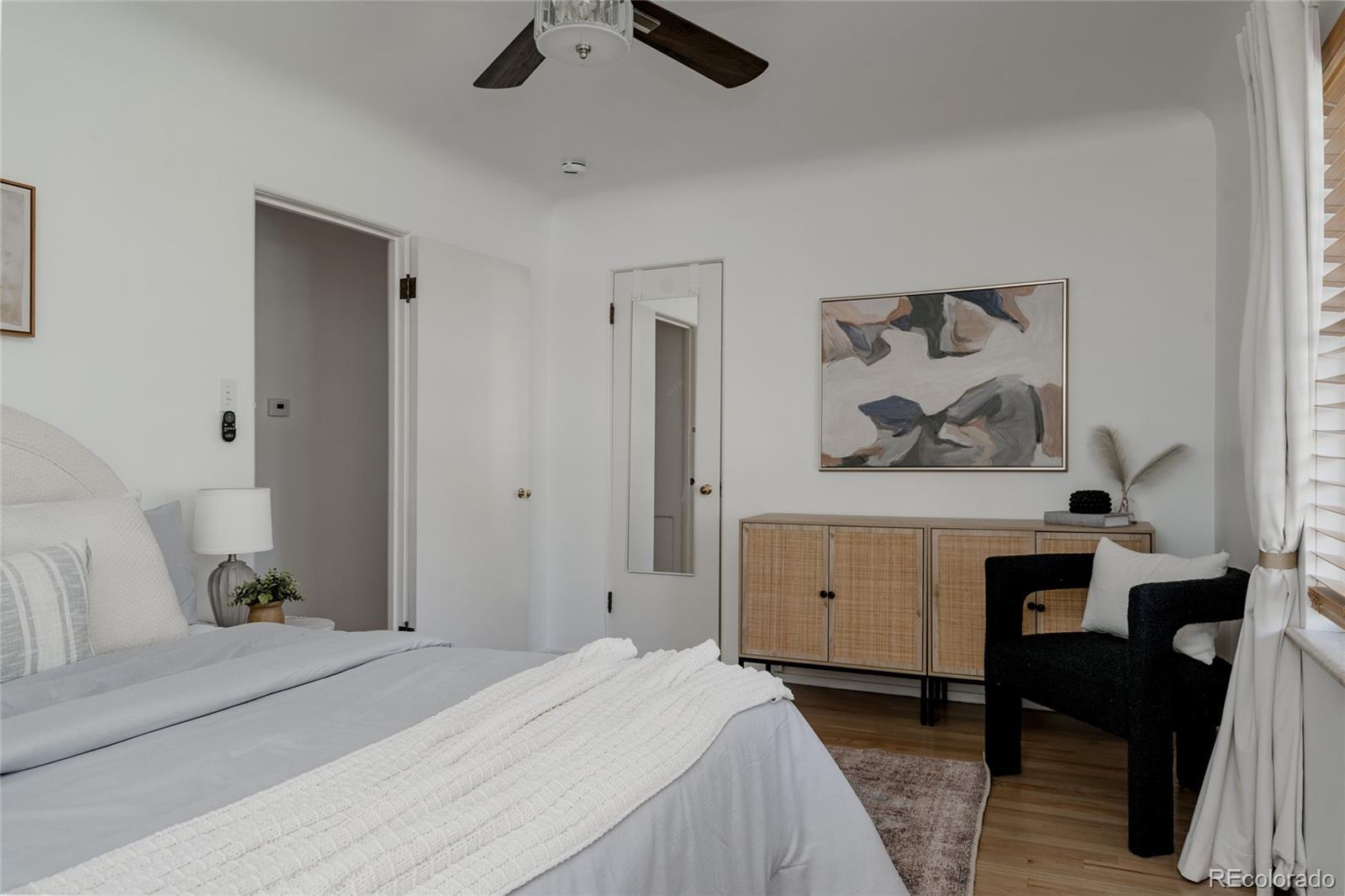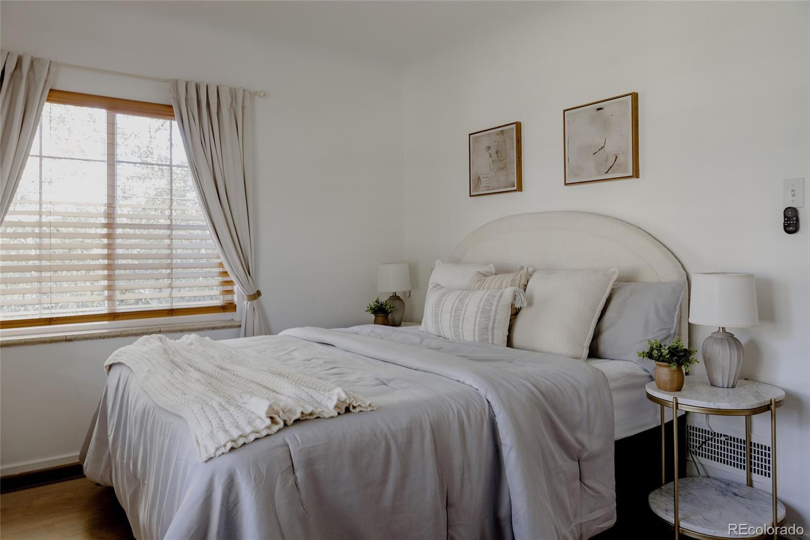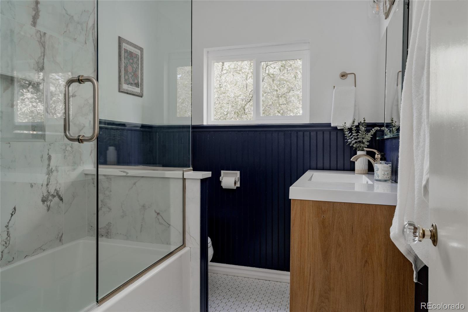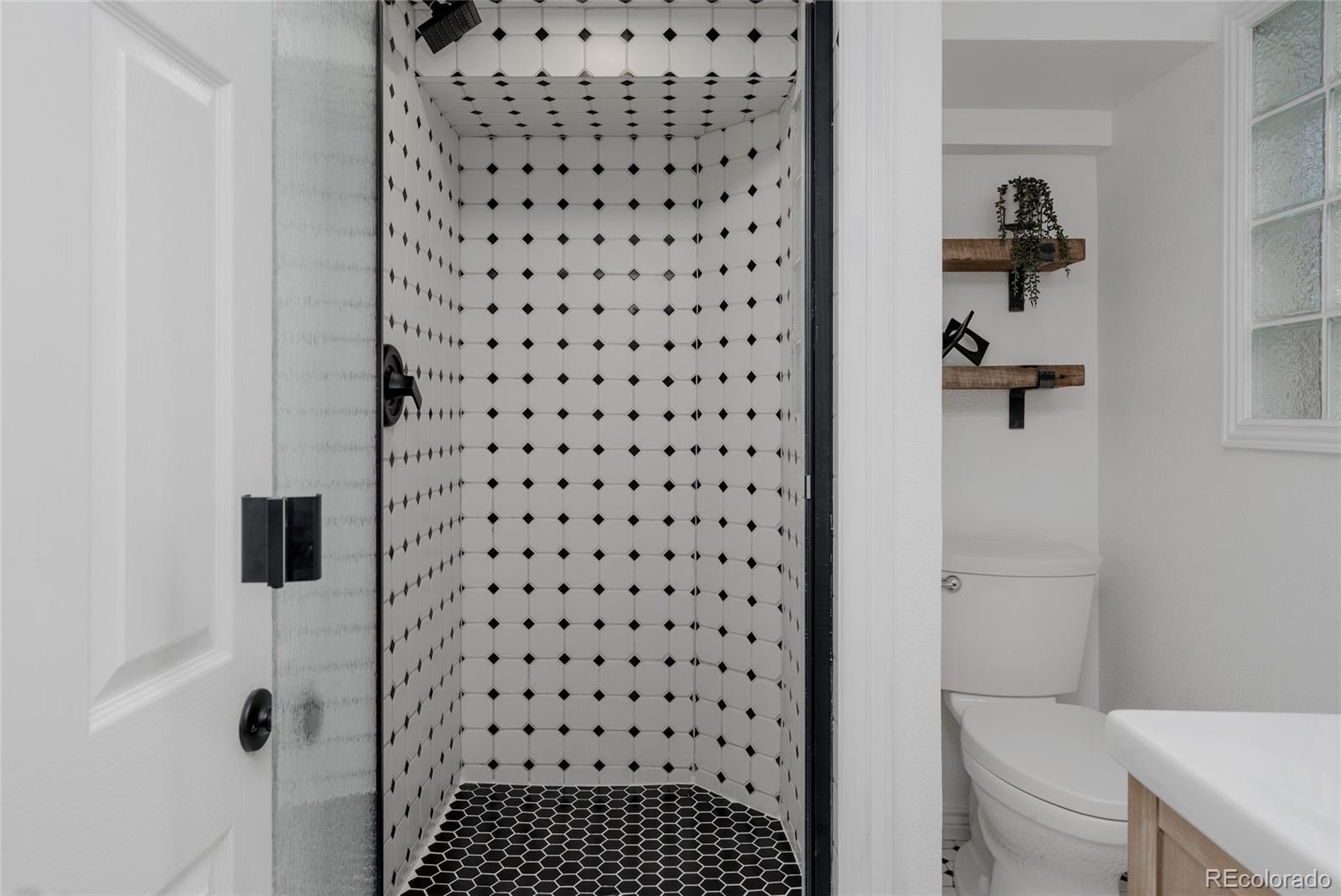 Model Home Origins. Mid-Mod Comfort. Half an Acre of Possibility. Thought to be the original model home for Lakewood Heights, this thoughtfully updated 1938 ranch blends historic charm with modern livability on a half-acre lot. From the chef-designed kitchen to the mid-century inspired lower level, every detail has been curated with comfort and function in mind. Step inside to find coved ceilings, refinished oak floors, two large wood burning fireplaces, and expansive windows that flood the home with light. The recent kitchen renovation features quartz countertops, Shiloh soft-close cabinetry, a GE Profile induction range, and a Samsung Bespoke fridge, and wine fridge all designed for serious cooking and daily enjoyment. The finished basement offers a spacious second living area, office, or gym flex space, and a non-conforming bedroom with great natural light, all surrounded by vintage knotty pine paneling that adds a subtle mid-century modern edge. Outside, you’ll find room to grow, gather, or garden: a generous 0.49-acre lot with ditch rights, secluded firepit area, and mature trees. Whether your vision includes urban homesteading, pets, pollinators, or play, this land is your blank canvas. Located in Lakewood’s historic Eiber neighborhood, once home to orchards, farms, and gardens, this area has retained its sub-rural charm with larger lots, mature trees, and a true sense of community. The home is less than a mile, or about a 10-minute walk, from two W Line light rail stations, offering a quick downtown commute while keeping you grounded in a neighborhood with local charm. Updates include: brand new sewer line, refinished oak floors, brand new paint, full kitchen remodel including cabinets, countertops, appliances, fully renovated primary bathroom, and landscaping. Enjoy easy access to Gold’s Marketplace, Belmar, Colorado Mills, parks, breweries, coffee shops, I-70, and everything West Denver has to offer. Welcome home!