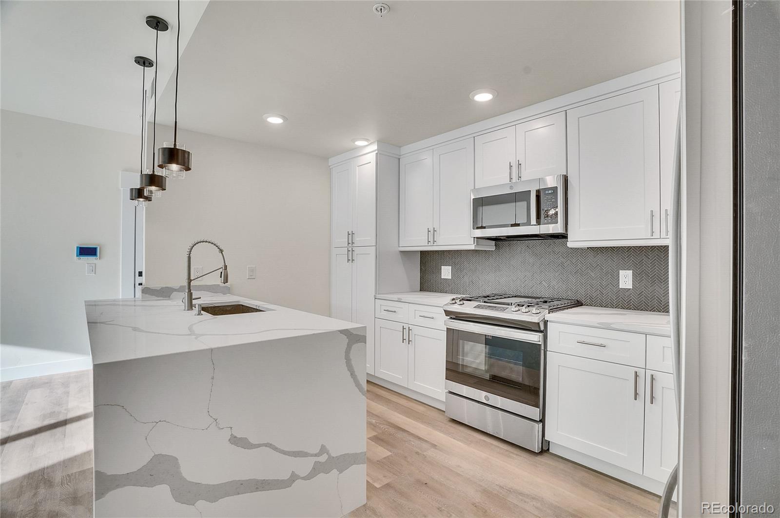 LAST NEW UNIT ON FIRST FLOOR! Experience luxury living in this beautifully appointed first-floor luxury condo, where sophisticated design meets exceptional craftsmanship. Built to exacting standards, this elegant home offers a spacious, open-concept layout enhanced by high-end designer finishes throughout. The gourmet kitchen is a chef’s dream, featuring all stainless steel appliances, a gas range, custom tile backsplash, under-cabinet lighting, quartz countertops with a striking waterfall edge, a pantry, and custom cabinetry—ideal for everyday living and entertaining alike. The primary suite is a peaceful retreat, complete with ample closet space and built-in shelving. The luxurious four-piece bathroom includes a mosaic, curb-less walk-in shower, dual sinks, and sleek porcelain tile. Step outside and enjoy Colorado’s natural beauty with nearby walking trails, Hecla Lake Open Space, and Waneka Lake Park—all offering scenic mountain views and outdoor recreation. Additional features include a private covered carport, guest parking, and a fully covered 10x8 patio—perfect for enjoying your morning coffee. Don't miss your chance to own this thoughtfully designed home just minutes from Boulder and downtown Lafayette. (Note: Some photos are from a model unit.)