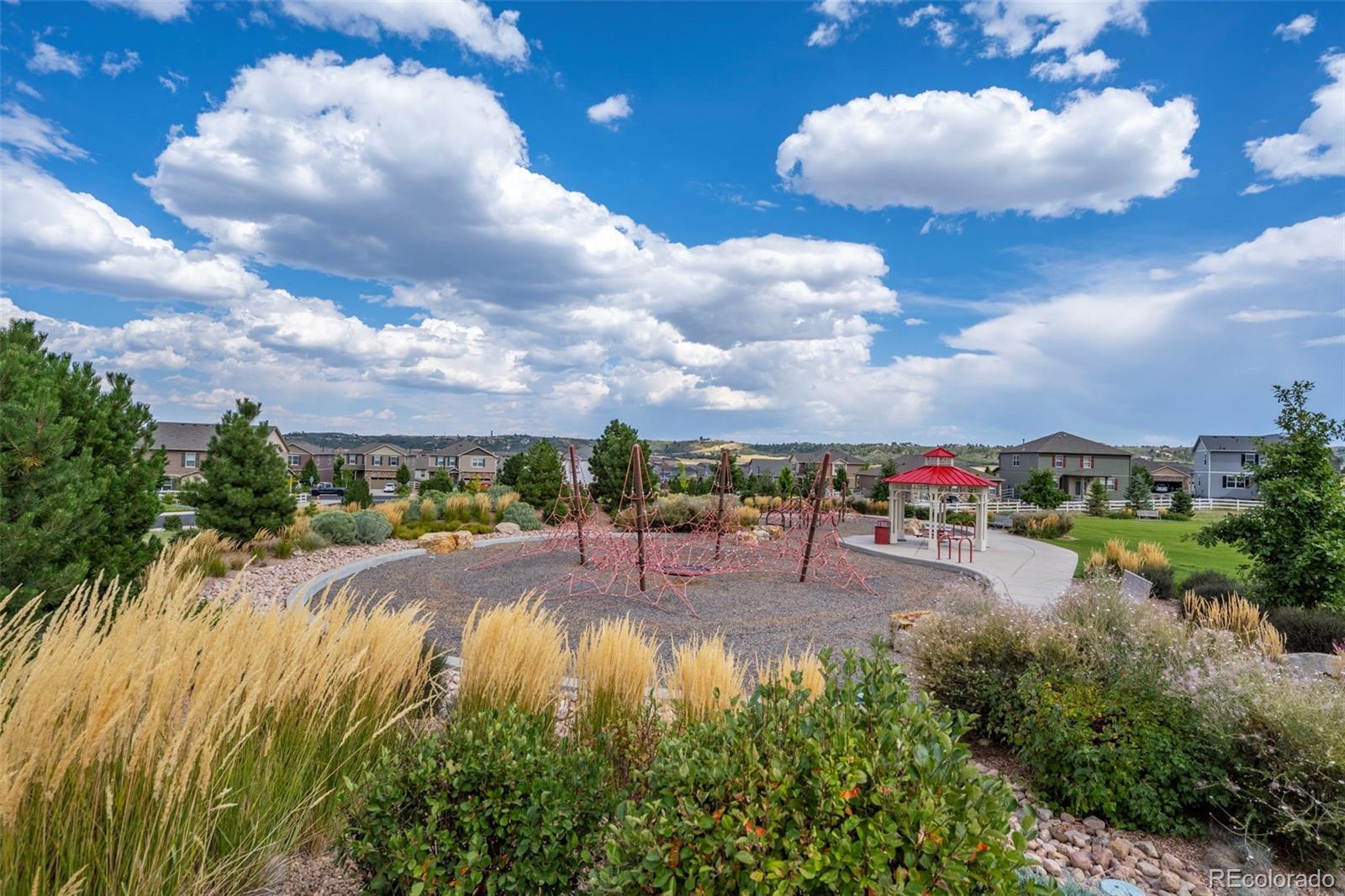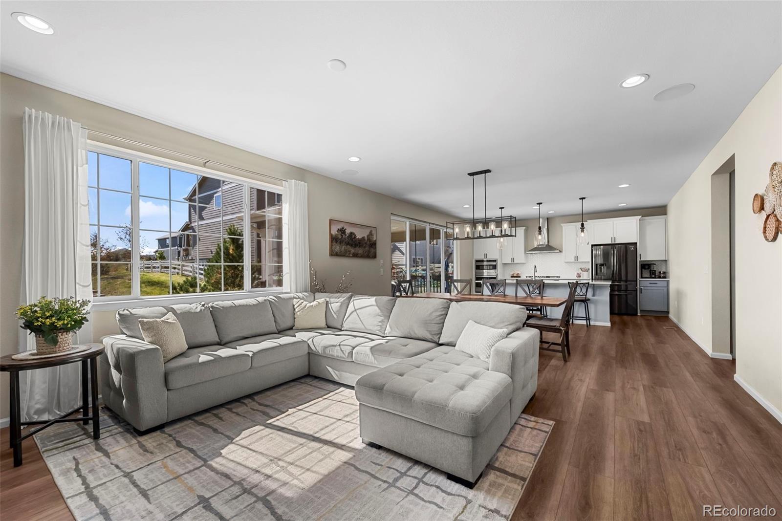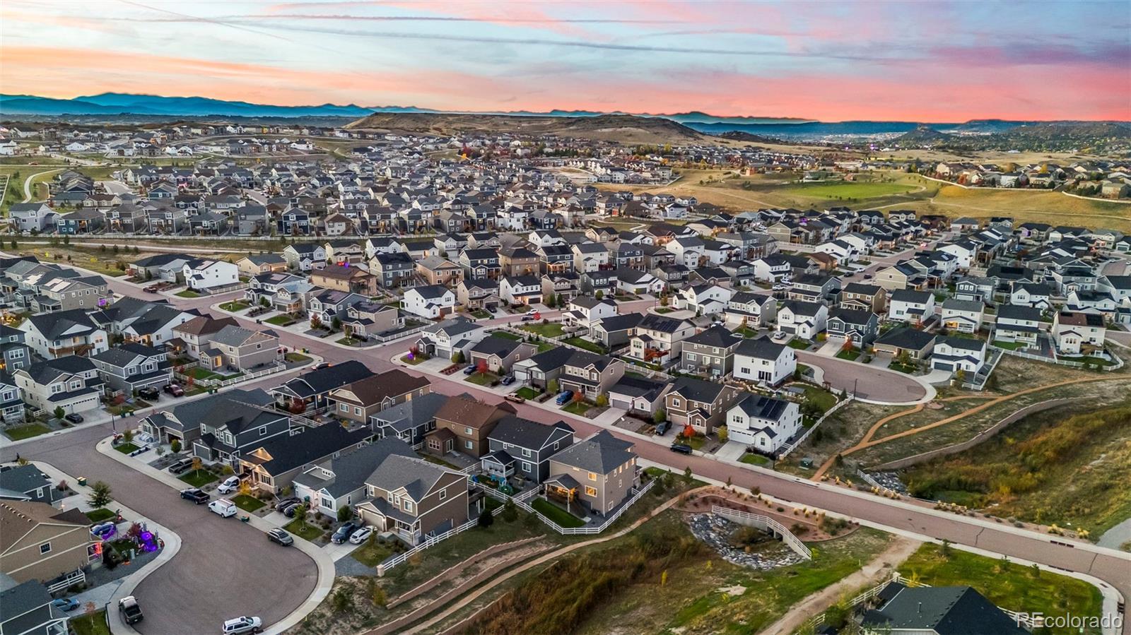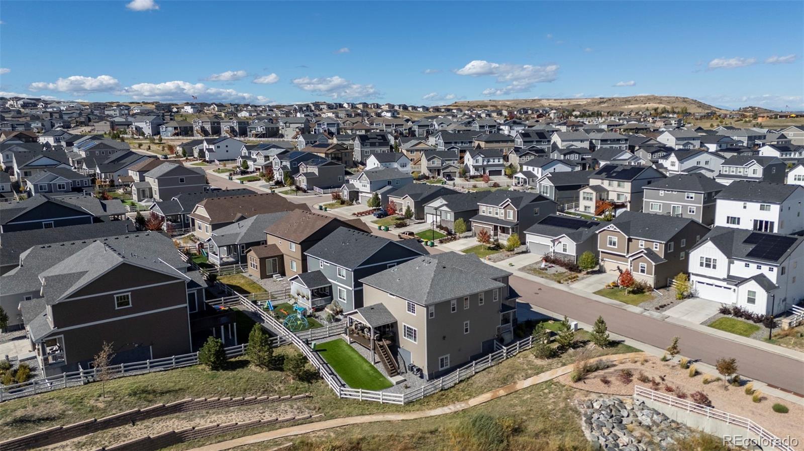 Stunning 5-bedroom on the perfect lot featuring updates, open space along the side of the house, and a spacious 3-car garage! Step inside and be greeted by soaring ceilings leading to the bright, open great room, featuring a show-stopping accent wall and gas fireplace. The gourmet eat-in kitchen boasts custom pendant lighting, a large center island, quartz countertops, double convection ovens, a gas cooktop, and access to the covered deck—perfect for entertaining. An office with French doors offers a private workspace, and a powder room on the main level adds convenience. Upstairs, a large loft provides additional living space, while the primary suite features an en suite spa-inspired bathroom with dual shower heads, dual sinks, quartz counters, and LVP flooring. Three additional bedrooms, a bathroom, and conveniently located upper-level laundry complete the upper level. The basement includes a media/recreation room with a wet bar, a fifth bedroom, and another bathroom with quartz counters, LVP flooring, and a walk-in shower. Enjoy the convenience of a spacious 3-car garage equipped with an EV charging station providing ample storage. Outside, you'll find fully fenced, low-maintenance xeriscaped backyard, a covered deck, and open space with no neighbors on one side for privacy and a sense of tranquility. This location provides shopping, dining, trails, neighborhood parks, and access to the Crystal Valley Ranch recreation center—including pool and fitness center—and easy commuting via I-25 to Colorado Springs or Denver. Don't miss this stunning 5-bedroom on the perfect lot with thoughtful updates, open space, and a spacious 3-car garage!