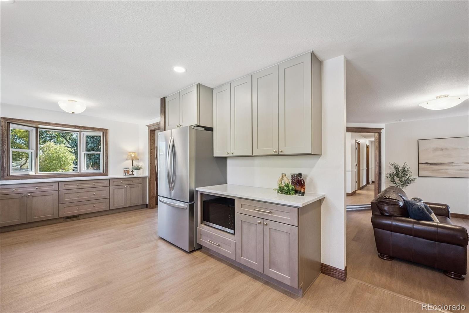 Welcome to this stunning Applewood remodel, masterfully reimagined with exceptional craftsmanship and Colorado style. Set on a 14,000+ sf corner lot in one of the area’s most established neighborhoods, this impeccably remodeled raised ranch offers over 3,750 square feet of curated living space. The expansive 5-bedroom, 3-bathroom layout has been thoughtfully redesigned for today's discerning homeowner. At the heart of the home lies a spectacular chef’s kitchen—an entertainer’s dream—featuring custom cabinetry, elegant quartz countertops, premium appliances, and brushed gold fixtures that add warmth and refinement. Three fully renovated bathrooms showcase designer tilework, custom cabinetry and quartz countertops, and frameless shower glass, including a luxe primary en suite. Every detail, from the solid hardwood doors to the hand-selected lighting and trim, speaks to quality and craftsmanship. The main level boasts new luxury vinyl plank flooring, while the expansive finished lower level—nearly 1,900 sq ft—features plush new carpeting and offers versatile living space ideal for a media lounge, game room, home gym, and guest suite. This level includes a generous Great Room, two spacious non-conforming bedrooms, a stylishly renovated bath, and large bonus/storage room. This floorplan offers multi-generational or house hacking opportunities. Outside, mature trees and professional landscaping frame a private backyard oasis with rock retaining walls and a secluded patio—perfect for alfresco dining or quiet evenings under the stars. Additional highlights include a new furnace, newer water heater and AC, newer roof, newer double pane windows and fence. Just steps from Lewis Meadows Park and scenic walking trails, and moments from the new Lutheran Medical Center and incoming Clear Creek Crossing shopping, dining, and entertainment options. This is a rare opportunity to own a refined, turn-key home in one of Applewood’s most desirable enclaves.