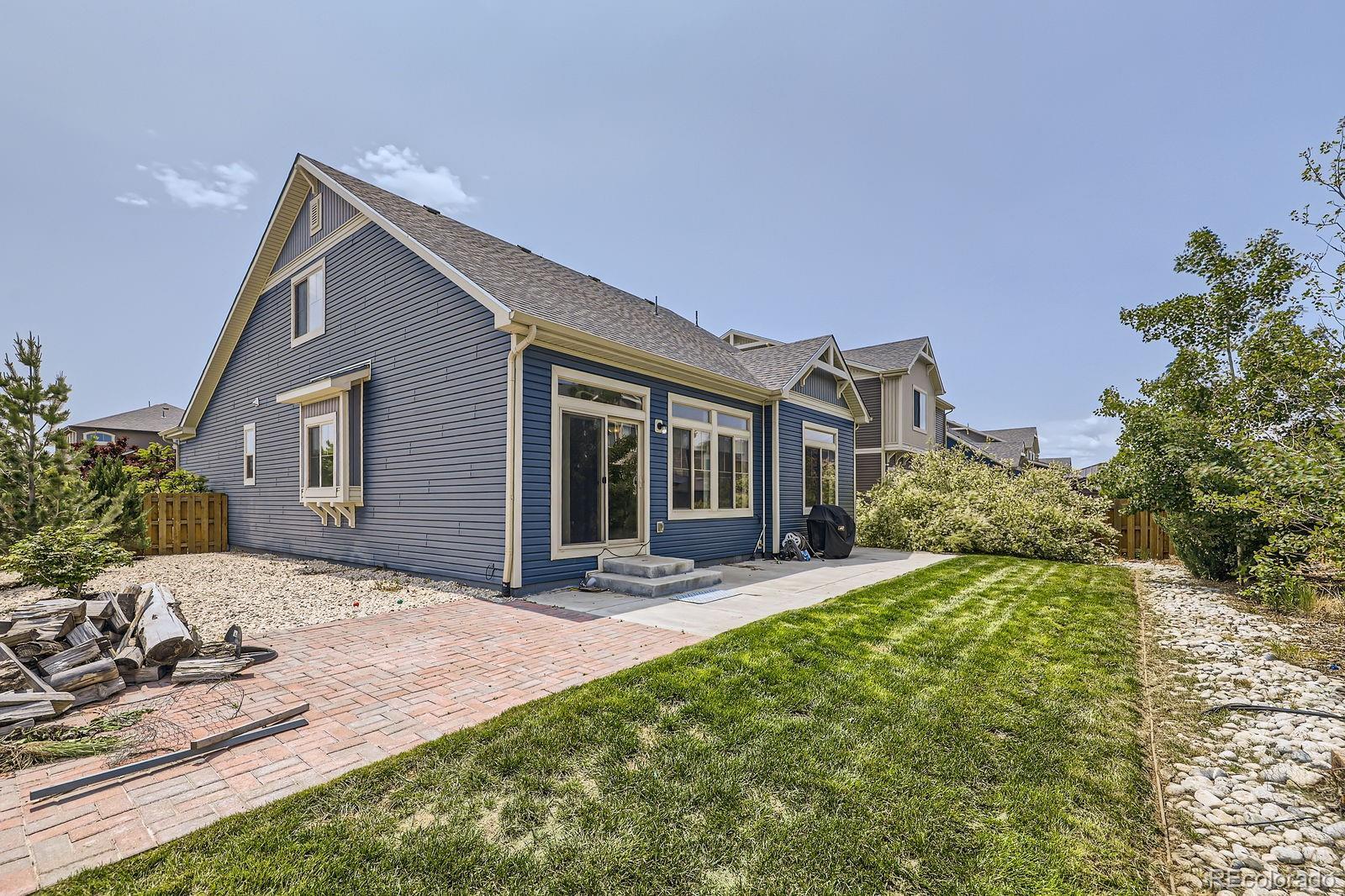 Welcome to this beautiful, newer 3-bedroom, 3-bath home in Turnberry Meadows that is truly move-in ready. Situated on a desirable corner lot, the property features a landscaped yard, raised garden bed, and an oversized patio—perfect for relaxing or entertaining. The home offers convenient main-level living with a spacious primary suite featuring abundant natural light, a walk-in closet, and a custom shower, plus a second main-level bedroom and full bath ideal for guests or a home office. The bright main living area showcases hardwood floors and an open-concept layout that flows seamlessly into the kitchen, complete with a large island, stainless steel appliances, and a walk-in pantry, along with main-floor laundry for added convenience. Upstairs, enjoy an expansive loft, a third bedroom, and a full bathroom, providing flexible living and workspace options. A very large unfinished basement with 9-foot ceilings offers excellent potential for future expansion or storage. Energy-efficient upgrades include solar panels and a hardwired EV charger. Located near neighborhood parks, a community pool, Bison Ridge Recreation Center, shopping, dining, schools, and major commuter routes, this home combines comfort, functionality, and location.