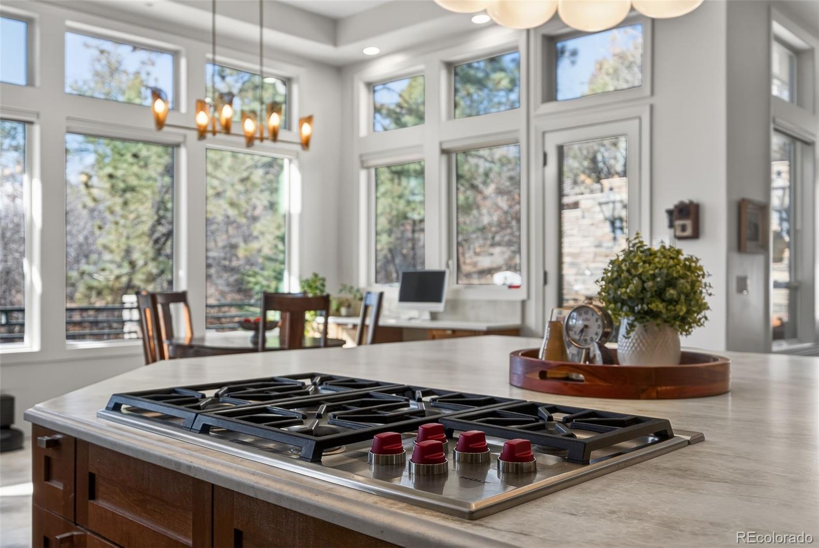 Tucked behind the gates of prestigious Castle Pines Village, this exceptional 5-bedroom, 6-bath residence sits on nearly an acre, offering privacy, sweeping views, and a lifestyle defined by elegance and ease. Designed for both refined entertaining and everyday comfort, the home blends timeless architecture with remarkable indoor-outdoor living. A dramatic wall of windows anchors the gorgeous living room, filling the space with natural light and framing the surrounding landscape. The formal dining room, complete with its own bar, sets the stage for memorable gatherings, while the expansive kitchen serves as the heart of the home with a generous island, high-end appliances, warm wood cabinetry, and seamless flow into the inviting family room with fireplace, wet bar, and temperature-controlled wine room. Outdoor living is exceptional. A composite deck and flagstone terrace extend into the landscape, featuring a built-in outdoor kitchen and stone gas fireplace, perfect for entertaining or quiet evenings under Colorado skies. The main-floor primary suite is a true sanctuary, offering beautiful views, a double-sided fireplace, spa-inspired bath, and custom walk-in closet. A secondary en-suite bedroom provides ideal flexibility for guests or a private office. A spacious laundry and mudroom connect to the oversized three-car garage. The walkout lower level is designed for both relaxation and recreation, featuring three additional bedrooms, three baths including a steam shower, a media room with fireplace, game room or gym, wet bar, and direct access to a third outdoor living area with fire pit and flat grassy yard. Life in Castle Pines Village offers a rare blend of privacy and connection, with 24-hour gated security, championship golf, pools, fitness center, tennis and pickleball, and miles of scenic trails. Colorado living at its most refined - private, scenic, and truly exceptional.