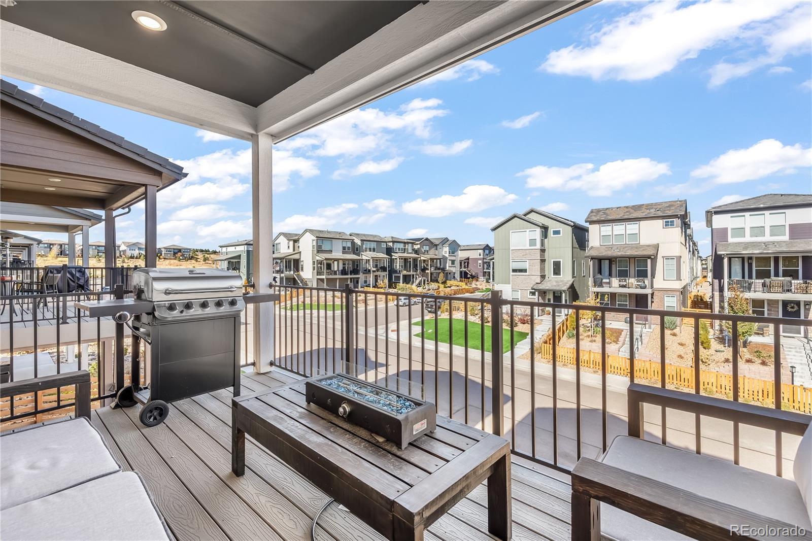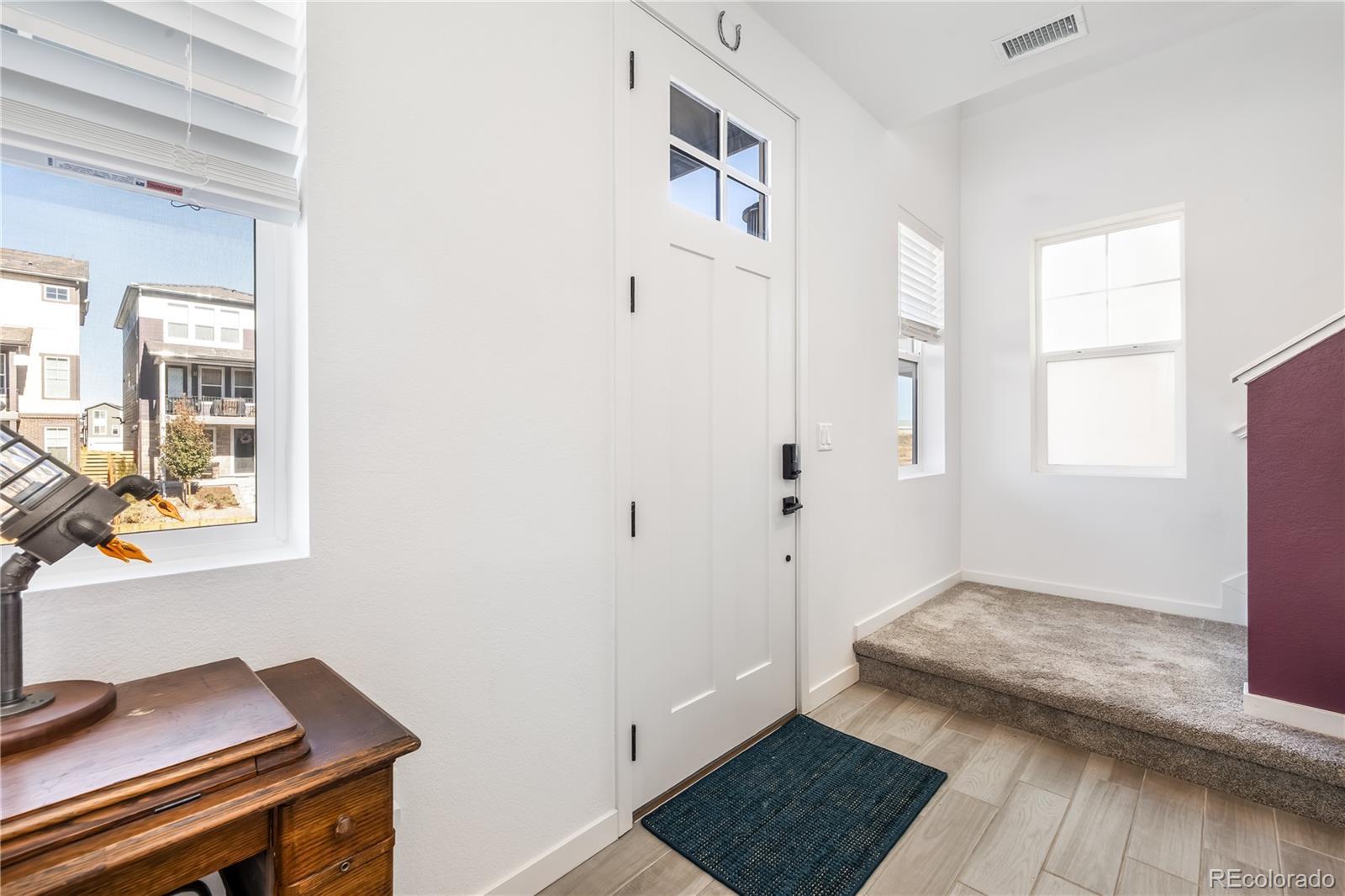 Located in the Stepping Stone community, this home features an open main level with a kitchen offering quartz countertops, large island, stainless steel appliances - including gas range and microwave, and a walk-in pantry. Open Dining area and family room with gas fireplace and access to the composite covered deck. Tile entry, front patio, and convenient main level 1/2 bath. Upstairs includes the primary suite with walk-in closet and 3/4 bath with custom shower, plus two additional bedrooms, full hall bath, and laundry room. Washer and dryer included. Additional features: Solar, high-efficiency furnace with zone comfort control, 50-gallon water heater, central A/C, ceiling fans, Hunter Douglas blinds, and whole-house low-voltage wiring panel to all bedrooms and TV locations. Fiber internet connections, smart lights throughout, Xeriscape yard. Exterior includes tile roof and brick/siding construction. 3-car tandem garage with EV outlet and opener. Community amenities include parks, playgrounds, dog park, and easy access to nearby trails