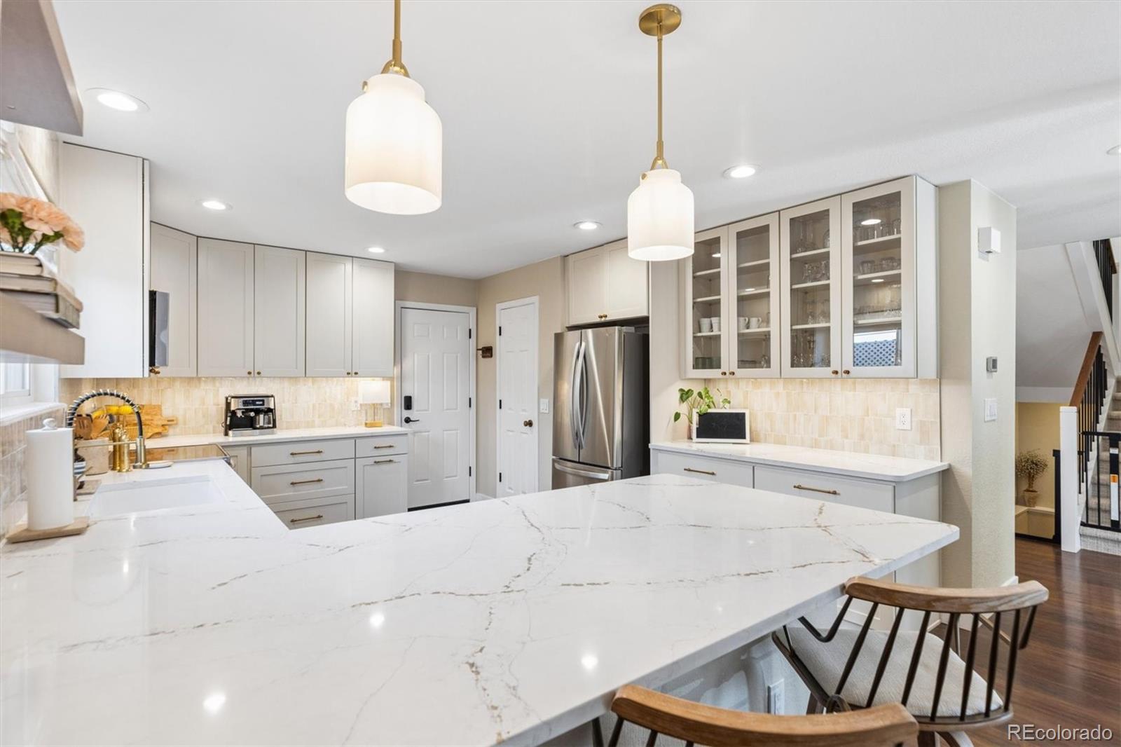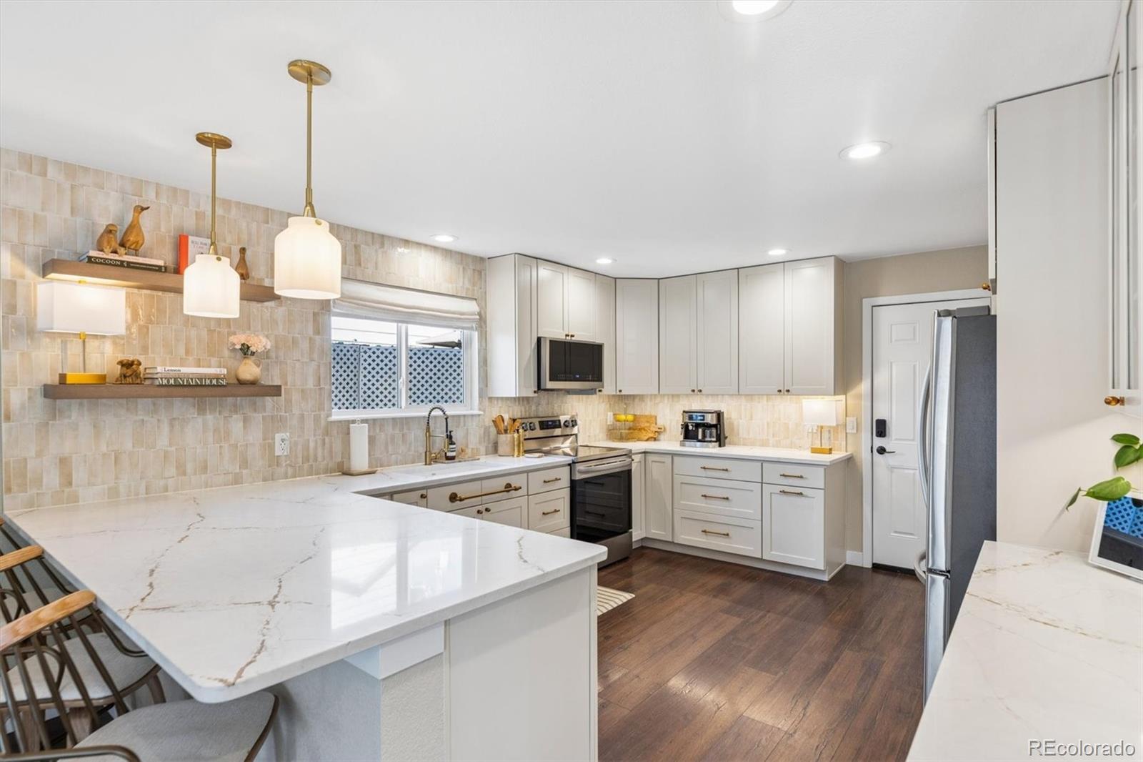 Don’t miss your chance to own this beautifully updated 3-bedroom, 3-bath home in the heart of Littleton’s highly sought-after Sherman Park neighborhood. This stunning residence features a brand-new, full kitchen remodel with all-new appliances, along with a new furnace and A/C, new carpet, new main-level flooring, an updated staircase railing, and a new garage door opener. The open-concept main level is flooded with natural light and designed for effortless living and entertaining, with a spacious dining area and double doors that open to a private, fenced backyard patio - the perfect space for relaxing or hosting gatherings. The full kitchen remodel features brand new quartz countertops, custom cabinetry, oversized sink, brass faucet and ample storage space. Upstairs, the versatile three-bedroom layout offers flexibility for space for bedrooms, home office, nursery, or guest room. The oversized primary suite is a true retreat, currently set as the home office, complete with a private balcony, a beautifully maintained bathroom with a subway tile walk-in shower and a generous walk-in closet. The finished basement adds even more functionality with a home gym area, laundry space, ample storage, and convenient access to the home's mechanics. Easily walk and enjoy nearby greenbelts and open green space just steps from your door, plus the convenient location only minutes from Downtown Littleton’s restaurants, shops, parks, and trails. This is a rare opportunity to own a turnkey home in a location that truly offers the best of Littleton living. Welcome home!