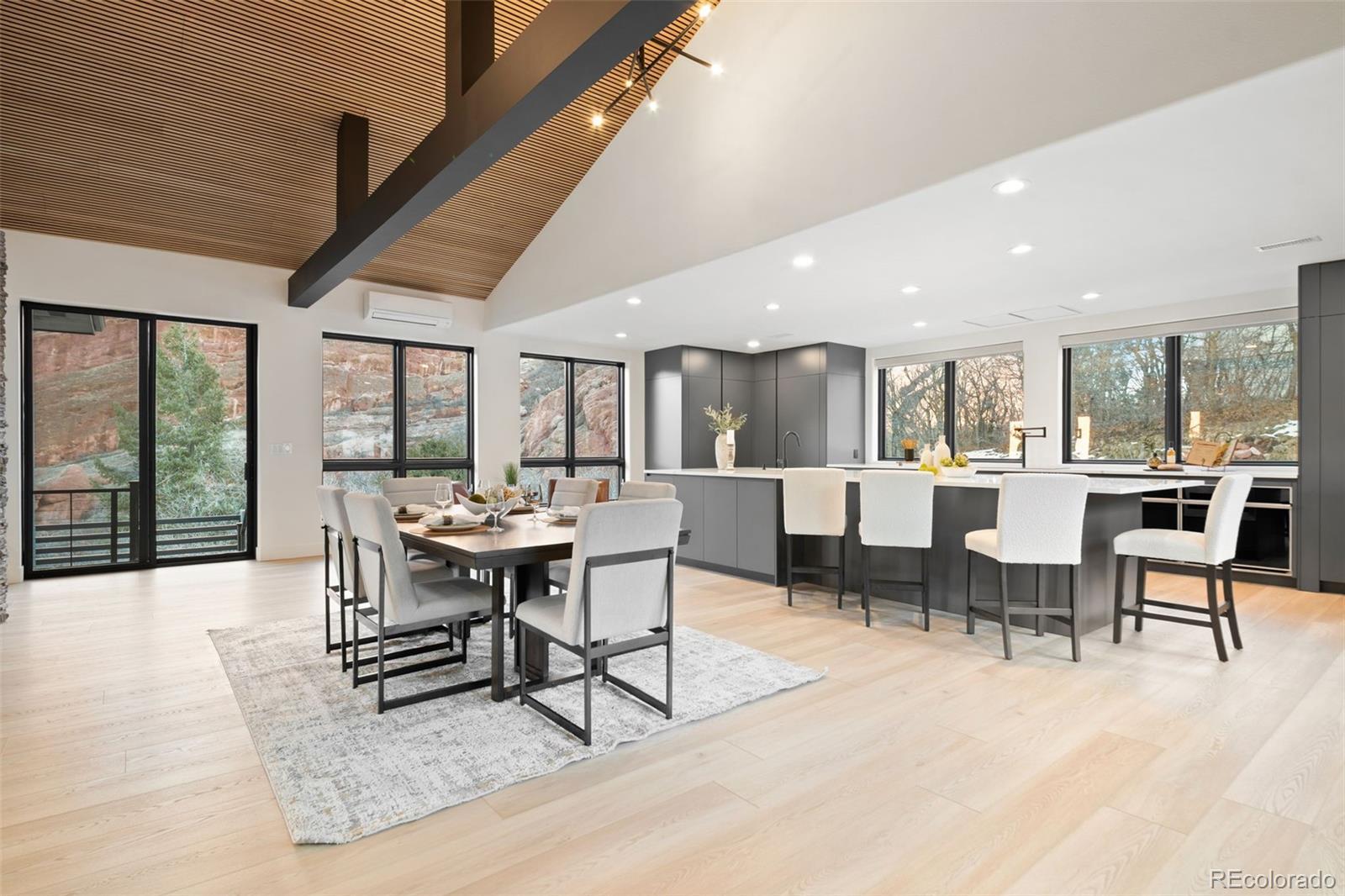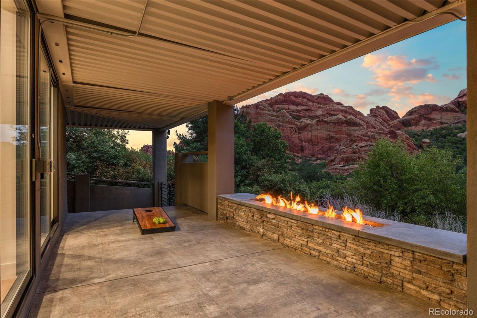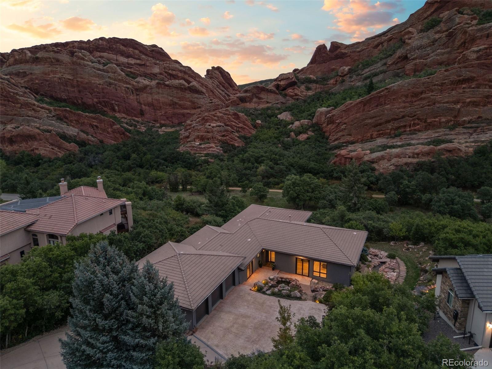 Wake up each morning surrounded by the iconic red rock formations and protected open space of Roxborough Park. This mountain modern residence has been fully remodeled from 2022–2024, with no corner left untouched and every finish selected to the highest standard. Thoughtfully reimagined from top to bottom, the home offers a refined balance of architectural drama, modern efficiency, and connection to nature. Walls of glass and expansive decks frame views of Pike National Forest and Roxborough State Park, while vaulted ceilings and a striking four-sided fireplace anchor the main living spaces. The chef’s kitchen is both bold and functional, featuring a statement 14-foot island, induction cooking with concealed venting, integrated appliances, pot filler, full-height pantry walls, and a beverage center with wine storage and built-in espresso. The walkout lower level continues the elevated design with a temperature-controlled wine cellar, coffered ceilings, and a designer wet bar. Spa-inspired baths, radiant in-floor heating throughout (including the oversized garage with EV charging), thermal-break windows and doors, heated driveway, cascading water feature, and resort-style fire pit complete this exceptional offering. Comparable in quality to the estates of Ravenna yet offered at a more approachable value, this home delivers a rare Roxborough lifestyle—luxury living with immediate access to miles of trails and unforgettable Colorado scenery.