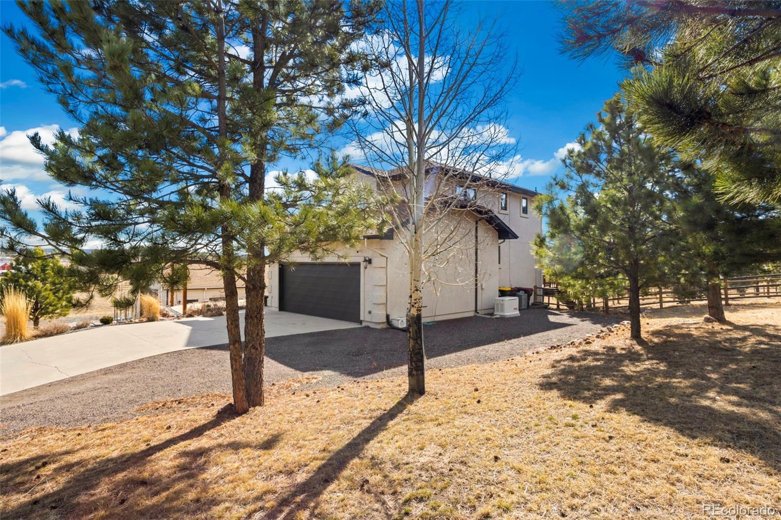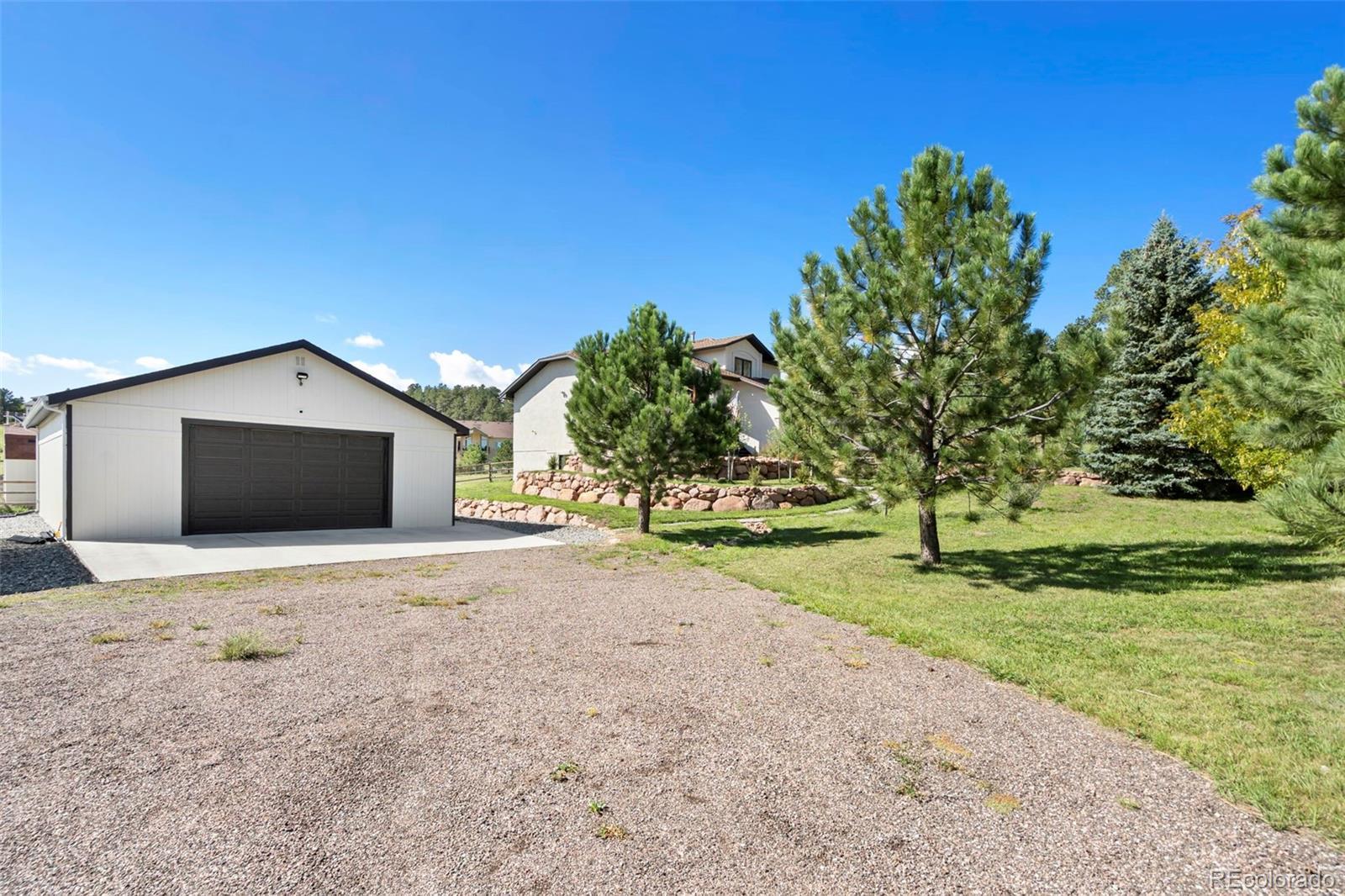 Discover this beautiful home in a quiet D38 west side neighborhood, nestled minutes from Mount Herman & on the edge of Pike National Forest. This unique offering encompasses 2 lots, totaling nearly 2 acres. One lot features a residence complete with a newly constructed heated detached garage and the adjacent lot to the east. Easy access to nearby trails & shopping—truly a blend of nature & urban living! The home has seen several recent enhancements, including exterior paint & gutters, and landscaped front yard showcasing a spacious flagstone patio. A newly installed generator ensures that comfort features like the newer A/C and furnace are always ready. A highlight of this property is the recently built detached garage, designed to accommodate at least 4 vehicles. It boasts excellent insulation, drywall & paint, heating, and a roomy workbench area equipped with many storage cabinets. Both lots are securely fenced and features two beautiful metal gates, easily operated via remote control or a smartphone app. Inside, you will find new fresh interior paint & carpeting. The kitchen is designed with granite countertops, slow-close cabinet drawers, and a gas range, alongside newer dishwasher & refrigerator. A gas fireplace & mantle in the front living room add a welcoming touch with hardwood flooring throughout the main level. On the upper floor, the master suite includes a walk-in closet, accompanied by 2 add'l bedrooms. The basement offers a spacious recreation room, a bedroom, and a flexible area suitable for various uses, along with a full bathroom, providing ample space for relaxation, privacy, and entertainment. Also newer washer & dryer included. The oversized back deck grants access to the gently sloping, usable lots. High-speed internet service is available on this street. This property is in the ideal location, 30 min south of Denver and a 10 min to the north side of Colorado Springs, perfectly embodying the essence of Colorado living at its best!