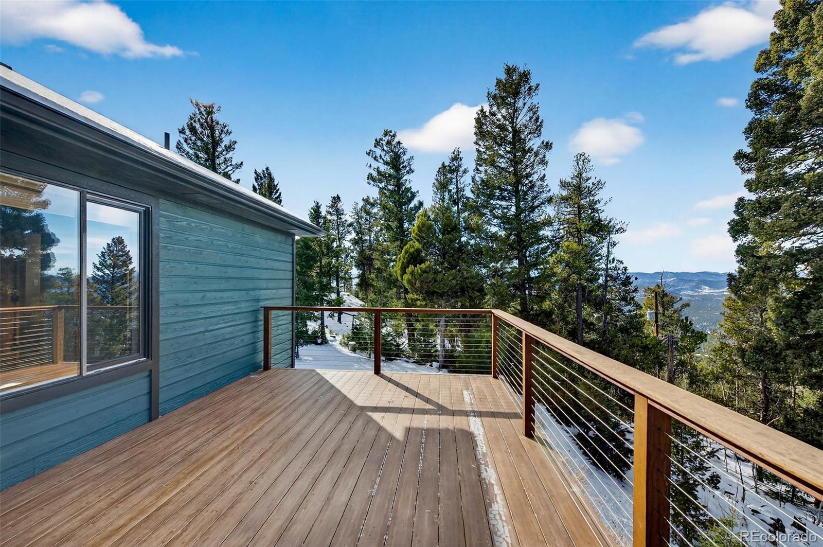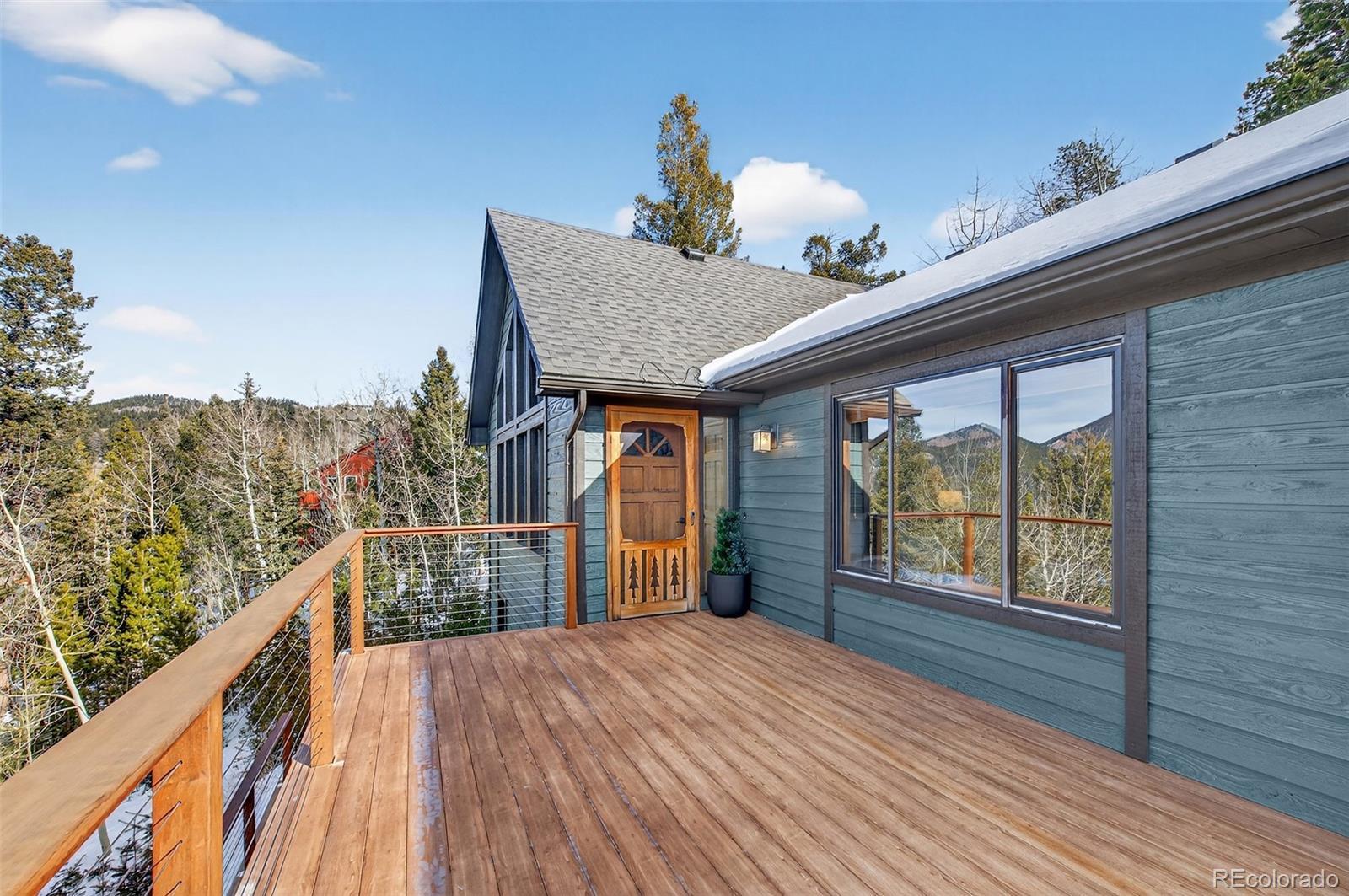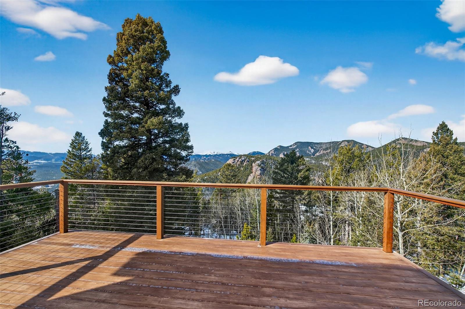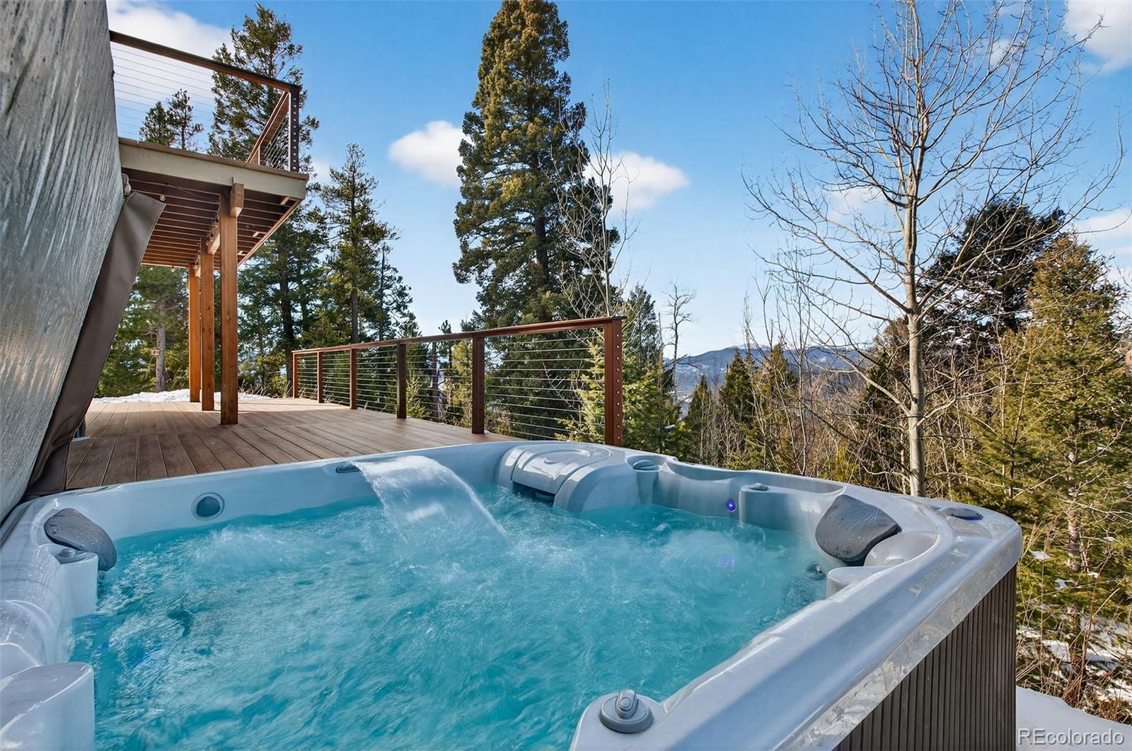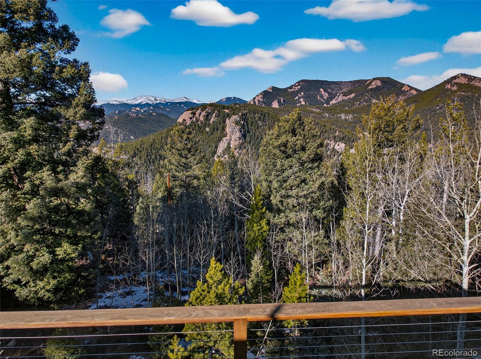 Experience Colorado living at its finest in this stunning 3-bedroom, 3-bath home offering 2,126 square feet of beautifully updated living space on a private half-acre lot. Unobstructed views of two Colorado 14ers and Staunton State Park from the great room and primary suite. Expansive windows flood the home with natural light. The recently updated kitchen features quartz countertops, stainless steel appliances, and modern finishes, perfect for both everyday living and entertaining. A new roof installed in 2025 provides peace of mind. Outdoor living is exceptional with a covered patio, spacious east-facing deck ideal for morning coffee, and a second deck for gathering with friends while enjoying unforgettable sunsets over Mt. Blue Sky (Mt Evans). Relax in the private hot tub with sweeping views of Mount Bierstadt, surrounded by tranquility and privacy. Tucked away in a serene setting, this home offers remarkable privacy, iconic views, and a true mountain lifestyle—an exceptional opportunity in Kings Valley.