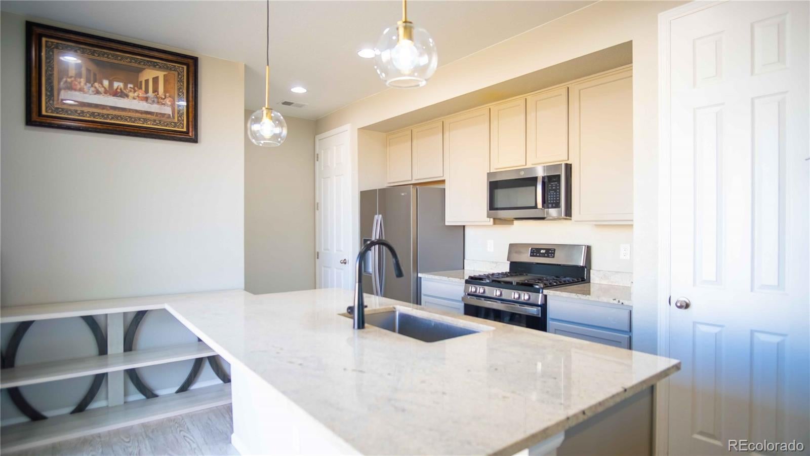 Situated on a prime corner lot in the sought-after Karls Farm neighborhood, this contemporary residence—built in 2022—offers a thoughtfully designed 3-bedroom, 3-bath layout with modern finishes and abundant natural light throughout. Backing to the Green Belt, the home combines privacy, functionality, and access to outdoor amenities. A well-planned open floorplan showcases high ceilings and large windows that enhance the bright, airy living spaces. The kitchen is designed for both everyday living and entertaining, featuring a large island with breakfast bar, open connection to the living area and outdoor space, and a dedicated pantry for added storage. The primary bedroom includes an en-suite bath and an extra-large closet, while two additional bedrooms share a full bath on the upper level. The laundry area is also conveniently located upstairs. Storage is a standout feature, with an abundance of storage space throughout, including a large main-floor storage closet and expansive storage beneath the home. Additional highlights include an attached two-car garage, a covered side patio offering privacy, and a covered front porch. The HOA maintains the grounds and landscaping and provides snow removal for both the sidewalk and driveway, a valuable benefit for this large corner lot. Located close to walking trails, the neighborhood park, and resident gardens, this home offers easy access to I-25, light rail, dining, and shopping. The well-maintained, contemporary Karls Farm community is known for its convenient location and vibrant atmosphere. Move-in ready and designed for modern living.