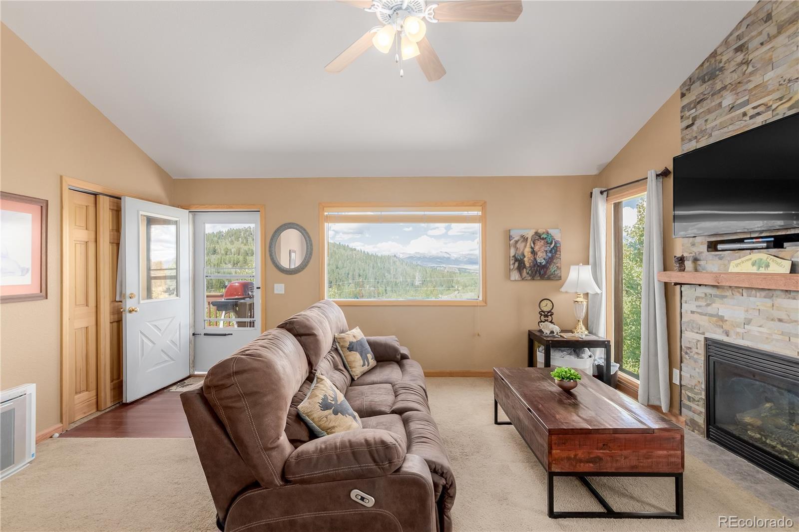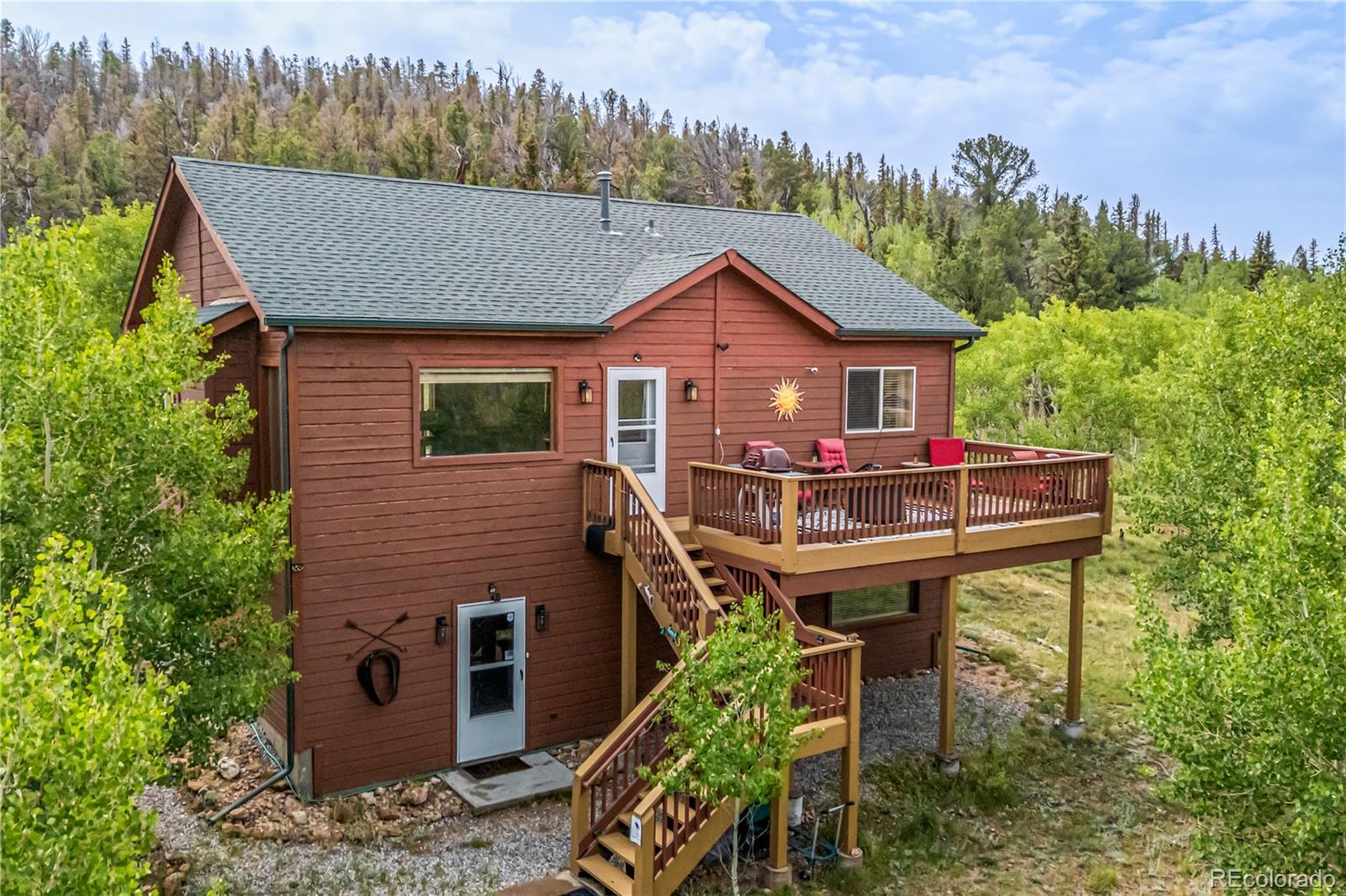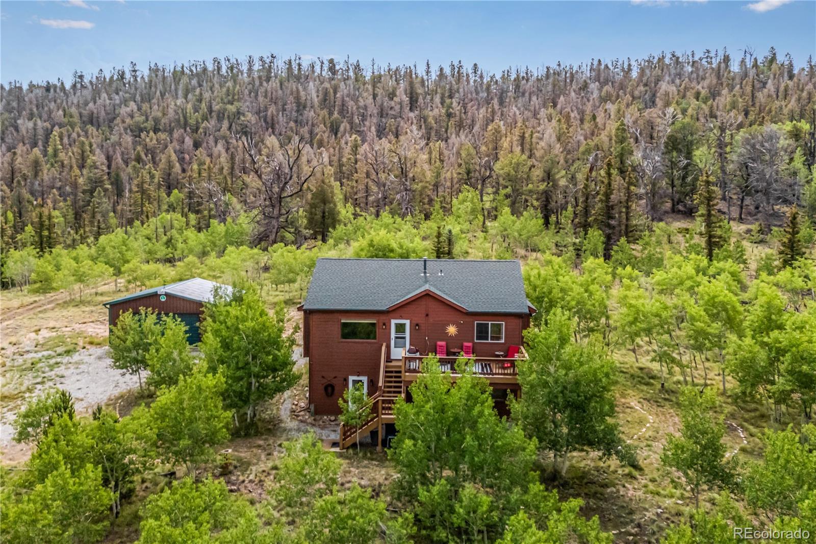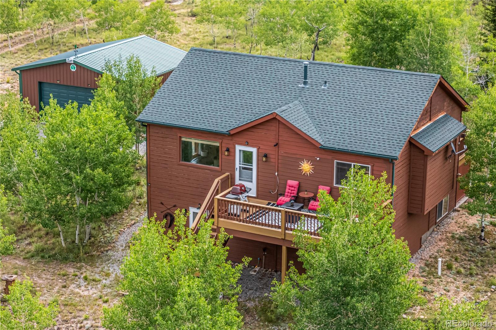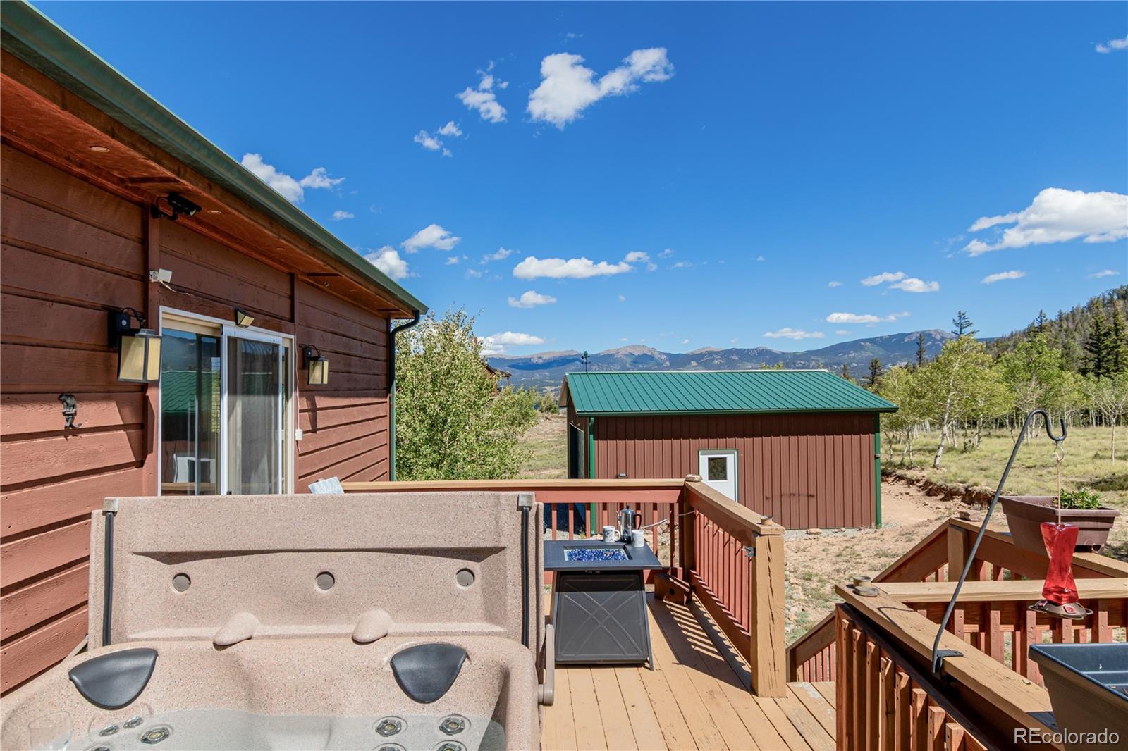 This is a one of a kind opportunity to own a unique furnished mountain home on 2 acres near National Forest access with fishing rights, Hot tub, Sauna, Gym, Furniture! This 2050sqft home has a main level that provides a front and rear deck with million dollar mountain views in every direction. The Hot Tub on rear deck offers privacy with a nature retreat! The living room has vaulted ceilings and a gas fireplace providing warmth, ample space, and more spectacular views. The open access to kitchen and dining make it great for entertaining. The kitchen features beautiful floors & cabinetry, stainless appliances, recessed lighting, and a center island perfect for conversation and casual dining. The propane central furnace will keep the house warm throughout the winter. Four spacious bedrooms provide flexibility and comfort, including two on the main level for everyday convenience and two more downstairs tucked away with their own bath and generous den with walk-out access. One room is currently set-up as a home gym with a sauna - included with the property! The Laundry/Utility room is downstairs providing an ideal placement for your washer/dryer. Step out to the back deck, and enjoy the hot tub, and multiple seating areas perfect for star filled nights, and deer watching. The property is filled with aspen trees, birds, and wildlife providing privacy and serene sounds of nature. Under the deck is storage with electric, and covered atv parking. The detached 2 car garage offers the perfect amount of space for a workshop, and truck parking. With 2 acres of usable land covered in aspen trees, and Pike National Forest + Taryall Reservoir nearby=The ultimate getaway. Stagestop fishing rights include access to Taryall Creek and community Ponds. This property is ready for full time use or an amazing vacation home. Mountain living at its finest! Well maintained 1 owner home. Onsite: Propane, Electric, Well, Septic, Trees. Turn Key. County maintained roads. 1HR to Breckenridge.