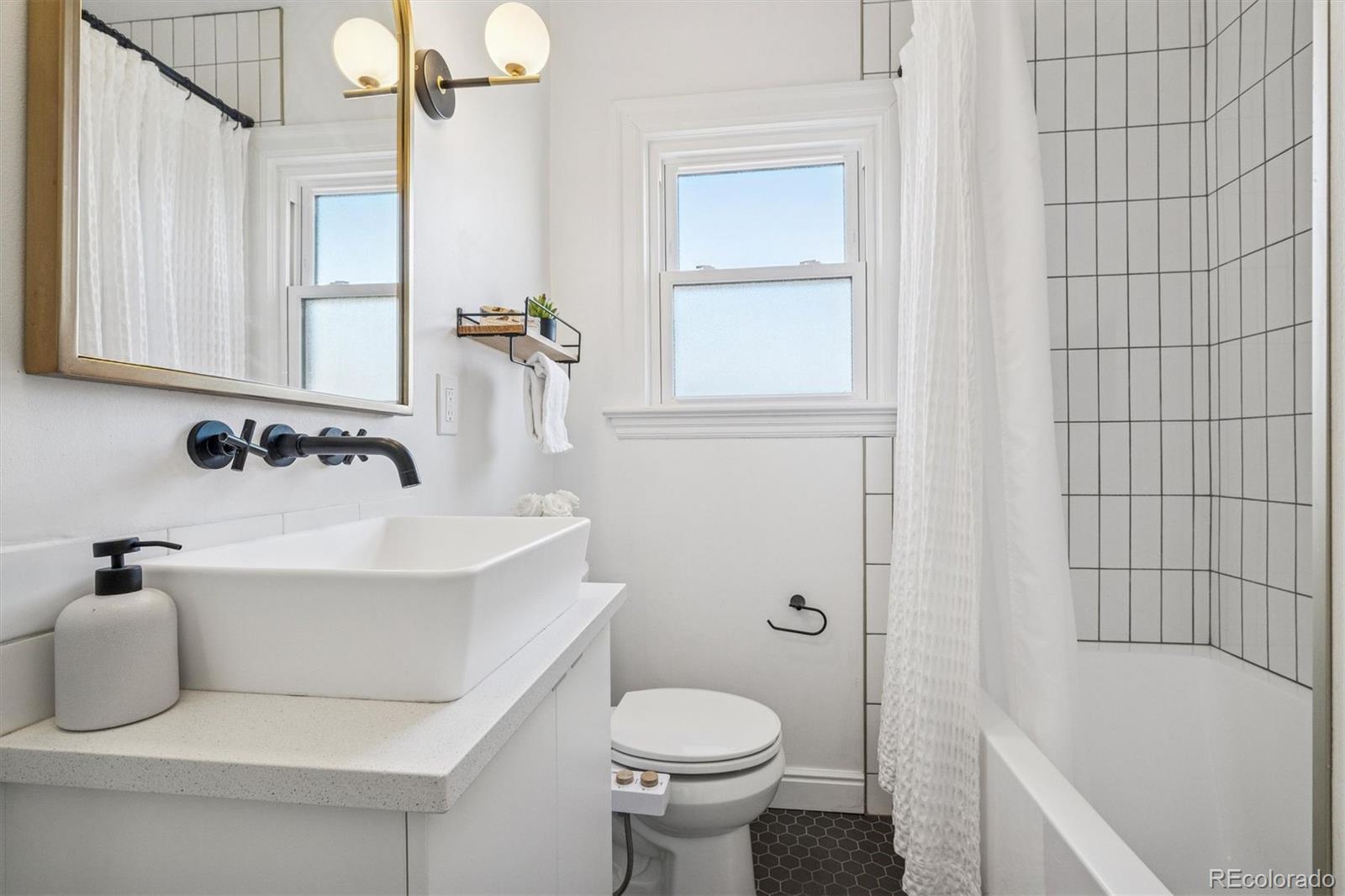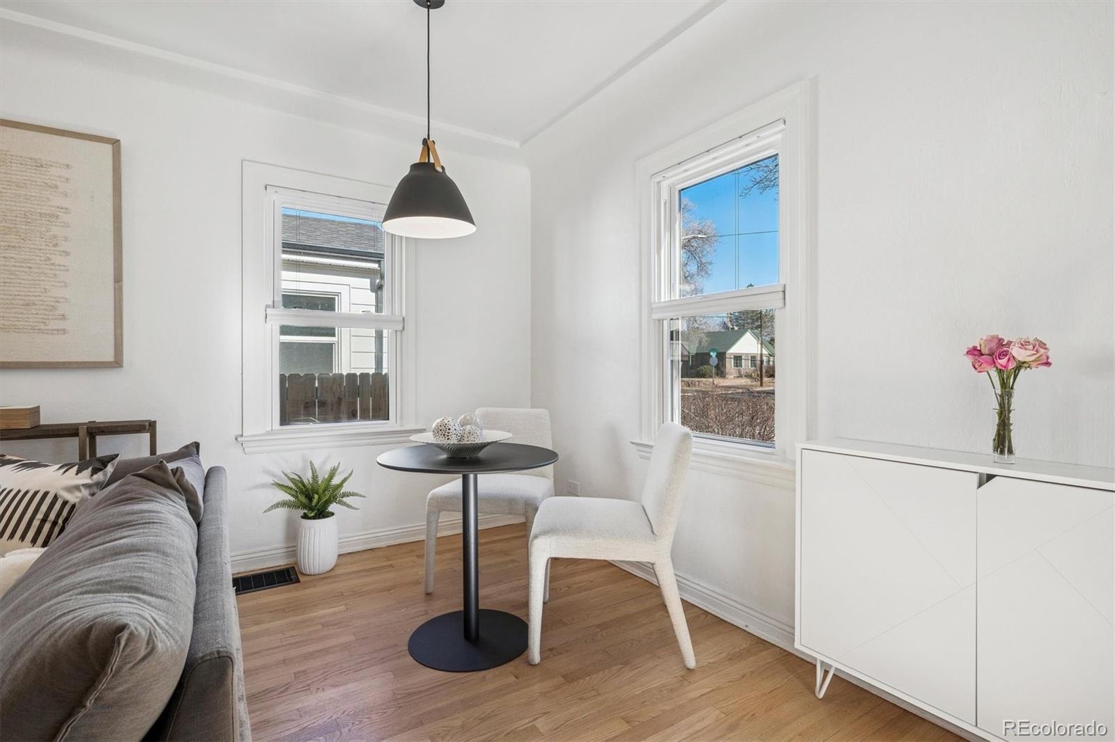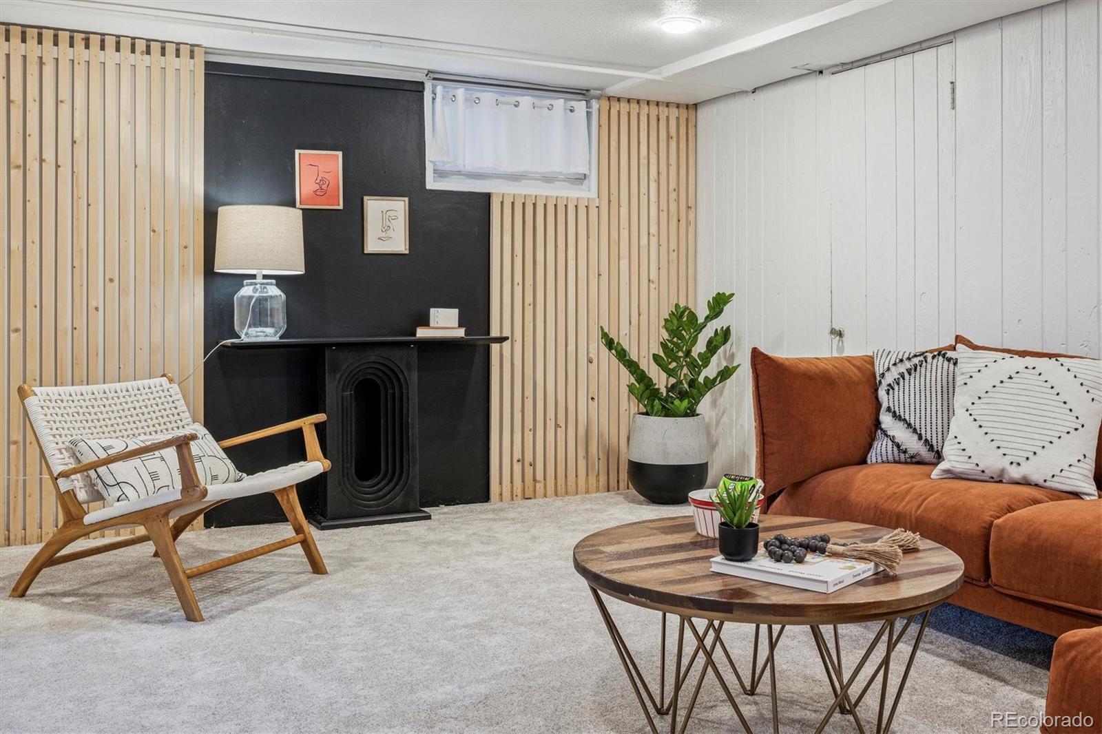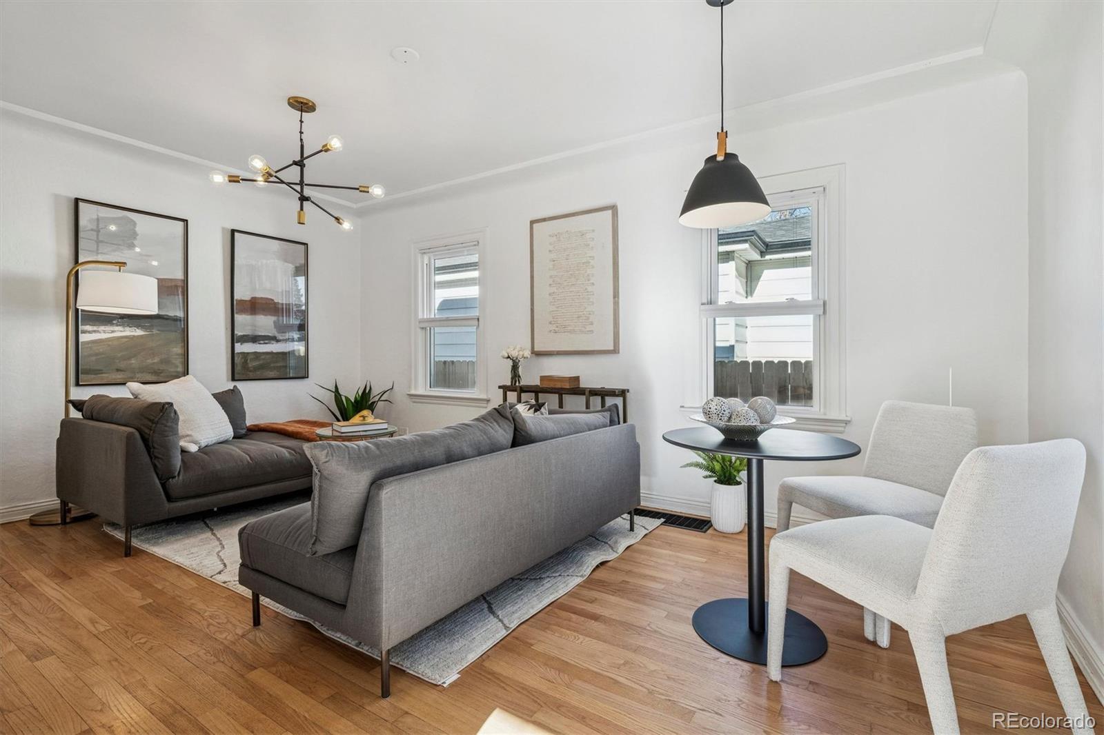 This beautifully updated bungalow is located in the highly sought-after Platt Park neighborhood and offers a thoughtful blend of classic charm and modern design. Originally built in 1941, the three-bedroom, two-bath residence has been carefully refreshed to support both everyday living and entertaining. Original hardwood floors span the open main level, complemented by curated lighting fixtures that add visual interest and character. The living and dining areas flow seamlessly into the kitchen, creating an inviting layout ideal for hosting and daily life. A cozy dining nook provides a welcoming space for meals and casual gatherings. The kitchen serves as a focal point of the home, featuring quartz countertops, European-style cabinetry, stainless steel appliances, and open shelving that balances style and function. The main-floor bathroom includes a vessel sink, statement lighting, built-in shelving, and hexagon tile flooring for a clean, modern aesthetic. The fully finished basement expands the living space with a versatile flex area, guest bedroom accented by wood-plank ceiling details, an additional bathroom, a laundry room, and a dedicated storage closet. Outdoors, the private backyard retreat offers a charming paver patio and a peaceful setting for relaxation or entertaining. Ideally situated less than a mile from neighborhood favorites including Steam Espresso Bar, Uno Mas Taqueria, Izakaya, Kaos Pizzeria, and Sweat Den, this home offers convenient access to some of Platt Park’s most beloved amenities.