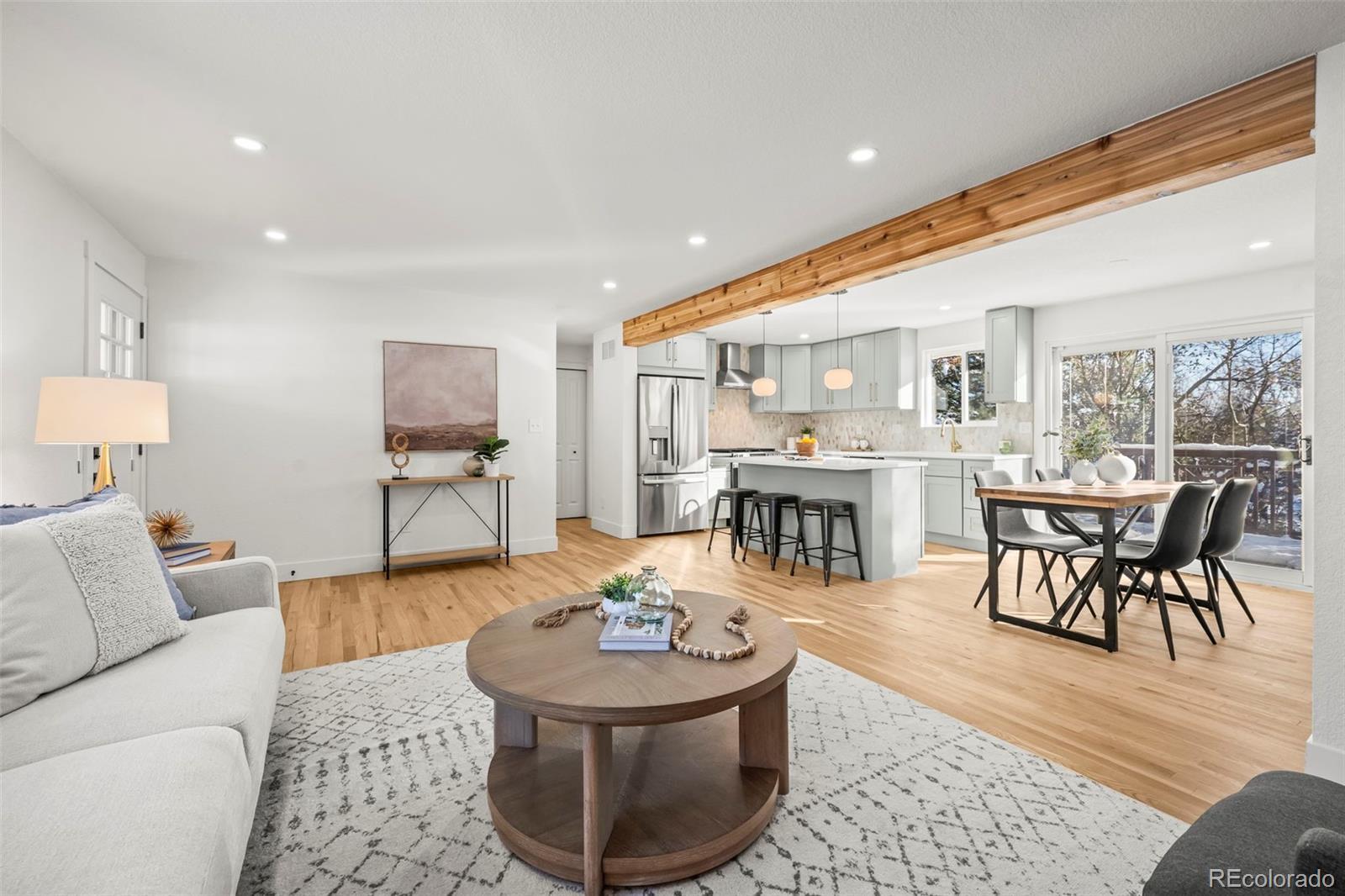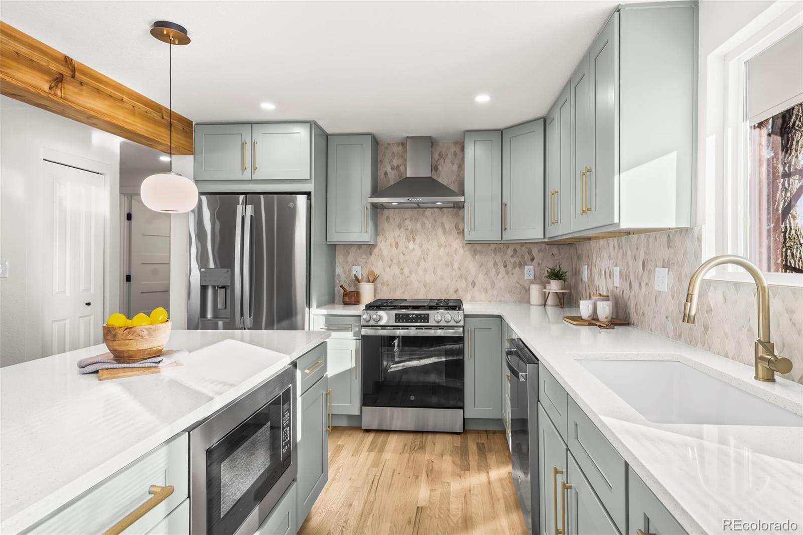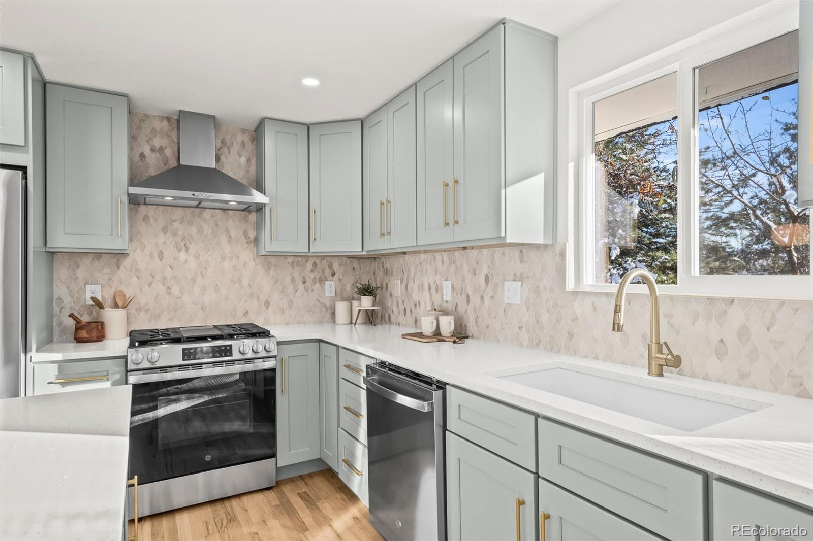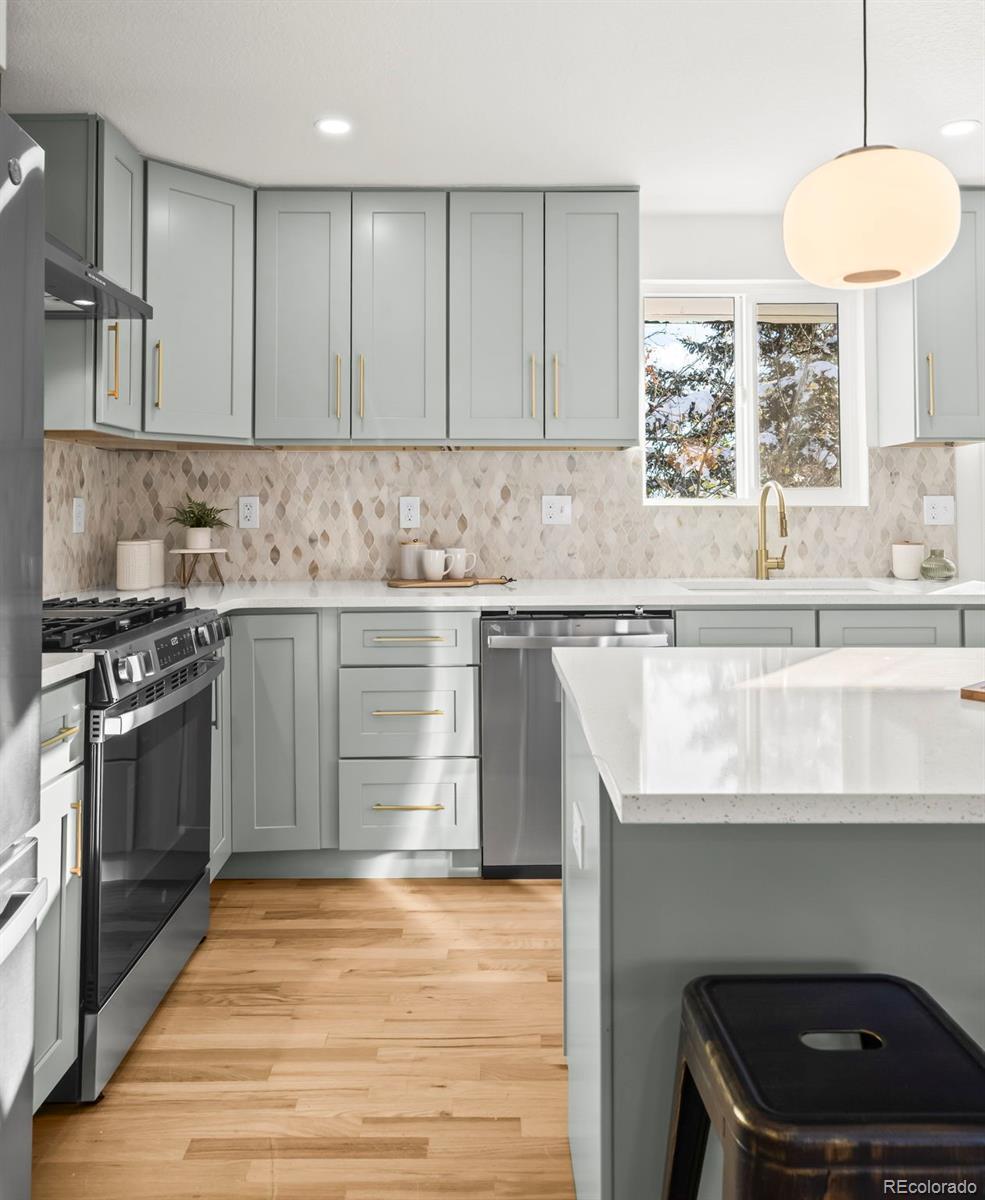 This newly remodeled Arvada ranch blends cozy comfort with understated luxury from the very first glance. Natural light spills across the beautiful hardwood floors, highlighting an open, easy-flow layout that makes the home feel instantly inviting. The kitchen serves as the home’s centerpiece with custom cabinetry, quartz countertops, a gas range, brand-new GE appliances, and a striking Pandoro Lantern Marble backsplash that brings everything together with style. Major updates have already been handled—newer furnace and A/C, updated sewer line, newer water heater, and new windows and sliding doors—so you can move in with confidence. A brand-new concrete front porch adds charming curb appeal, while the spacious back deck offers unexpected mountain views and a peaceful place to unwind. The walkout basement opens to a lush backyard filled with mature trees, offering privacy and a sense of retreat. The attached garage is equipped with an EV charging hookup, making this home as practical as it is beautiful. All of this is set in an ideal Arvada location close to Olde Town, the Apex Center, Majestic View Park, Ralston Central Park Splash, great Jeffco schools, light rail, shopping, and dining.