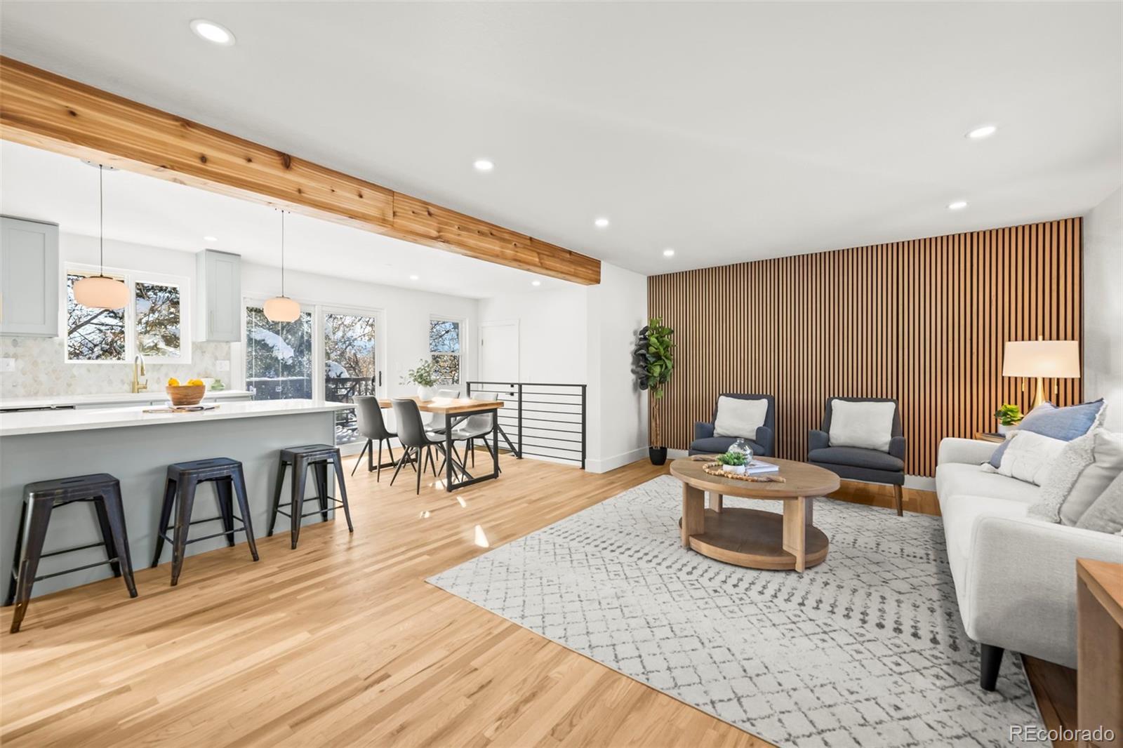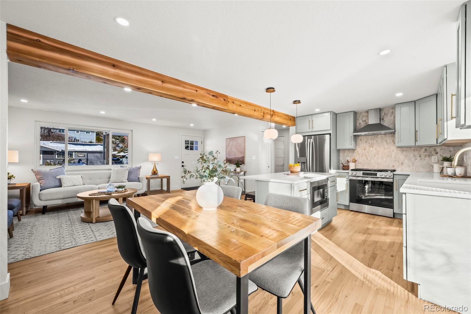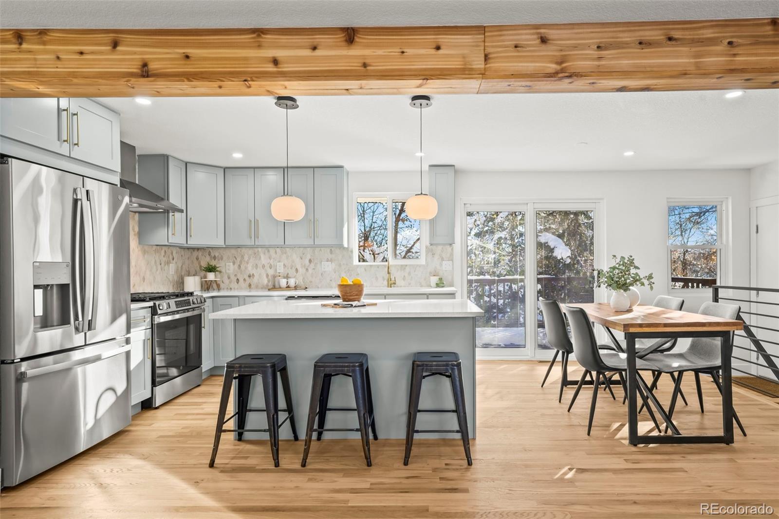 This newly remodeled Arvada ranch blends cozy comfort with understated luxury from the very first glance. Natural light spills across the beautiful hardwood floors, highlighting an open, easy-flow layout that makes the home feel instantly inviting. The kitchen serves as the home’s centerpiece with custom cabinetry, quartz countertops, a gas range, brand-new GE appliances, and a striking Pandoro Lantern Marble backsplash that brings everything together with style. Major updates have already been handled—newer furnace and A/C, updated sewer line, newer water heater, and new windows and sliding doors—so you can move in with confidence. A brand-new concrete front porch adds charming curb appeal, while the spacious back deck offers unexpected mountain views and a peaceful place to unwind. The walkout basement opens to a lush backyard filled with mature trees, offering privacy and a sense of retreat. The attached garage is equipped with an EV charging hookup, making this home as practical as it is beautiful. All of this is set in an ideal Arvada location close to Olde Town, the Apex Center, Majestic View Park, Ralston Central Park Splash, great Jeffco schools, light rail, shopping, and dining.