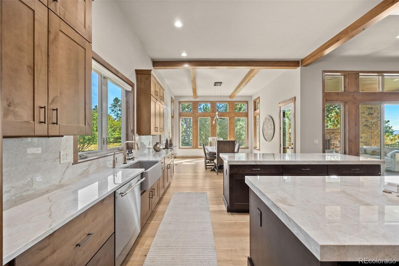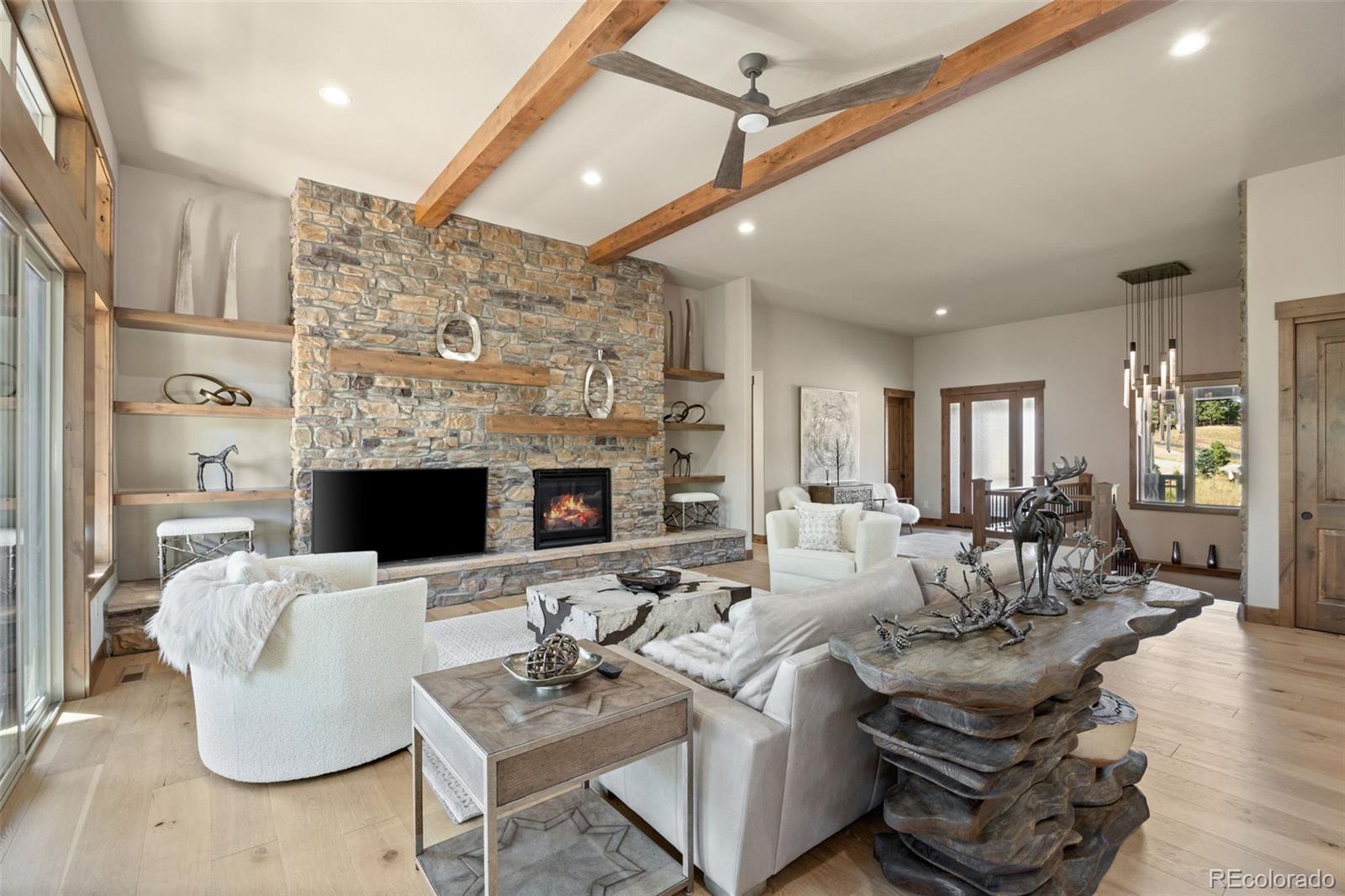Meticulously renovated mountain-modern home in the sought-after Timbers at The Pinery, showcasing curated luxury finishes and elevated craftsmanship throughout. Every line and detail has been carefully considered to achieve the perfect balance of style, elegance, and comfort. Set on a private, wooded .80-acre lot, this residence offers four ensuite bedrooms, two powder rooms, a dedicated main-level office, an oversized four-car garage, and a finished walk-out basement complete with wet bar, game room, fitness center, and wine cellar. Outdoor living is equally refined, featuring a covered patio with stone fireplace, an expansive Trex deck, and a professionally landscaped yard designed for privacy and year-round enjoyment. Crafted for those who appreciate detail, serenity, and sophistication, this home embodies craftsmanship, comfort, and connection to nature in one extraordinary Colorado setting. Step inside to discover a grand interior defined by volume, light, and connection to nature. Soaring 12-foot ceilings, walls of glass, white oak flooring, and wood beams establish the great room’s mountain-modern character. A floor-to-ceiling stone fireplace anchors the open-concept living space, while the gourmet kitchen blends function and artistry with dual islands, Taj Mahal quartzite countertops, custom cabinetry, and professional-grade appliances. Thoughtful architectural lines create effortless flow between living, dining, and outdoor spaces—each designed to capture the home’s wooded backdrop and abundant natural light. See this home in person and experience what words can only suggest. This is more than a residence—it’s a reflection of the Colorado lifestyle at its finest: craftsmanship, connection, and calm in perfect harmony. Experience a modern estate that feels both timeless and deeply personal—a home created not just to live in, but to live well.