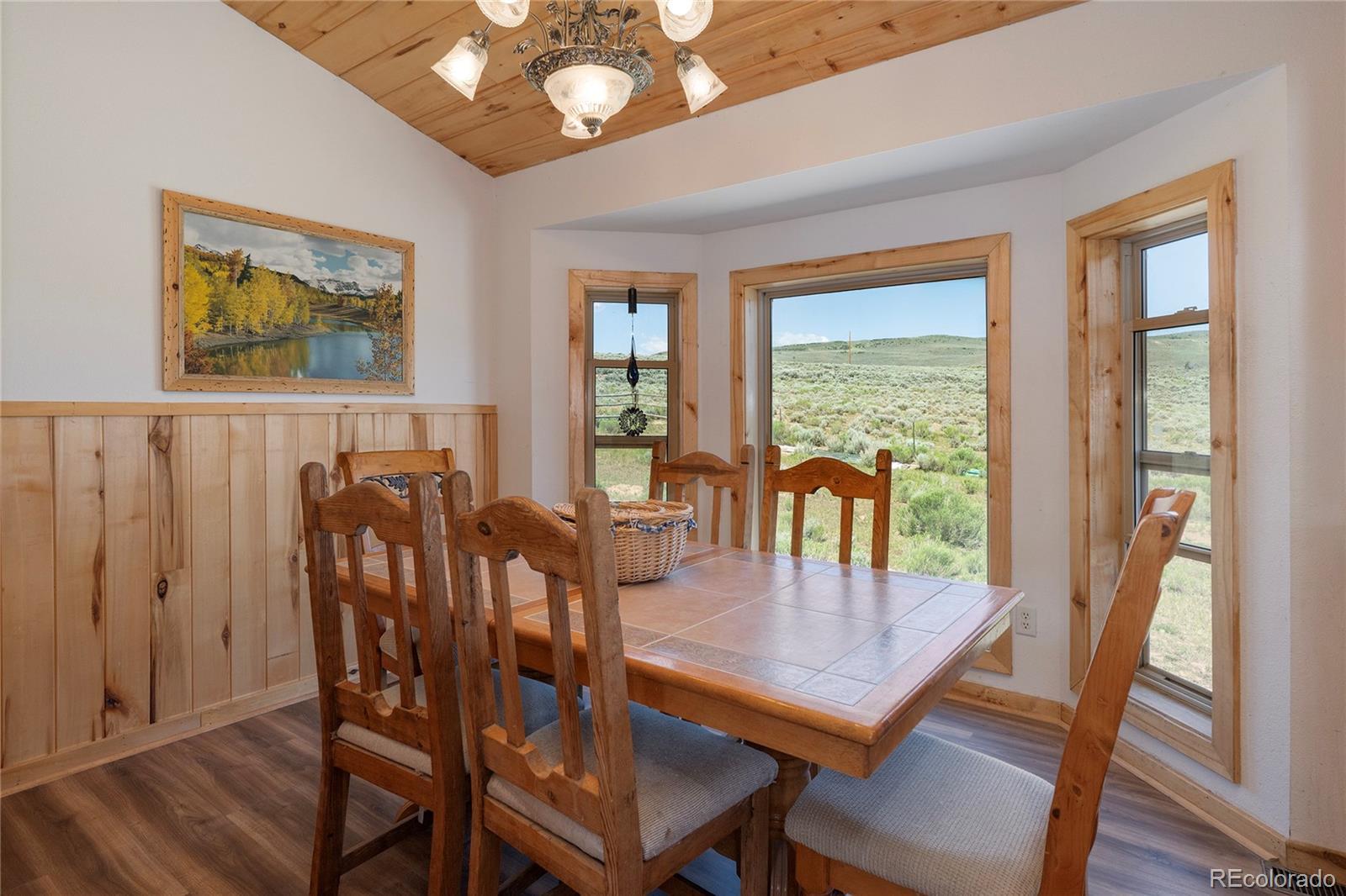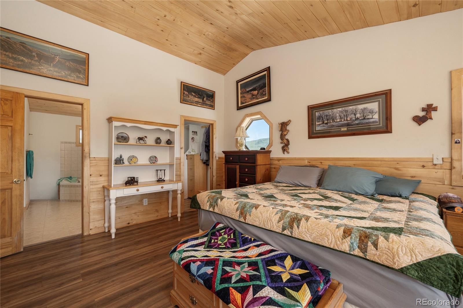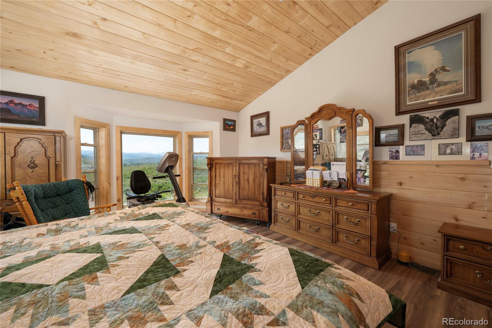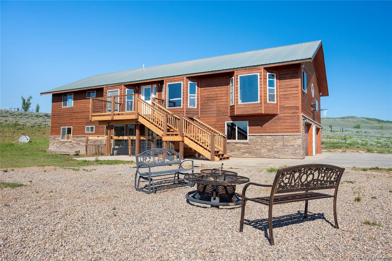 This lovely, well-maintained, and updated 6-bedroom, 3-bathroom home is a true gem, offering an abundance of storage and closet space throughout. With four expansive bay windows and kitchen skylights, natural light floods the interior, beautifully framing the breathtaking scenery that surrounds you. Elegant etched glass French doors lead you to a versatile bedroom, office, or whatever suits your needs. The open kitchen is perfect for entertaining, featuring a large island with seating and plenty of cabinets for all your culinary essentials. The spacious master bedroom features new laminate flooring, a generous walk-in closet, and a luxurious ensuite bathroom complete with a jetted tub and shower stall. The home boasts vaulted tongue-and-groove ceilings and exquisite wall accents, adding character and charm to every room. Enjoy the outdoors on the Trex decking, recently stained wood siding and a new rock exterior around the basement. The property includes a 2-car heated attached garage, providing ample space for vehicles and projects alike. This fully fenced 40-acre property is equipped with a 7-year-old Conex barn, lean-tos, sheds, and covered outdoor horse stalls, making it ideal for livestock. Experience the tranquility of country living while being surrounded by incredible long-range views.