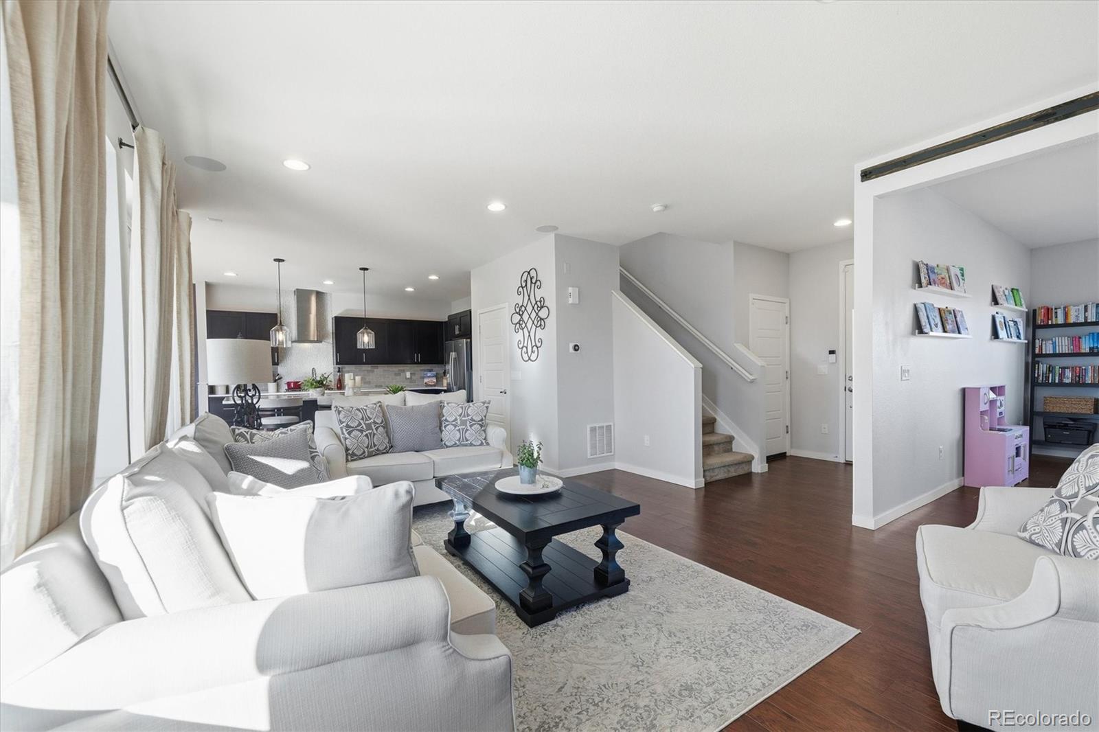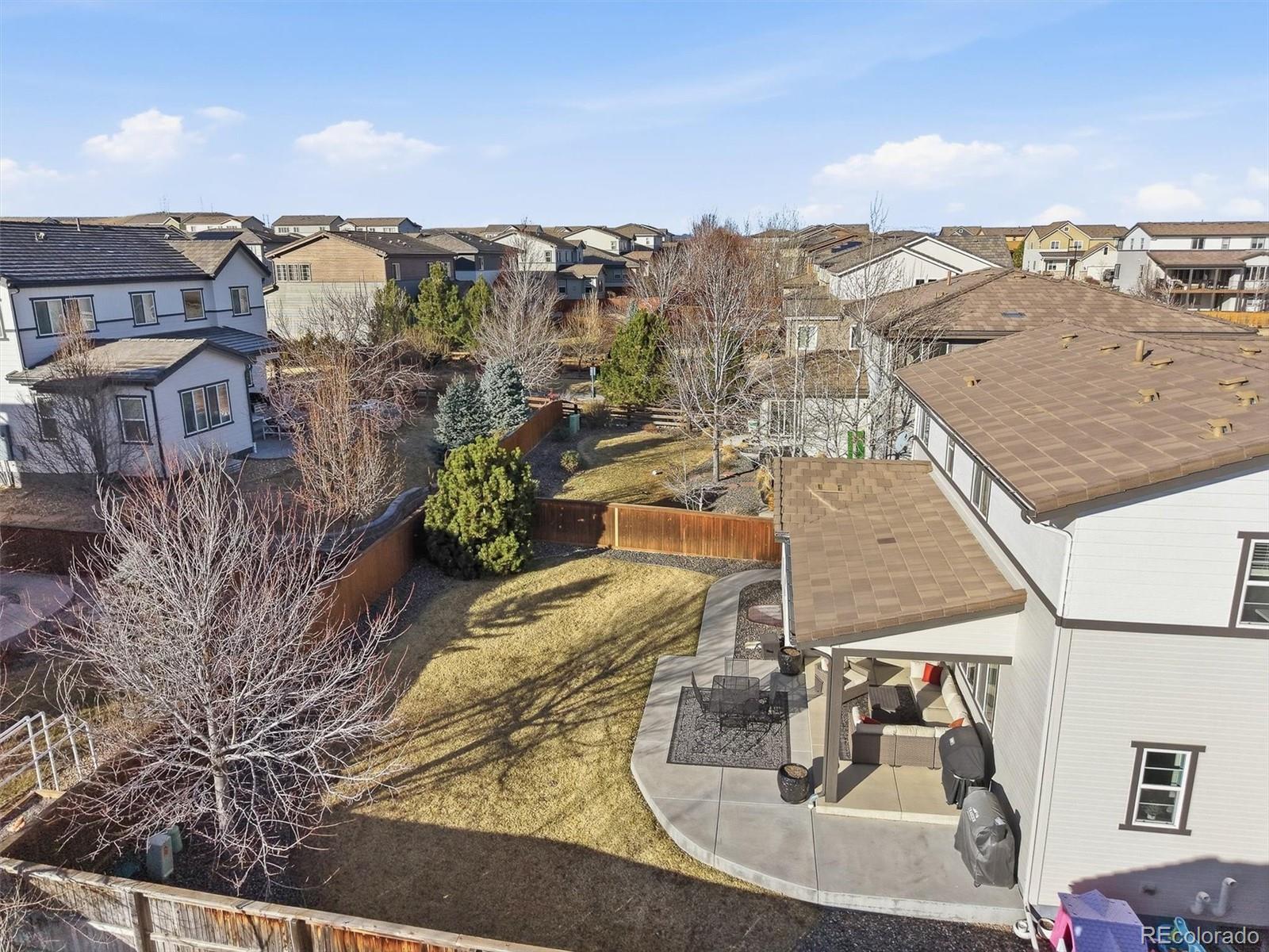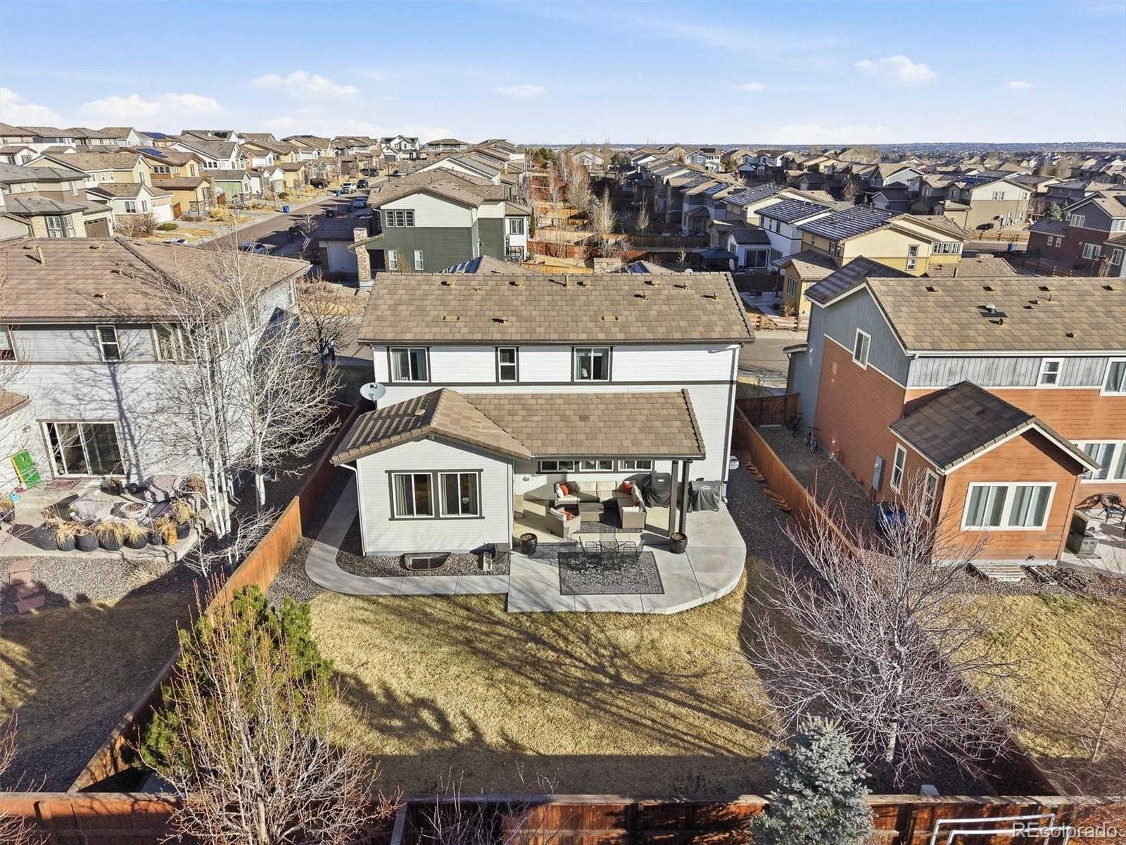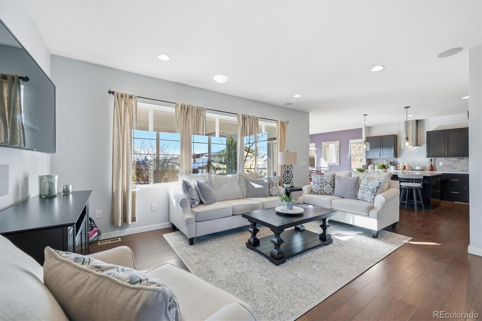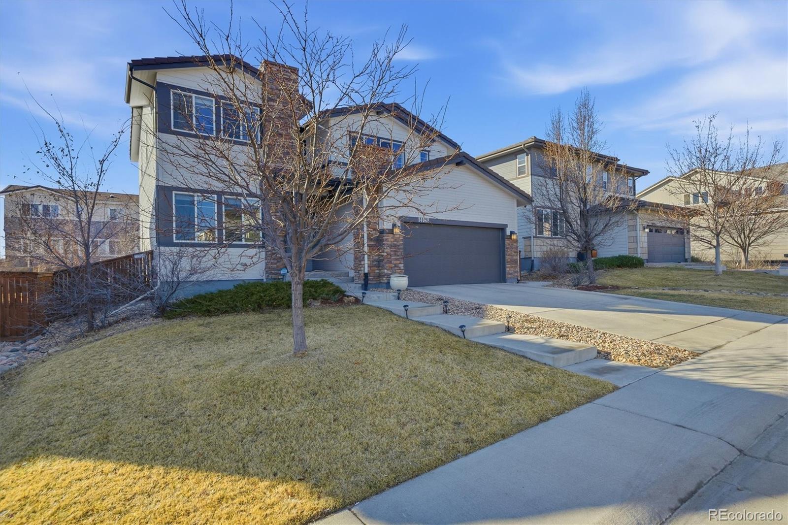 One of Stepping Stone's most desirable floor plans with a generously sized main floor study or bonus room, great room design, 3/4 bath on the main floor and well thought out kitchen and eating area open and connected for ease of entertainment and practical daily living. The covered patio brings the back yard living area right into the home. This Shea Homes upgraded kitchen package includes Stainless Whirlpool Appliances: Gas Stove, Refrigerator, Dishwasher, Wall Mount Microwave Oven; Granite Countertops, Contemporary Backsplash and Attractive Espresso Stained Wood Cabinets. High ceilings, recessed lighting, gas fireplace and wood flooring complete the main floor with direct access to the 2 car, deep garage with exterior service door. The upper level is where the floor plan really shines with a spacious loft, perfect as a playroom or family TV room and game area. There is a dedicated work station niche, the full size laundry room, 2 additional bedrooms with large closets and a full bath. The Primary Suite features contemporary touches with a barn style door closure to the Primary Bath, dual, raised height vanities, walk-in shower and large, walk-in closet. Bath doors are a semi-opaque glass that offers privacy, natural light and a luxurious spa-like aesthetic. The home has been meticulously cared for with an updated HVAC System in 2024, new water heater in 2025, new exterior paint in 2024, newer included washer and dryer; a radon system and concrete tile roof for low maintenance and extended life. Stepping Stone is a master planned community for active, family-friendly living with a clubhouse, Olympic sized pool, kiddie pool, over 7 miles of trails, multiple parks and playgrounds, all surrounded by open space. Douglas County Award winning schools and a easy commute to the I-25 corridor and the DTC. This home is in turn-key condition and move-in ready. Possession negotiable with contract.