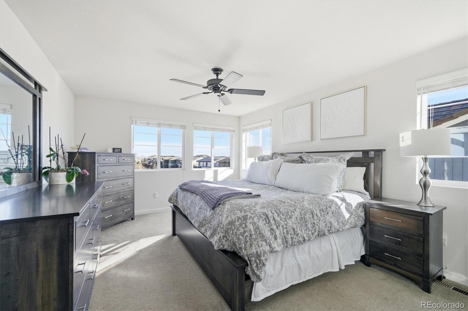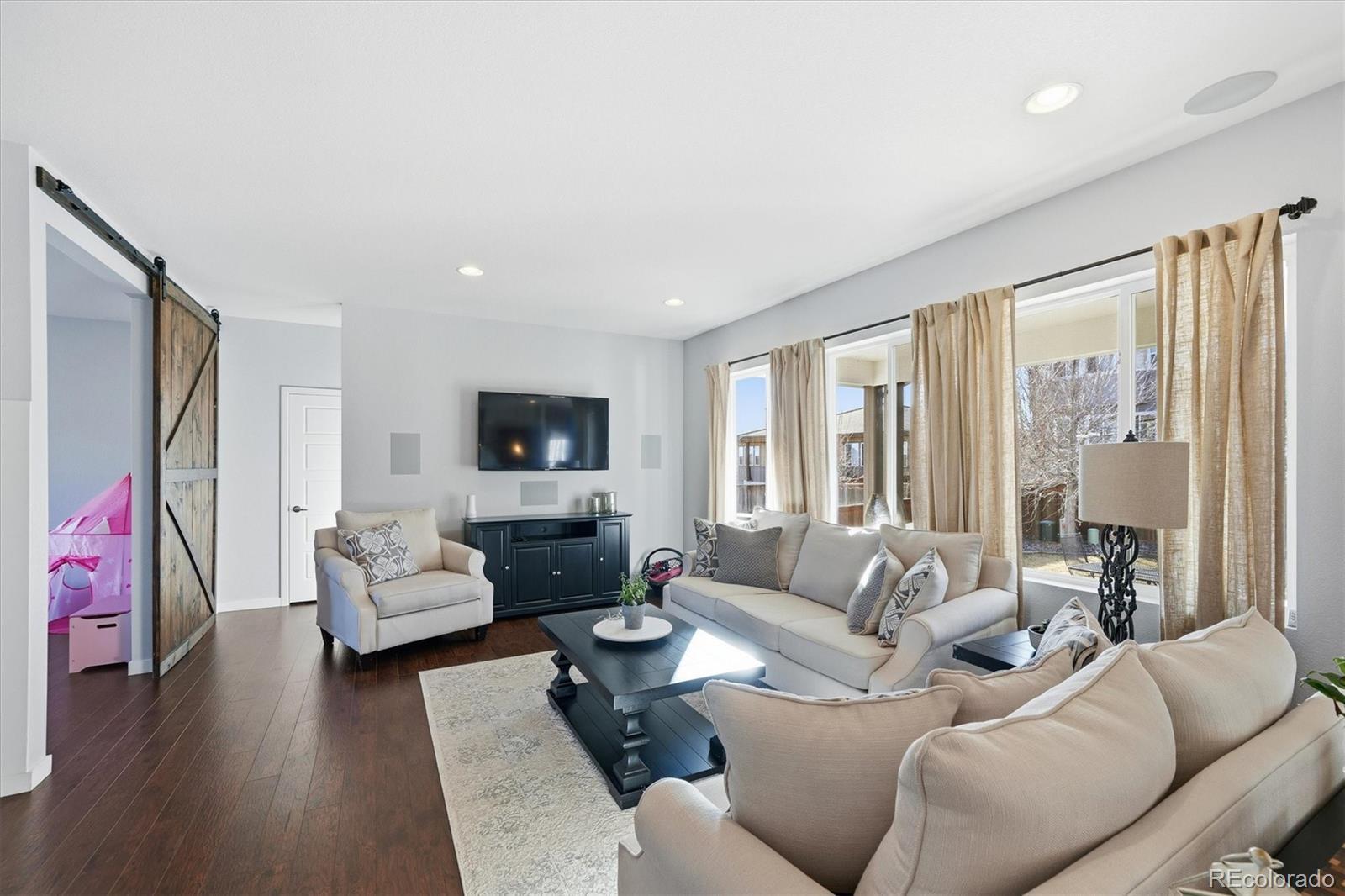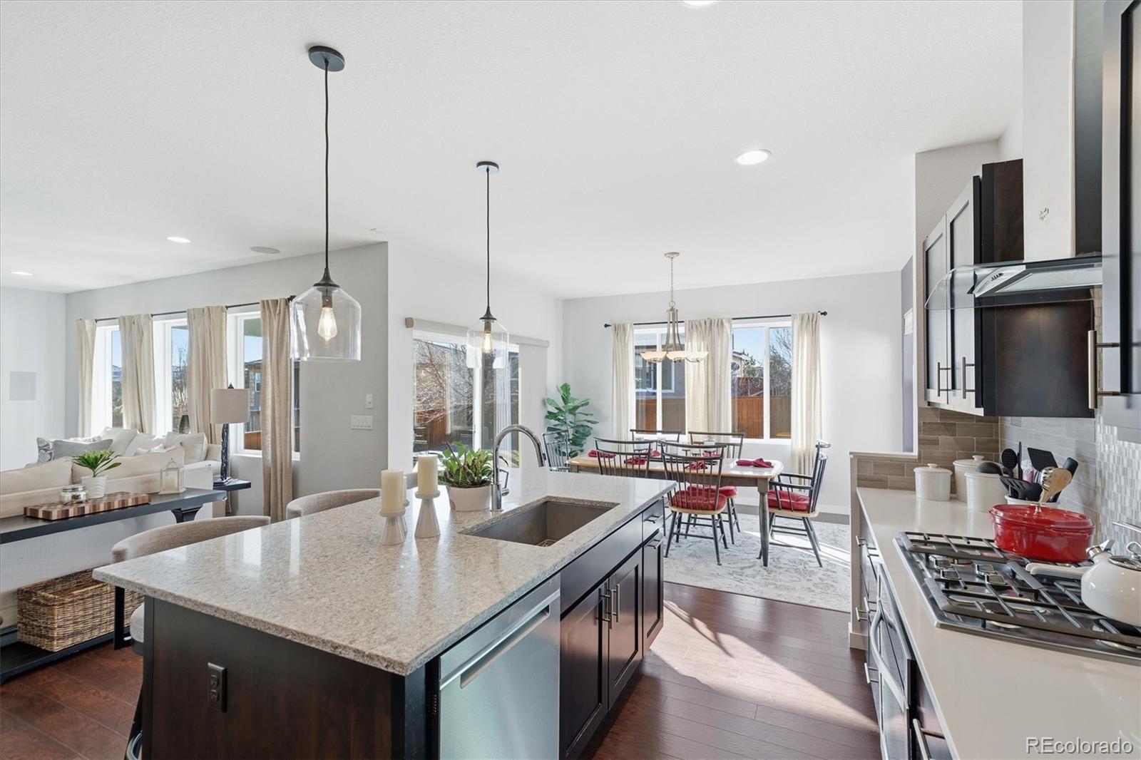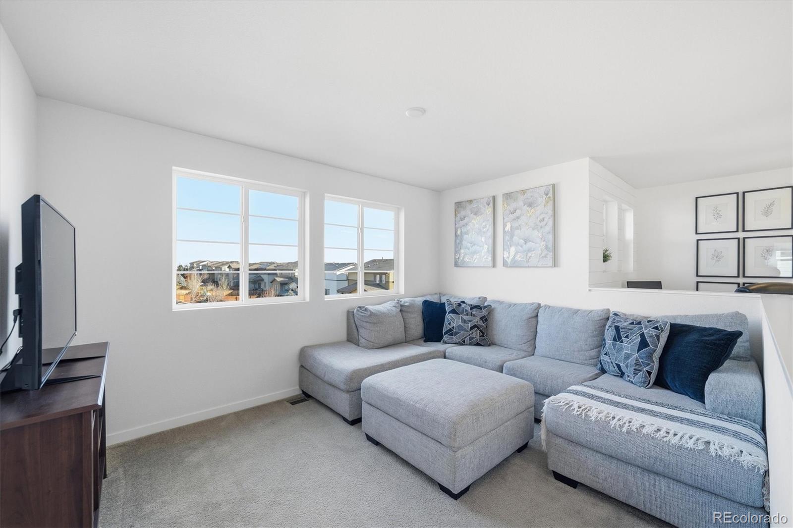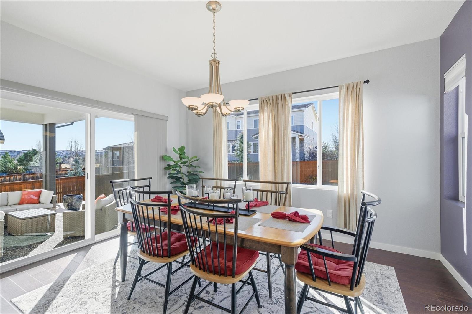 One of Stepping Stone's most desirable floor plans with a generously sized main floor study or bonus room, great room design, 3/4 bath on the main floor and well thought out kitchen and eating area open and connected for ease of entertainment and practical daily living. The covered patio brings the back yard living area right into the home. This Shea Homes upgraded kitchen package includes Stainless Whirlpool Appliances: Gas Stove, Refrigerator, Dishwasher, Wall Mount Microwave Oven; Granite Countertops, Contemporary Backsplash and Attractive Espresso Stained Wood Cabinets. High ceilings, recessed lighting, gas fireplace and wood flooring complete the main floor with direct access to the 2 car, deep garage with exterior service door. The upper level is where the floor plan really shines with a spacious loft, perfect as a playroom or family TV room and game area. There is a dedicated work station niche, the full size laundry room, 2 additional bedrooms with large closets and a full bath. The Primary Suite features contemporary touches with a barn style door closure to the Primary Bath, dual, raised height vanities, walk-in shower and large, walk-in closet. Bath doors are a semi-opaque glass that offers privacy, natural light and a luxurious spa-like aesthetic. The home has been meticulously cared for with an updated HVAC System in 2024, new water heater in 2025, new exterior paint in 2024, newer included washer and dryer; a radon system and concrete tile roof for low maintenance and extended life. Stepping Stone is a master planned community for active, family-friendly living with a clubhouse, Olympic sized pool, kiddie pool, over 7 miles of trails, multiple parks and playgrounds, all surrounded by open space. Douglas County Award winning schools and a easy commute to the I-25 corridor and the DTC. This home is in turn-key condition and move-in ready. Possession negotiable with contract.