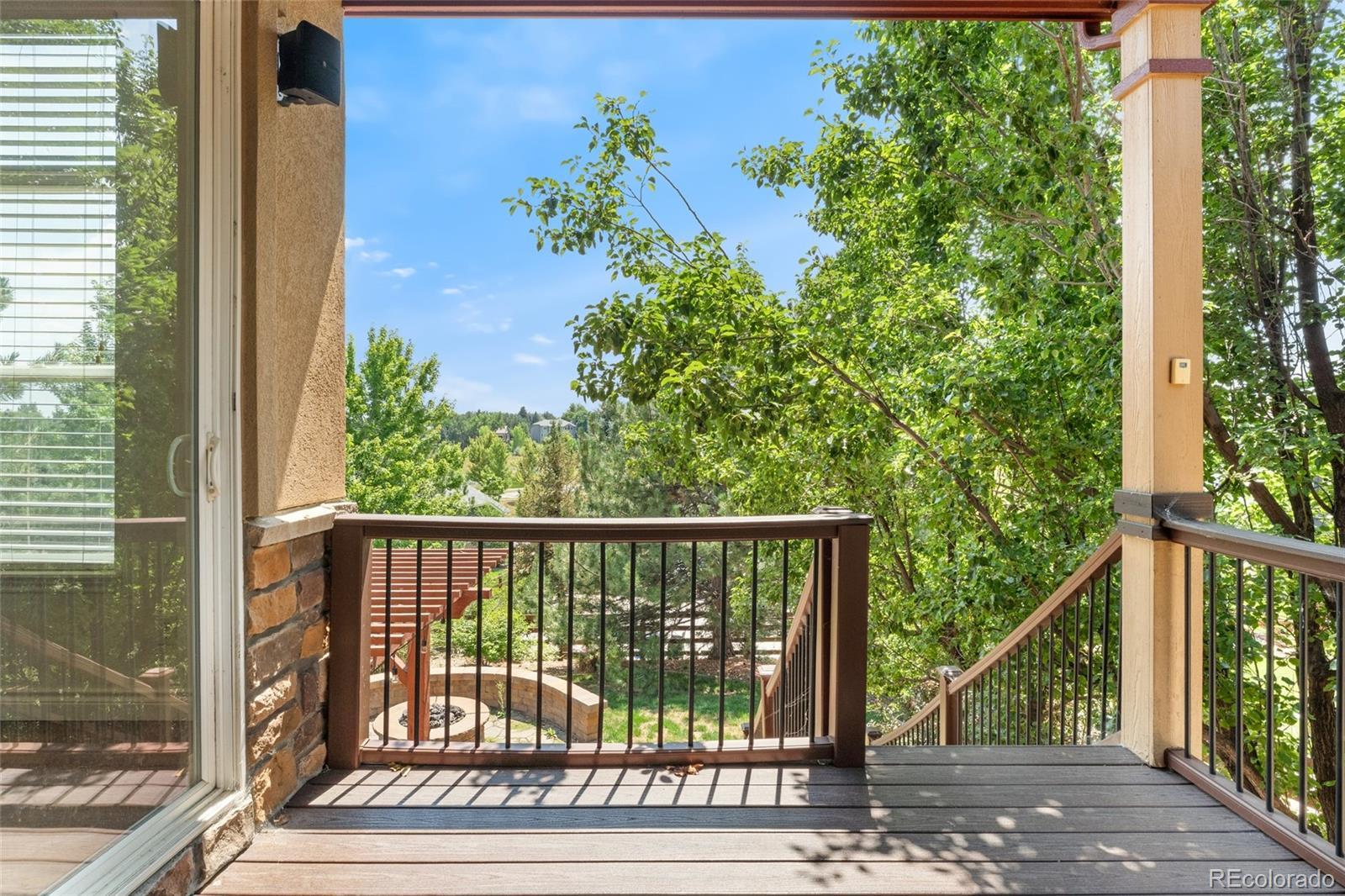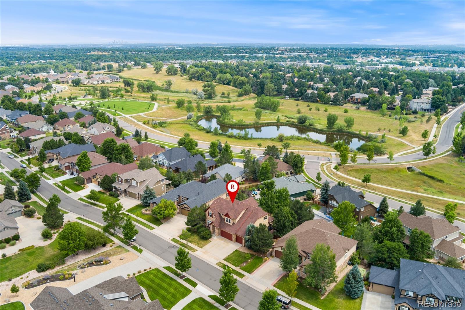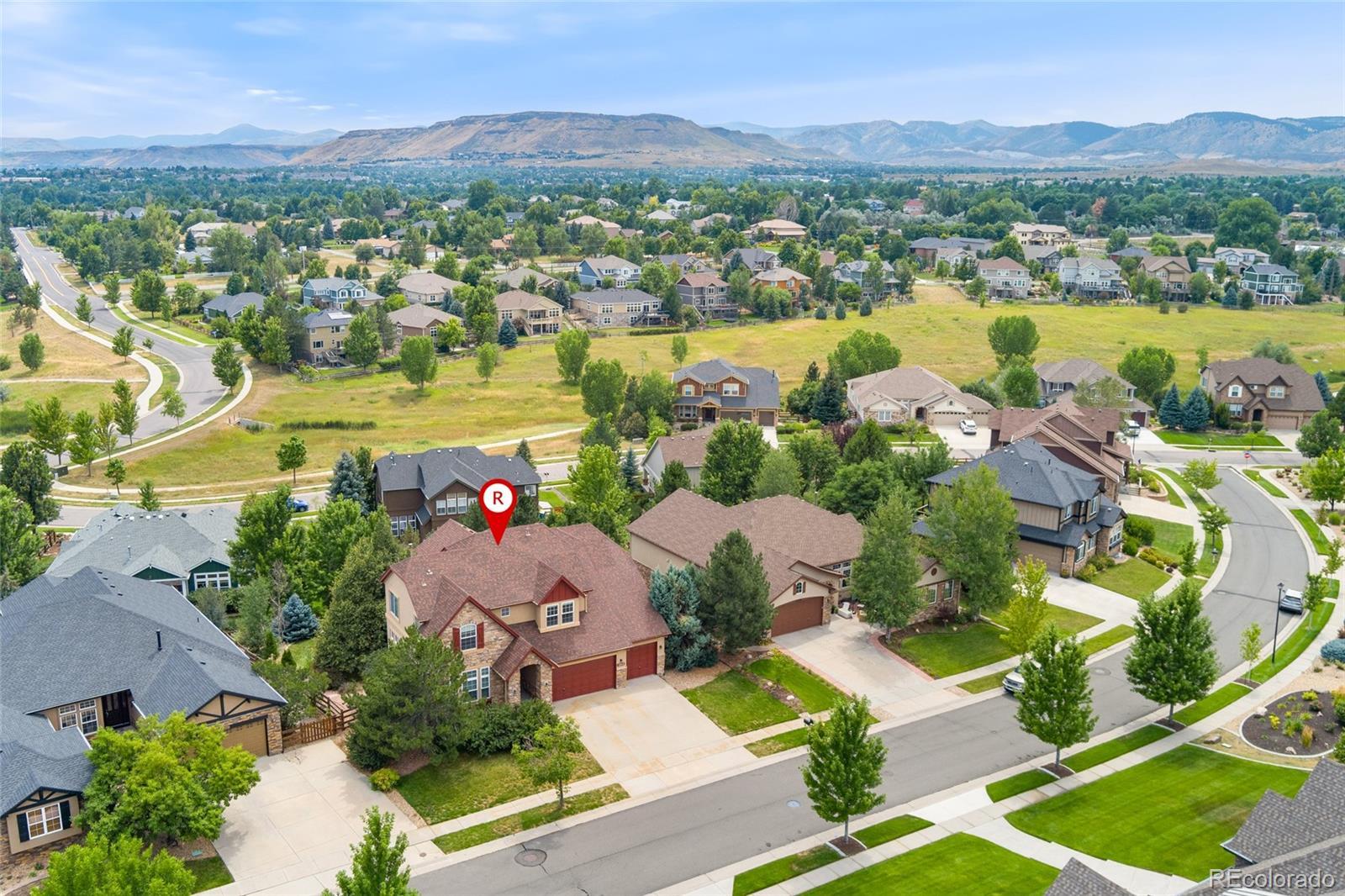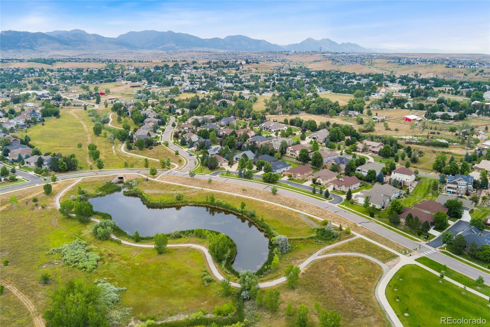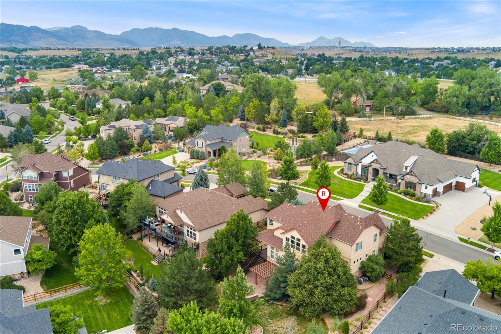 This stunning Saddle Brook gem sits at the highest point in the neighborhood, offering truly unmatched views of the Front Range, valley, and city skyline. Whether you're enjoying your morning coffee on the upper deck, relaxing on the walk-out patio, or waking up in the primary bedroom, the scenery is nothing short of breathtaking. The quiet, desirable community adds to the peaceful charm, with mature trees surrounding the property and a beautiful walking path around the neighborhood pond. Inside, the home impresses with its soaring ceilings, light-filled open layout, and hardwood floors throughout the main and upper levels. The expansive great room flows seamlessly into the chef’s kitchen, which features tall cabinetry with crown molding, stainless steel appliances, gas cooktop, double oven, huge walk-in pantry, and a center eat-in island. A formal dining room provides space for gatherings, while a cozy breakfast nook off the kitchen opens to the upper deck. Upstairs, four spacious bedrooms await. The luxurious primary suite features a wall of windows and a spa-like bathroom with a soaking tub perfectly positioned for 180-degree mountain views. Two of the guest bedrooms share a Jack-and-Jill bath, while the fourth has its own private en-suite. The generous home office offers an ideal setup for remote work, and the large unfinished basement presents endless possibilities for future customization. Outside, enjoy evenings around the fire pit on the paver patio, surrounded by nature and views in every direction. Recent updates include one new furnace (2025), newly finished garage with epoxy floors, finished crawlspace with ventilation and concrete flooring, wood flooring upstairs, and a water filtration system. This home blends elegance, comfort, and awe-inspiring views in one of the area's most desirable locations, with easy access to shopping, parks, and trails.