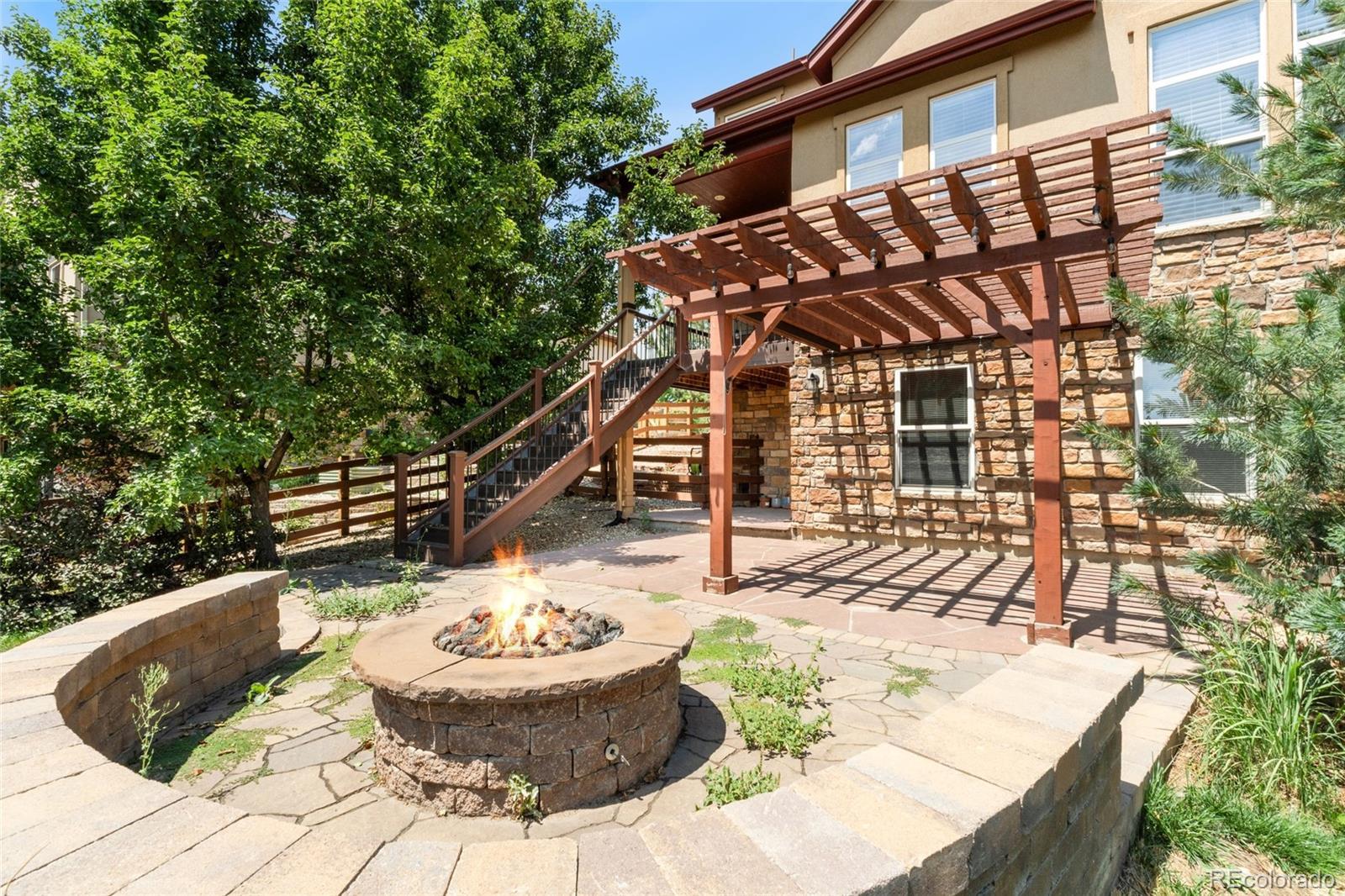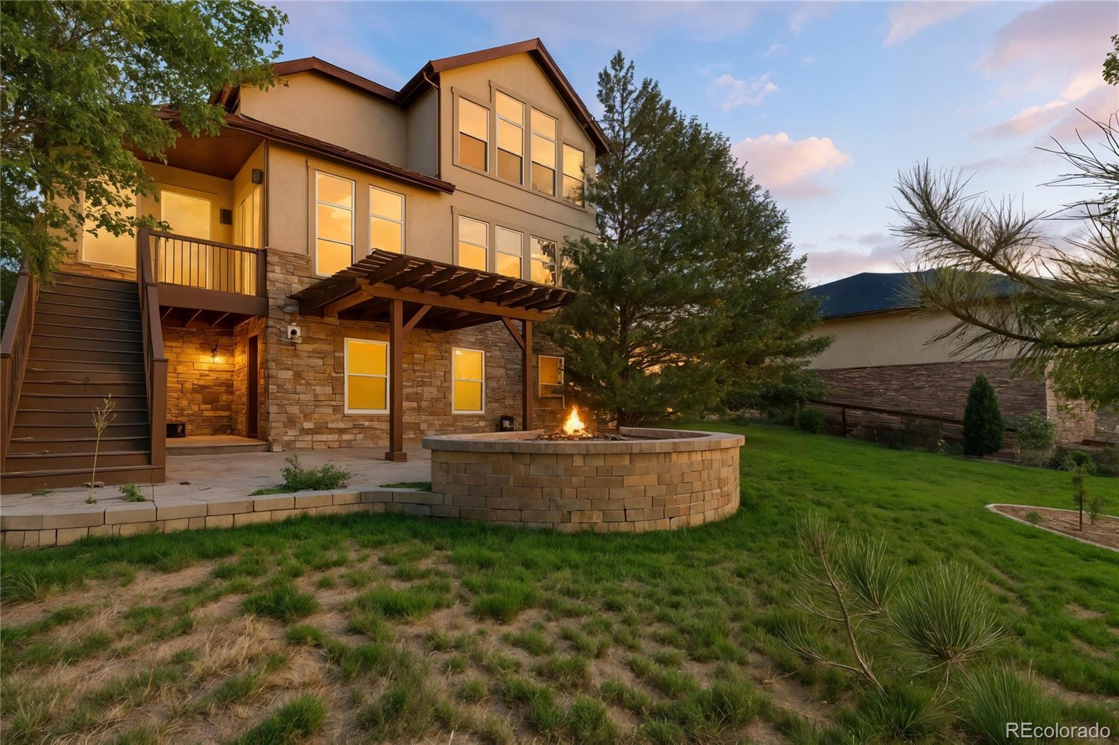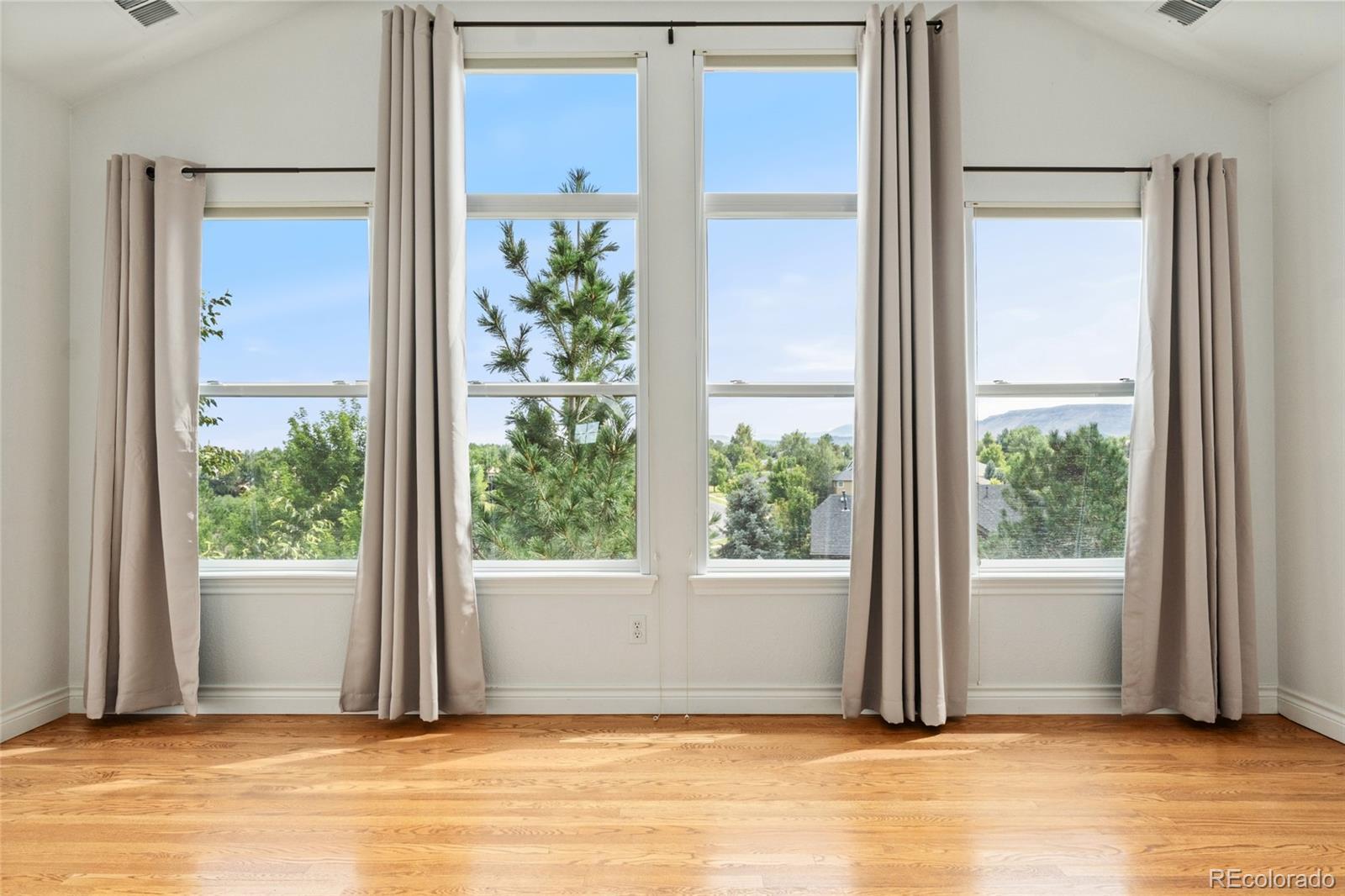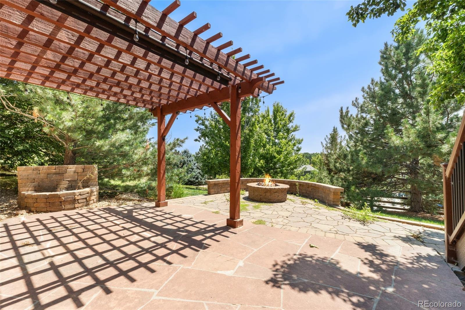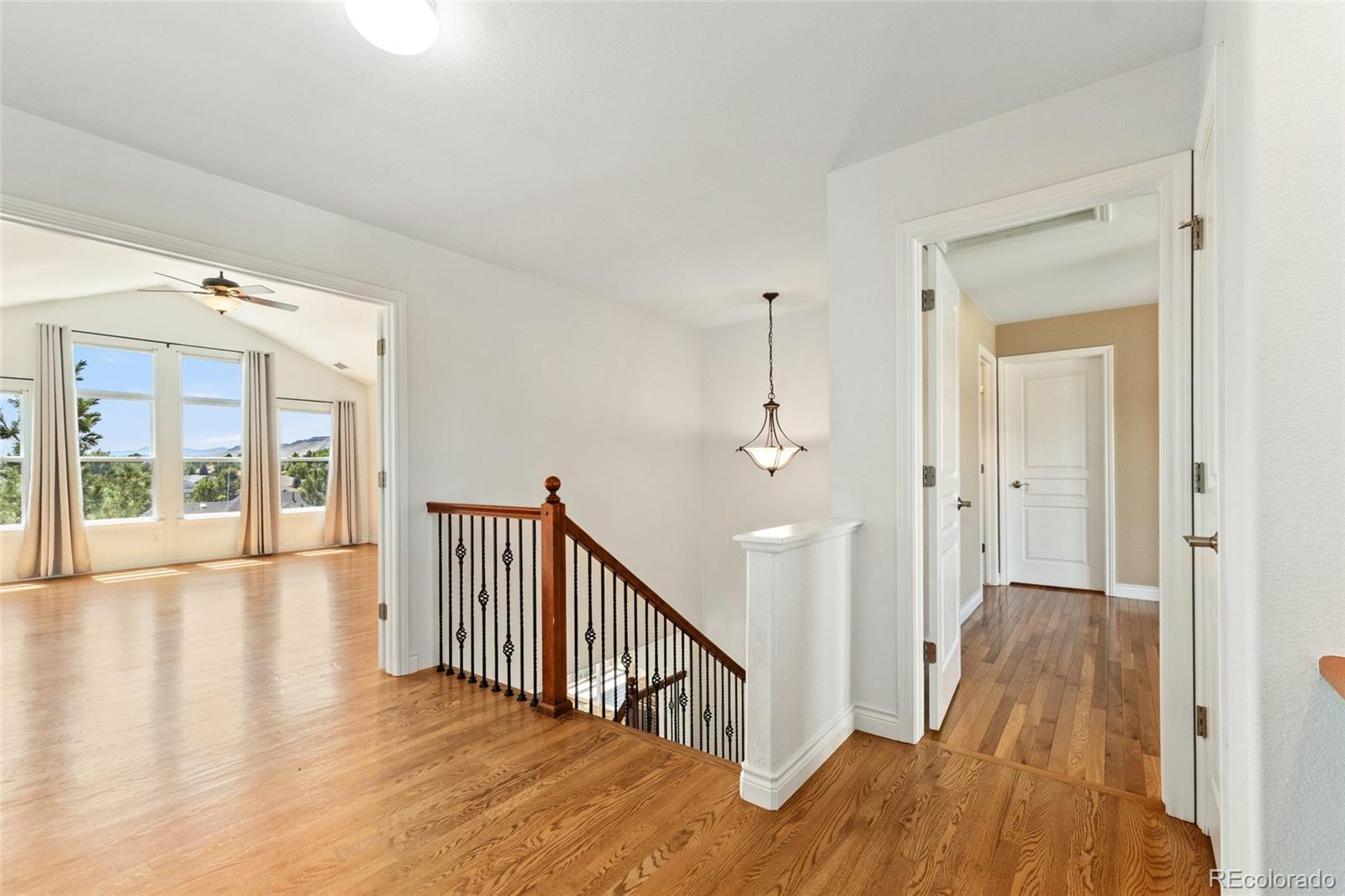 This stunning Saddle Brook gem sits at the highest point in the neighborhood, offering truly unmatched views of the Front Range, valley, and city skyline. Whether you're enjoying your morning coffee on the upper deck, relaxing on the walk-out patio, or waking up in the primary bedroom, the scenery is nothing short of breathtaking. The quiet, desirable community adds to the peaceful charm, with mature trees surrounding the property and a beautiful walking path around the neighborhood pond. Inside, the home impresses with its soaring ceilings, light-filled open layout, and hardwood floors throughout the main and upper levels. The expansive great room flows seamlessly into the chef’s kitchen, which features tall cabinetry with crown molding, stainless steel appliances, gas cooktop, double oven, huge walk-in pantry, and a center eat-in island. A formal dining room provides space for gatherings, while a cozy breakfast nook off the kitchen opens to the upper deck. Upstairs, four spacious bedrooms await. The luxurious primary suite features a wall of windows and a spa-like bathroom with a soaking tub perfectly positioned for 180-degree mountain views. Two of the guest bedrooms share a Jack-and-Jill bath, while the fourth has its own private en-suite. The generous home office offers an ideal setup for remote work, and the large unfinished basement presents endless possibilities for future customization. Outside, enjoy evenings around the fire pit on the paver patio, surrounded by nature and views in every direction. Recent updates include one new furnace (2025), newly finished garage with epoxy floors, finished crawlspace with ventilation and concrete flooring, wood flooring upstairs, and a water filtration system. This home blends elegance, comfort, and awe-inspiring views in one of the area's most desirable locations, with easy access to shopping, parks, and trails.