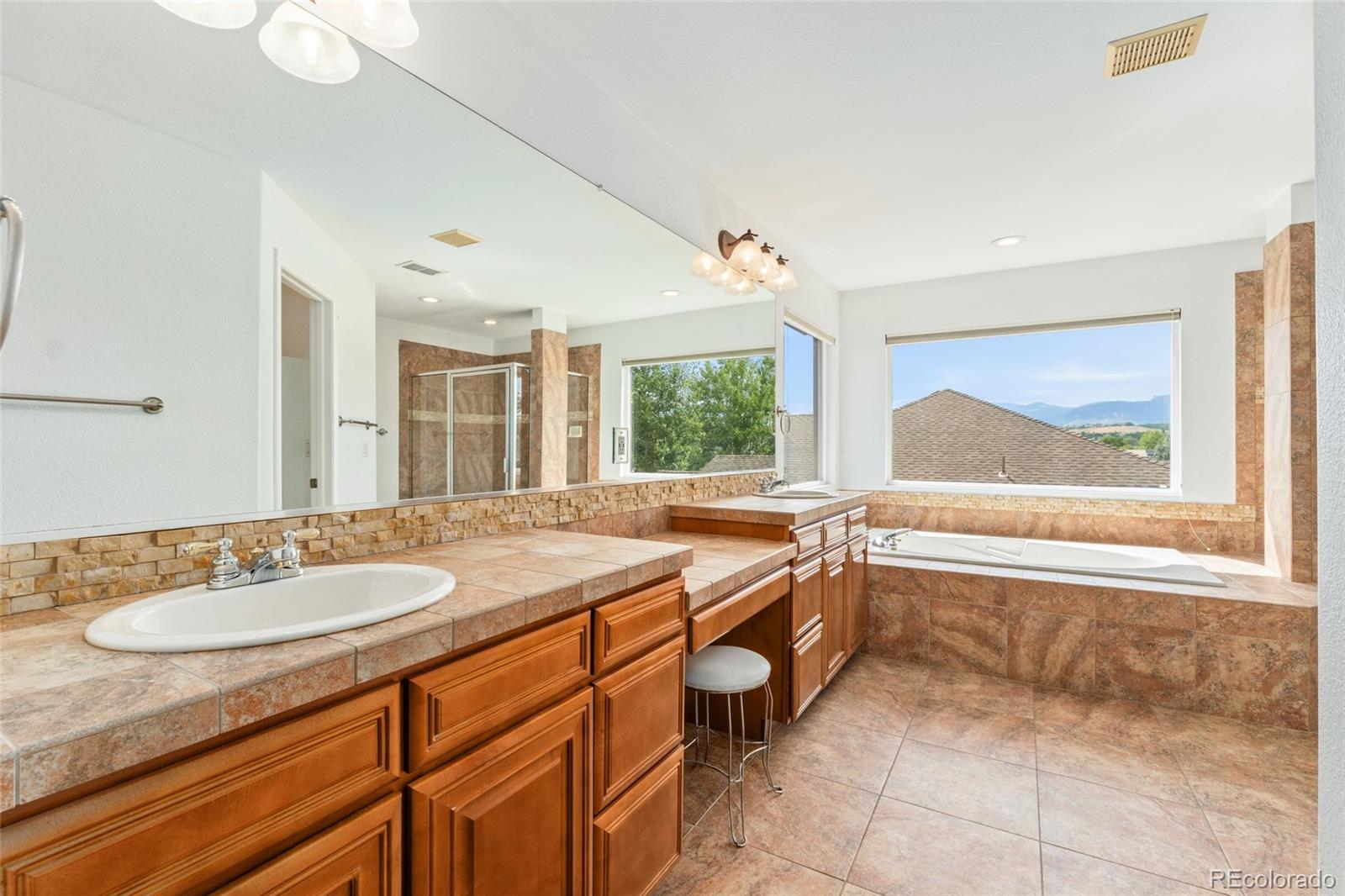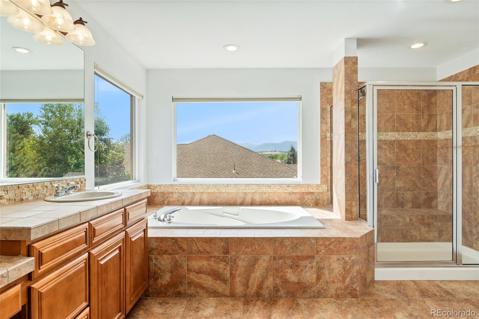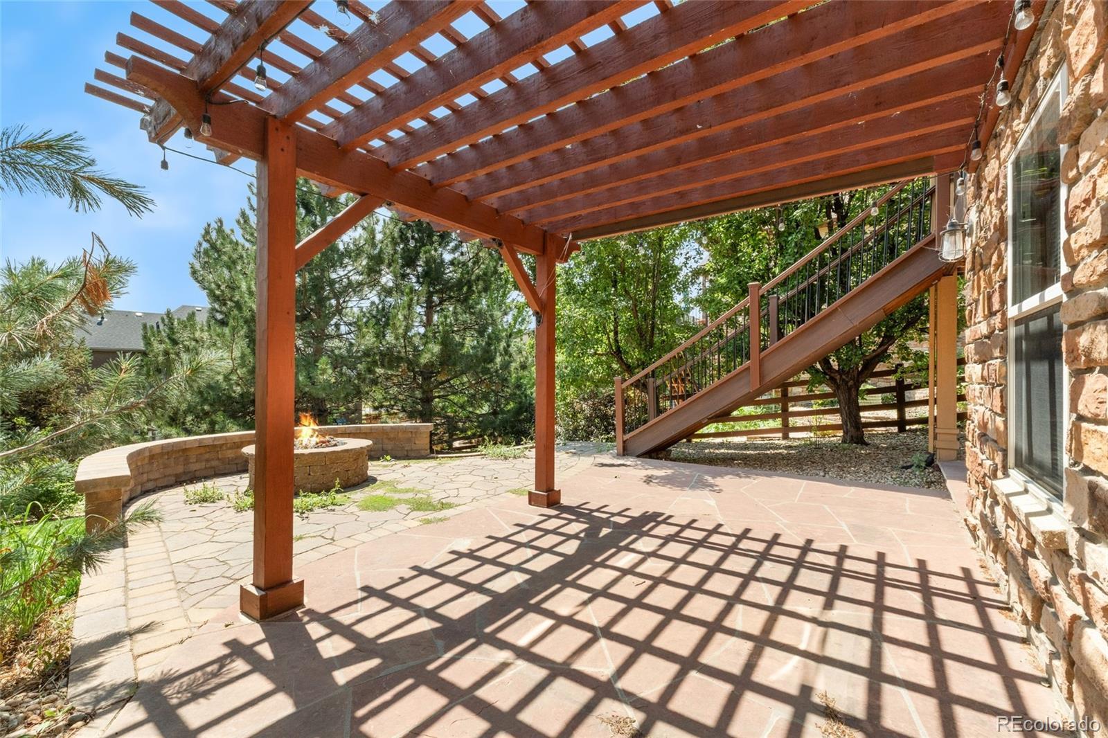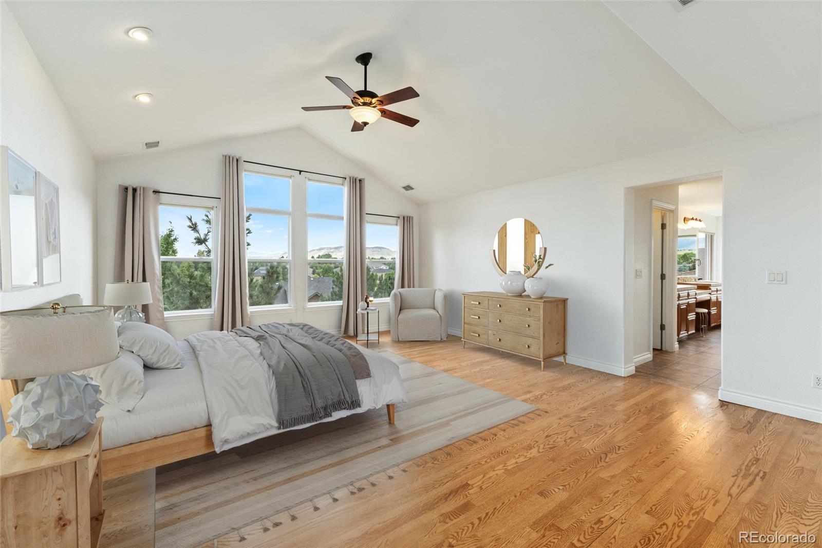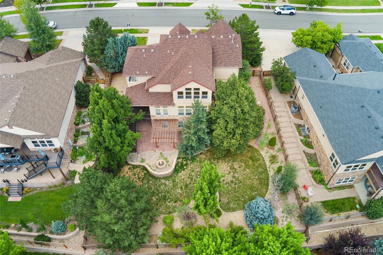 This stunning Saddle Brook gem sits at the highest point in the neighborhood, offering truly unmatched views of the Front Range, valley, and city skyline. Whether you're enjoying your morning coffee on the upper deck, relaxing on the walk-out patio, or waking up in the primary bedroom, the scenery is nothing short of breathtaking. The quiet, desirable community adds to the peaceful charm, with mature trees surrounding the property and a beautiful walking path around the neighborhood pond. Inside, the home impresses with its soaring ceilings, light-filled open layout, and hardwood floors throughout the main and upper levels. The expansive great room flows seamlessly into the chef’s kitchen, which features tall cabinetry with crown molding, stainless steel appliances, gas cooktop, double oven, huge walk-in pantry, and a center eat-in island. A formal dining room provides space for gatherings, while a cozy breakfast nook off the kitchen opens to the upper deck. Upstairs, four spacious bedrooms await. The luxurious primary suite features a wall of windows and a spa-like bathroom with a soaking tub perfectly positioned for 180-degree mountain views. Two of the guest bedrooms share a Jack-and-Jill bath, while the fourth has its own private en-suite. The generous home office offers an ideal setup for remote work, and the large unfinished basement presents endless possibilities for future customization. Outside, enjoy evenings around the fire pit on the paver patio, surrounded by nature and views in every direction. Recent updates include one new furnace (2025), newly finished garage with epoxy floors, finished crawlspace with ventilation and concrete flooring, wood flooring upstairs, and a water filtration system. This home blends elegance, comfort, and awe-inspiring views in one of the area's most desirable locations, with easy access to shopping, parks, and trails.