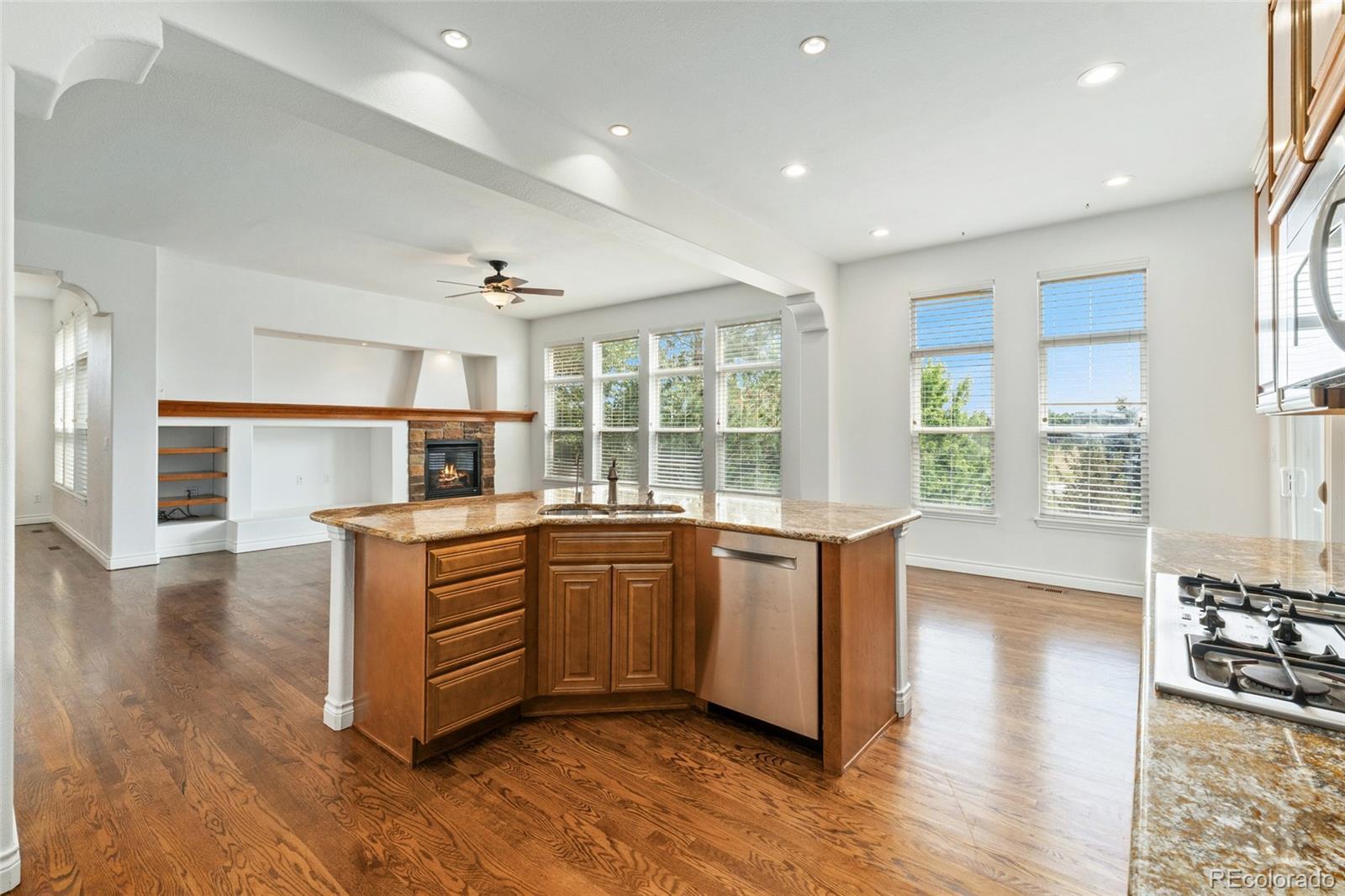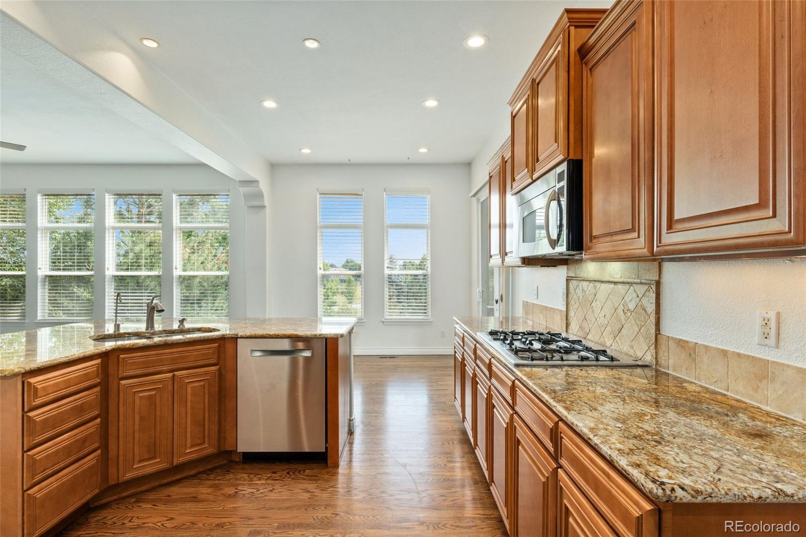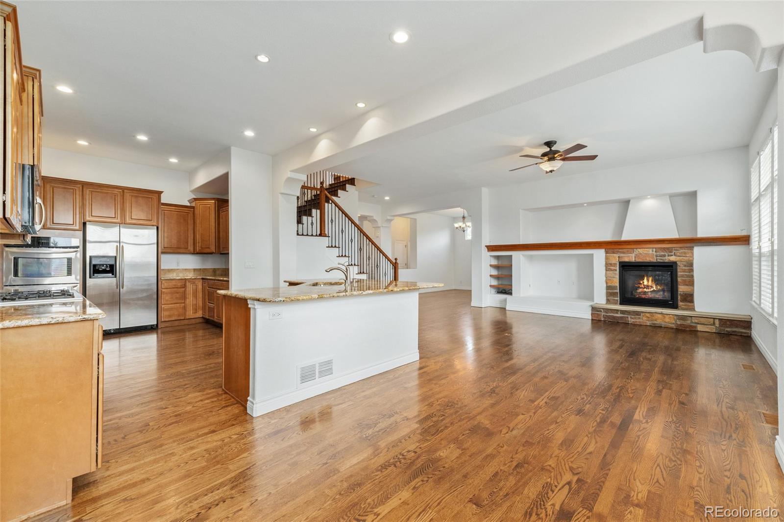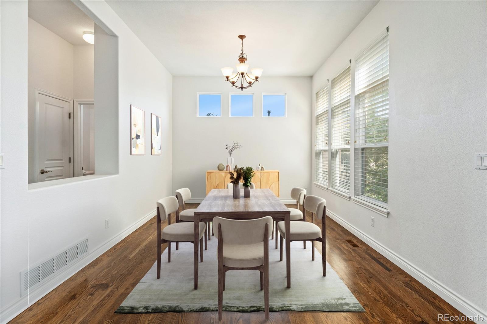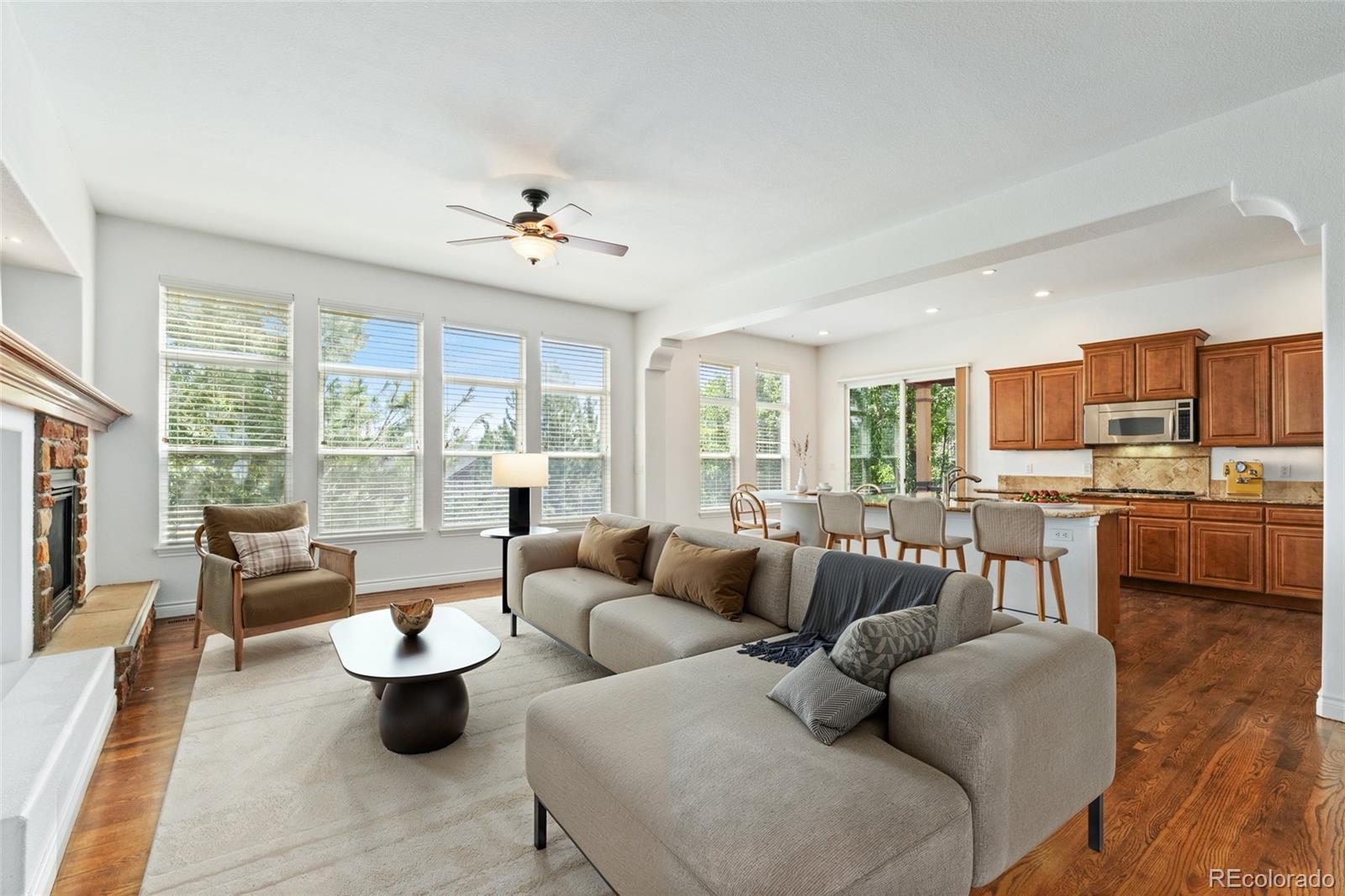 This stunning Saddle Brook gem sits at the highest point in the neighborhood, offering truly unmatched views of the Front Range, valley, and city skyline. Whether you're enjoying your morning coffee on the upper deck, relaxing on the walk-out patio, or waking up in the primary bedroom, the scenery is nothing short of breathtaking. The quiet, desirable community adds to the peaceful charm, with mature trees surrounding the property and a beautiful walking path around the neighborhood pond. Inside, the home impresses with its soaring ceilings, light-filled open layout, and hardwood floors throughout the main and upper levels. The expansive great room flows seamlessly into the chef’s kitchen, which features tall cabinetry with crown molding, stainless steel appliances, gas cooktop, double oven, huge walk-in pantry, and a center eat-in island. A formal dining room provides space for gatherings, while a cozy breakfast nook off the kitchen opens to the upper deck. Upstairs, four spacious bedrooms await. The luxurious primary suite features a wall of windows and a spa-like bathroom with a soaking tub perfectly positioned for 180-degree mountain views. Two of the guest bedrooms share a Jack-and-Jill bath, while the fourth has its own private en-suite. The generous home office offers an ideal setup for remote work, and the large unfinished basement presents endless possibilities for future customization. Outside, enjoy evenings around the fire pit on the paver patio, surrounded by nature and views in every direction. Recent updates include one new furnace (2025), newly finished garage with epoxy floors, finished crawlspace with ventilation and concrete flooring, wood flooring upstairs, and a water filtration system. This home blends elegance, comfort, and awe-inspiring views in one of the area's most desirable locations, with easy access to shopping, parks, and trails.