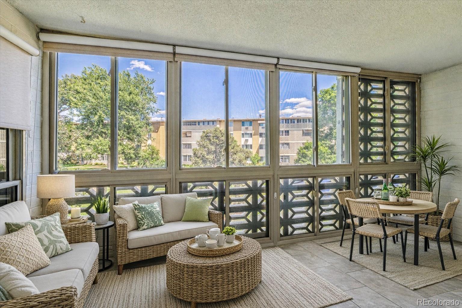 Welcome to 595 S Alton Way #7B, a beautifully updated condo tucked into a quiet interior location within Denver’s premier 55+ community—Windsor Gardens. While the address may appear close to Alameda on the map, this unit is positioned on the opposite side of the building, well away from traffic, offering a peaceful setting with no road noise.Step inside and immediately appreciate the rich CoreTec Pro Plus luxury vinyl plank flooring that flows throughout the main living areas, creating a stylish and durable foundation. The kitchen is truly the heart of the home—featuring warm cherry cabinetry, quartz countertops, a travertine tile backsplash, stainless steel appliances, and a bar-height counter perfect for casual dining or entertaining guests.Both bathrooms have been thoughtfully remodeled with modern quartz vanities, updated tile flooring, and beautifully designed shower surrounds—classic subway tile in the main bath and striking river rock tile in the primary ensuite. A custom barn door adds character and functionality between the living area and second bedroom, while the primary suite offers a spacious California Closet walk-in and brand-new plush carpet for added comfort.Additional highlights include:• Garage space #28 in Lot 15, ideally located right next to the building entrance• Laundry room just steps away• Fresh finishes and thoughtful upgrades throughoutEnjoy everything Windsor Gardens has to offer—indoor and outdoor pools, a fitness center, golf course, restaurant, scenic walking trails, and a vibrant community center filled with clubs and activities.Experience quiet, low-maintenance living in one of Denver’s most desirable active adult communities.Ask about special financing incentives! Schedule your private showing today!