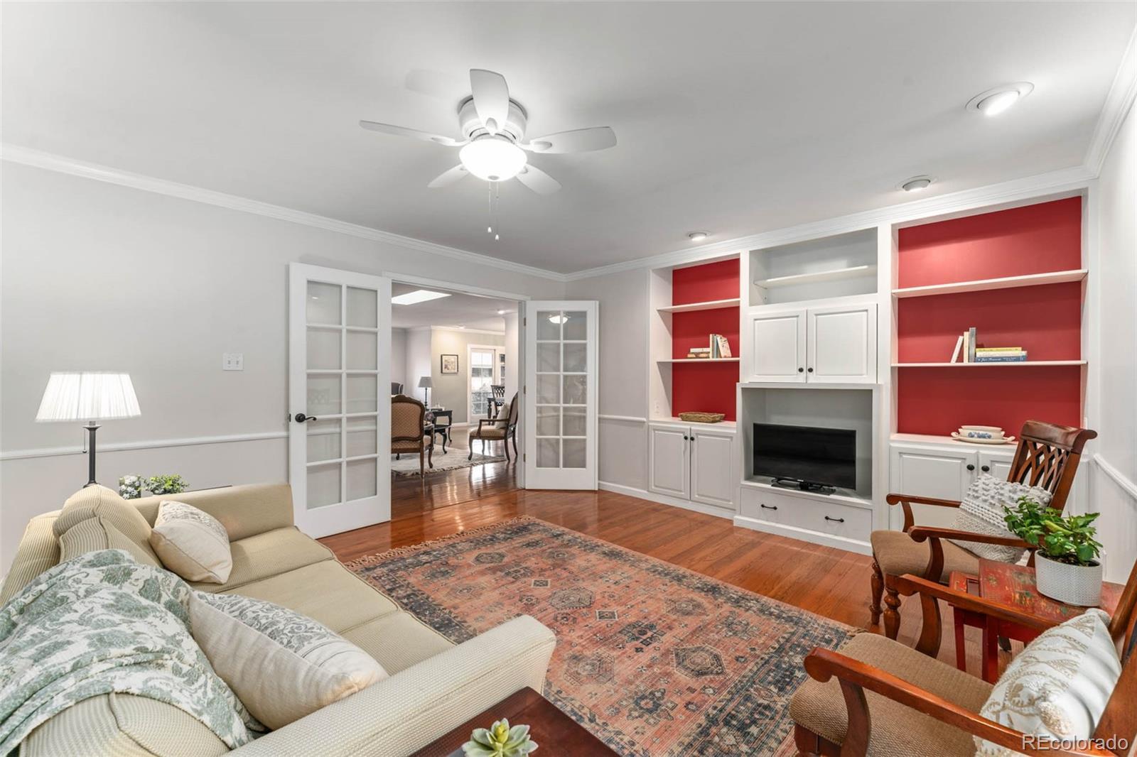 Southeast-facing patio home in Kent Village, thoughtfully maintained and updated. Light-filled interior with skylights, wood floors, crown molding, and a finished basement. Great room floorplan with an open living, dining, and kitchen layout. The living room features a gas fireplace, skylights, and built-in hutch and the dining area offers sliding door access to a brick-paved patio. French doors open to a main floor den/office with access to the private interior courtyard. The updated kitchen includes slab granite countertops, decorative tile backsplash, two-tone RWH custom cabinetry, walk-in pantry, eat-in bar with pendant lighting, and stainless-steel appliances, including a 5-burner gas cooktop and panel-front refrigerator. A spacious main floor primary suite includes wood floors, ceiling fan, and a luxurious five-piece bath. The laundry room, conveniently located on the main floor, includes a utility sink. The finished basement offers a large family room, nonconforming bedroom with built-ins, updated half bath, cedar closet, and generous storage. Oversized two-car garage and radon system already installed. Located in the Cherry Creek School District with easy access to I-25, I-225, DTC, Cherry Creek, Park Meadows, and more. Community amenities include a pool, clubhouse, fitness center, spa/hot tub, and guest parking.