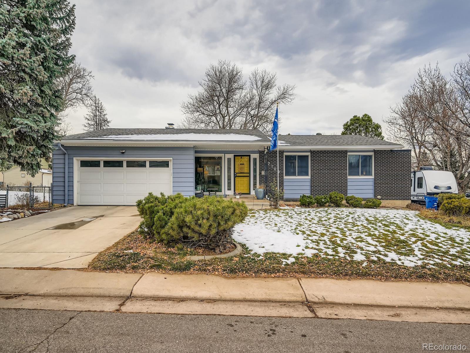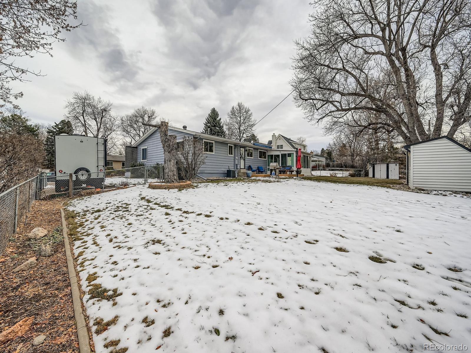 Welcome to this beautifully updated mid-century modern ranch, perfectly situated in the highly sought-after Cherry Creek School District. Thoughtfully designed and full of character, this 3-bed, 2-bath gem blends timeless style with modern comfort. Step inside this light-filled, open concept home and be wowed by all its upgrades. The spacious family room features a stunning custom bay window with a cozy window seat and built-in bookshelves—an ideal spot for reading, relaxing, or gathering with loved ones. The flow continues seamlessly into the renovated kitchen and dining area, where quartz countertops, a marble backsplash, and a butcher-block island set the stage for memorable meals and easy entertaining. The private primary suite offers a peaceful retreat with its own updated en-suite ¾ bath, while two additional bedrooms provide versatility for family, guests, or a dedicated home office. Outdoors, your personal oasis awaits. Sitting on almost one-third of an acre, the mature, beautifully landscaped yard delivers incredible privacy and picturesque views. Whether you're hosting summer barbecues or enjoying quiet evenings under the retractable awning, this space is made for year-round enjoyment. The property also includes two storage sheds and an impressive concrete RV pad complete with an electrical hookup—perfect for campers, boats, or any adventure-ready gear. This home truly has it all—style, function, space, and an unbeatable location. Come experience the charm and comfort for yourself.