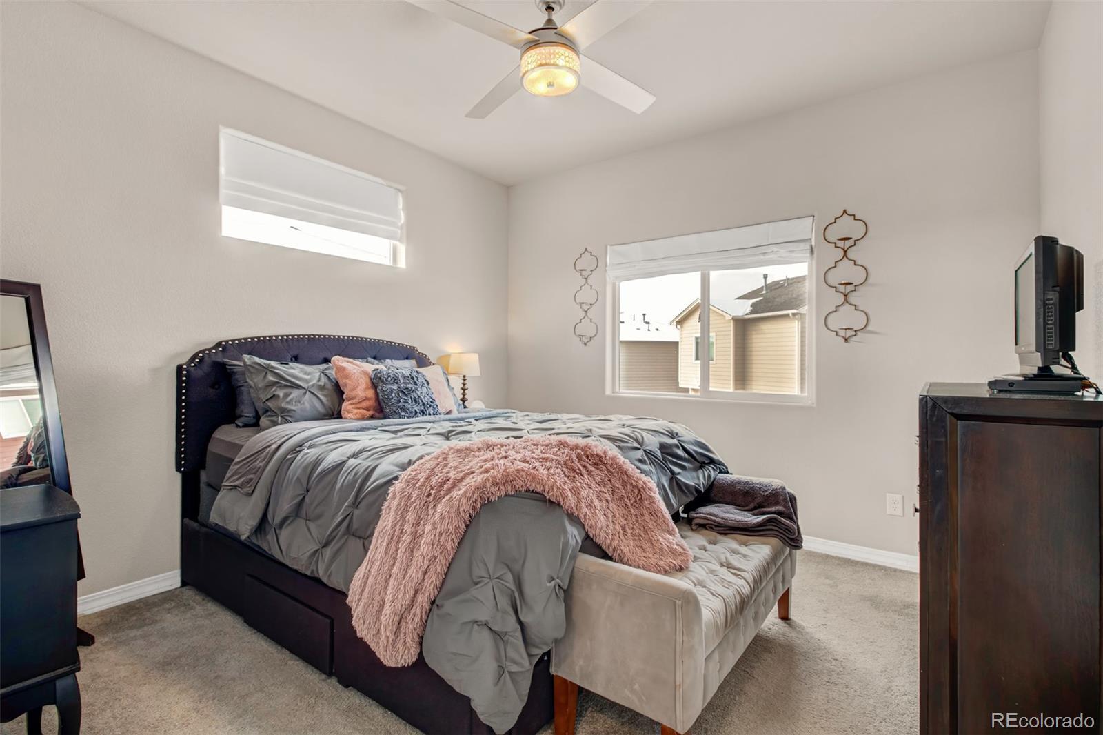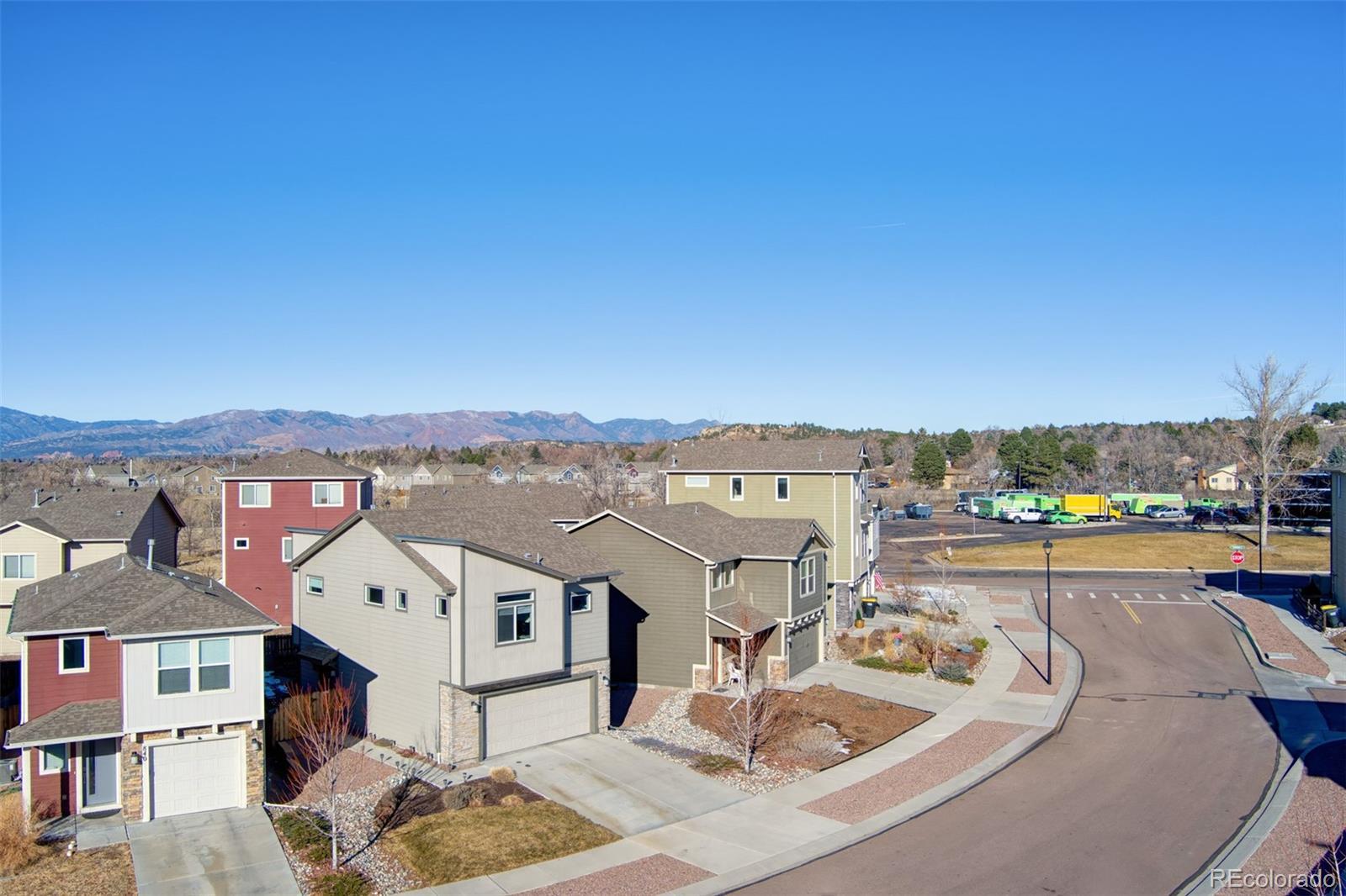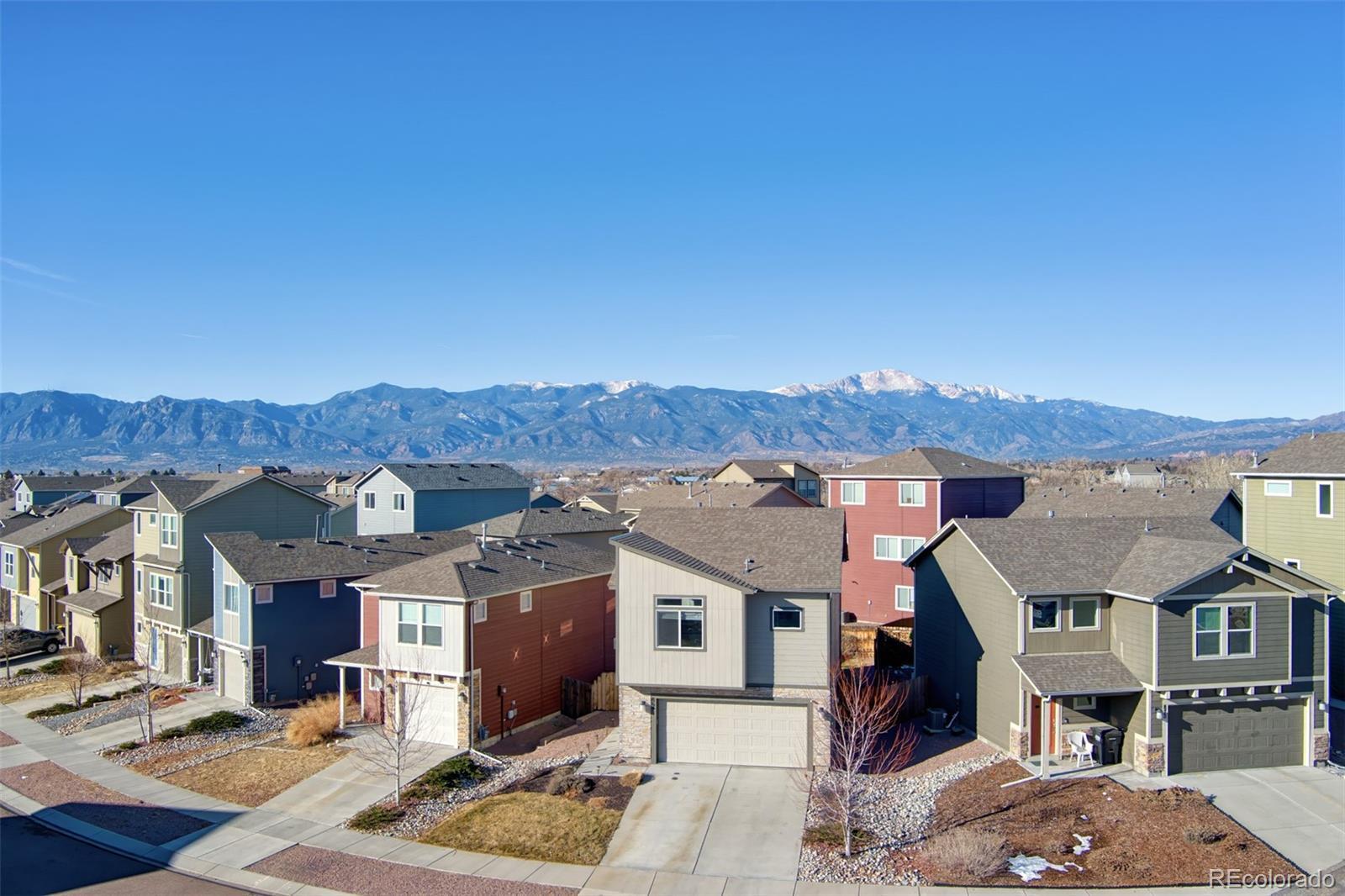 Welcome home to this modern 2-bedroom, 3-bath single-family residence located in the quiet Patriot Park community. Built in 2019, this well-maintained two-story home offers 1,125 square feet of thoughtfully designed living space, combining contemporary finishes with an efficient, open layout. The upper level features tall ceilings and an open-concept design that allows natural light to flow through the living, dining, and kitchen areas. Luxury vinyl flooring runs throughout the main living spaces, providing durability and a clean, modern look. The kitchen is centered around a peninsula-style island with a breakfast bar, offering additional prep space and casual seating—ideal for everyday living or entertaining. Upgrades new ceiling fans, kitchen back splash and tile in the master bathroom. All major appliances are included, making this home truly move-in ready. The spacious master bedroom includes a walk-in closet with custom shelving and an adjoining bath, while the conveniently located upper-level laundry adds everyday functionality. There is an additional guest bathroom. On the main level, a second bedroom with an adjoining bath offers flexibility for guests, a home office, or multi-generational living. Additional highlights include central air conditioning and an attached 2-car garage. The level lot features rear fencing and low-maintenance landscaping, reinforcing the easy-living appeal. Conveniently located with quick access to major roadways, Peterson Space Force Base, and nearby military installations, the home sits just south of a variety of restaurants and retail shops. Parks and trails along Sand Creek to the west provide easy access to outdoor recreation, while Powers Blvd and Highway 24 offer seamless connectivity throughout Colorado Springs. Don't miss this lovely home!