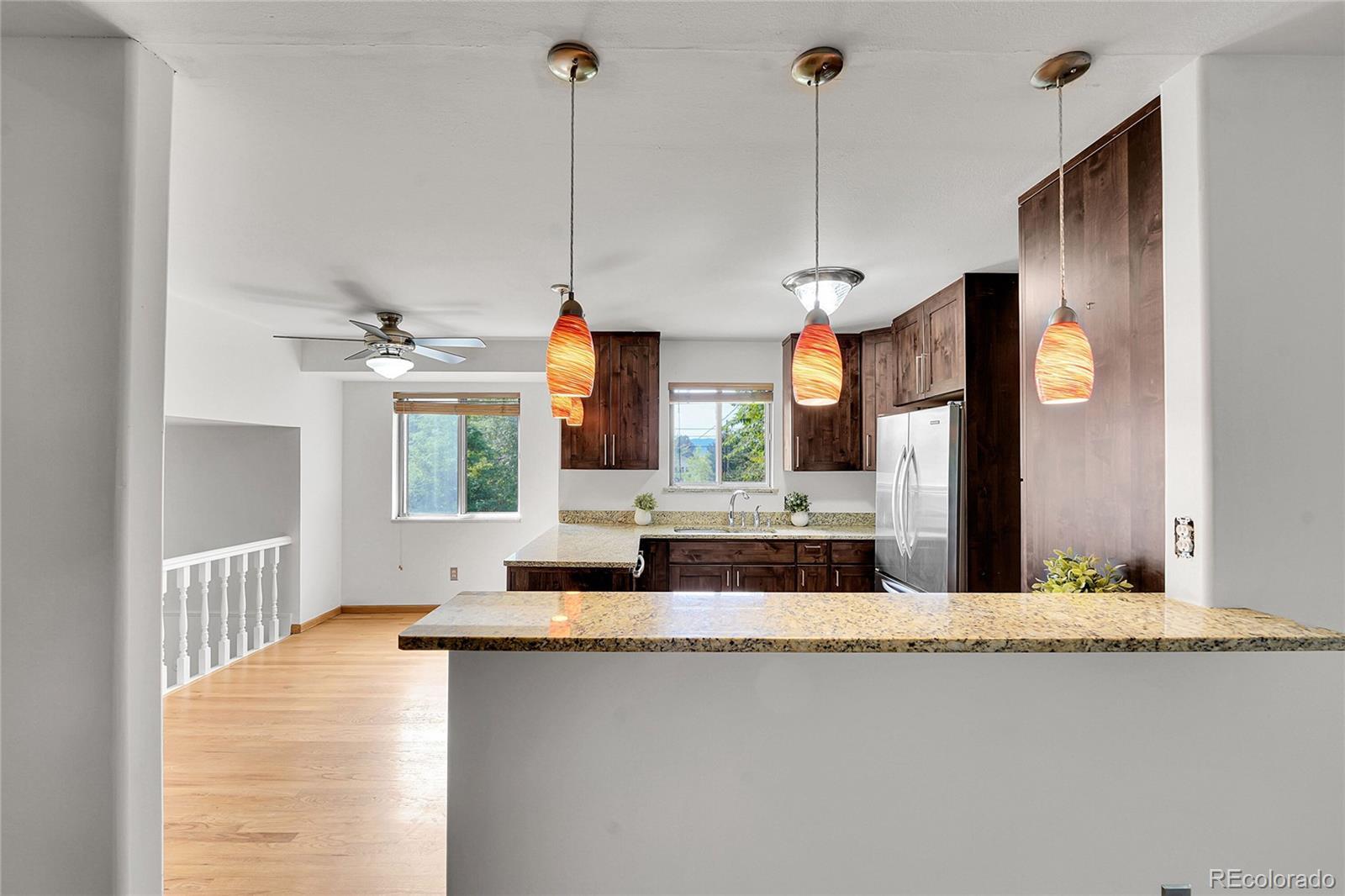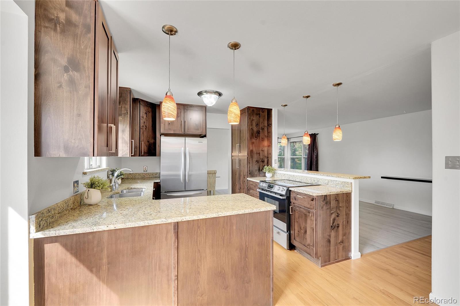 This exceptional home presents a remarkable opportunity for discerning buyers. Spanning 2,358 square feet, this meticulously maintained property offers a perfect balance of elegance and practicality, complemented by breathtaking mountain views that enhance its appeal. Upon entry, one is greeted by a sophisticated foyer leading to a spacious family room adorned with a beamed ceiling and a masonry fireplace, ideal for both entertaining and relaxation. The open-concept layout seamlessly connects the family room to the dining area and a well-appointed kitchen featuring light stone countertops, stainless steel appliances, and a functional peninsula. The primary suite is a standout feature, complete with dual closets and an ensuite bathroom, while additional bedrooms provide flexibility for family or guests. The fully fenced backyard, complete with a sunroom is the perfect space for enjoying outdoor, Colorado relaxation. Notably, the property is equipped with photovoltaic, solar panels, contributing to energy efficiency and sustainability. This home provides convenient access to local amenities, parks, and exceptional schools. This property presents a unique opportunity for prospective buyers looking to invest in a home that combines modern living with the tranquility of the Colorado landscape.