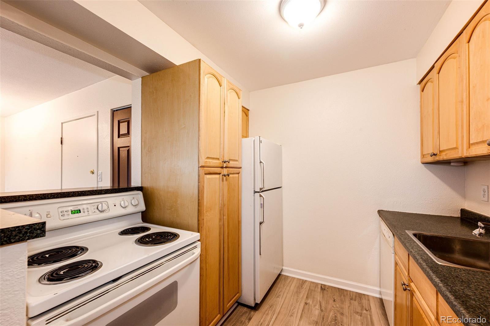 This beautifully updated 2-bedroom, 1-bath condo offers the perfect blend of comfort and style. Step inside to an open-concept living space with brand-new carpet throughout, creating a fresh and inviting atmosphere. The kitchen has been thoughtfully updated with sleek new vinyl flooring, modern cabinetry—including a convenient pantry-and all appliances included, making meal prep a breeze. The adjoining family room features plush new carpeting, perfect for relaxation and entertaining. The spacious layout flows seamlessly, offering an ideal space for both everyday living and hosting guests. From the family room, step out onto your own private balcony, ideal for enjoying a morning coffee or unwinding after a long day. The full bathroom boasts tile flooring and tub surround, while the well-appointed laundry room includes a washer, dryer, and plenty of cupboard space for added convenience. This condo is located just minutes from Hwy 285, making commuting a breeze, and is also close to shopping for ultimate convenience. The well-maintained grounds feature green grass and mature trees, providing a peaceful, scenic setting for residents to enjoy. This condo is a move-in ready gem that offers both comfort and convenience.