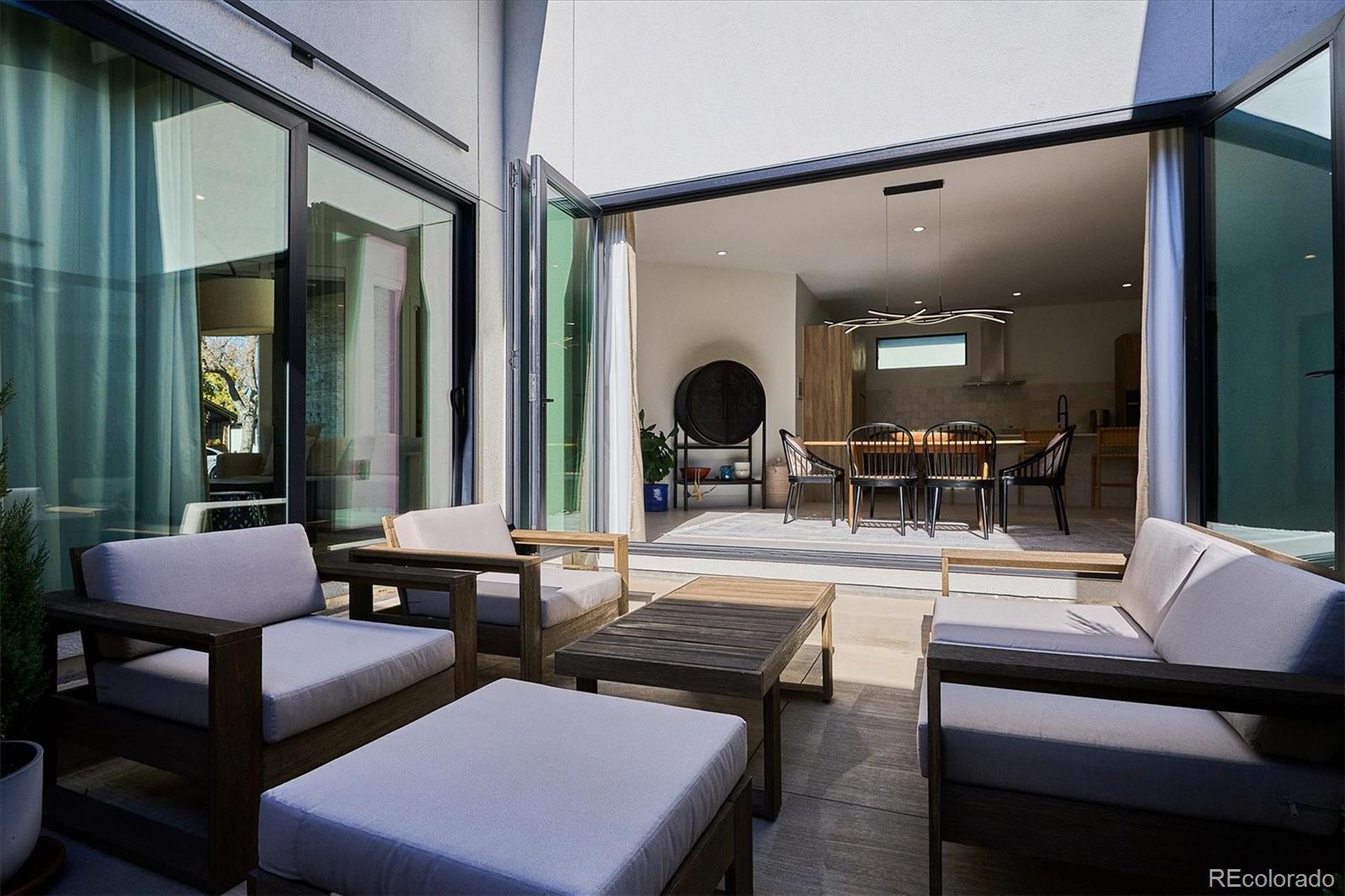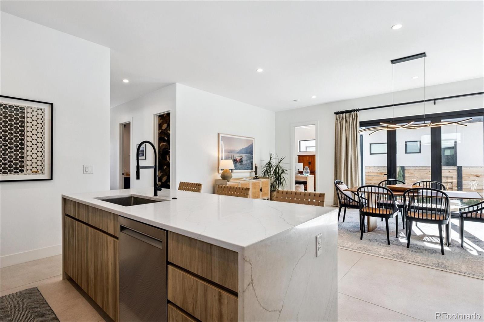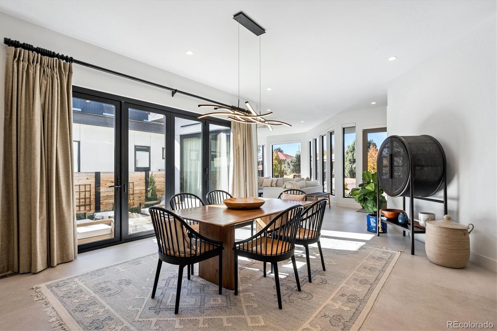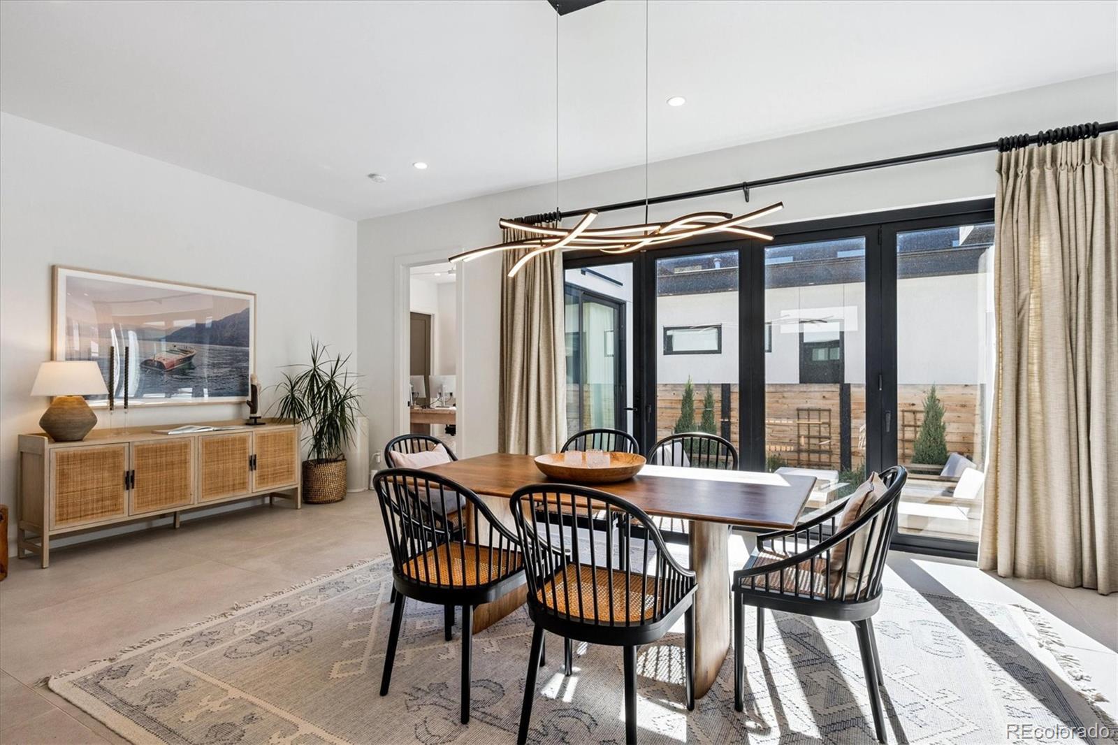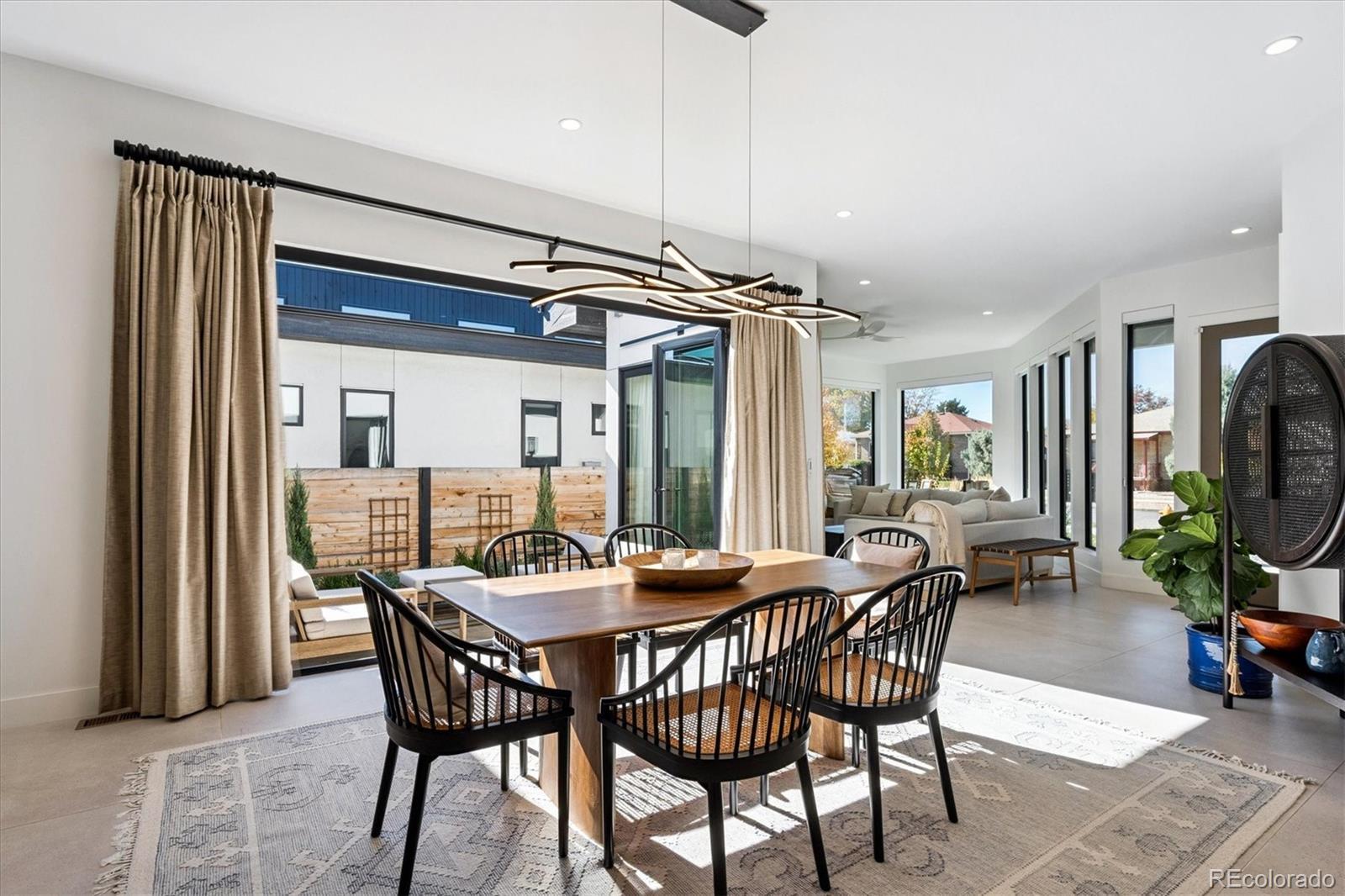 Stunning Mid-Century Modern masterpiece in the heart of Sunnyside, offering ranch-style living at its finest. Filled with natural light from expansive windows, this home showcases an open floor plan designed for effortless everyday living and elegant entertaining. Accordion-style doors create a seamless transition for indoor-outdoor living, leading to a private terrace perfect for relaxing or hosting guests. Designer finishes abound, featuring high-end Porcelanosa tile and thoughtfully curated details throughout. At the heart of the home, the chef’s kitchen impresses with quartz countertops, a waterfall island, Dacor French Door refrigerator, JennAir range top and oven/microwave combo, custom tile backsplash, and upgraded lighting selections—ideal for both cooking and entertaining. The main level includes a luxurious primary suite with walk-in closet and spa-inspired bath complete with standalone tub, dual vanities, and walk-in shower. Two additional bedrooms share a Jack-and-Jill bath, while an exquisite powder room showcases designer wallpaper. Custom curtains in select rooms, Hunter Douglas Roman shades in all bedrooms, and remote-control shades in the primary suite and living room add both function and sophistication, complemented by a whole-house Honeywell steam humidifier. The fully finished basement extends the living space with an expansive recreation room, wet bar with refrigerator and dishwasher, three additional bedrooms, full bath, second laundry hookup, and plush wool carpeting—just another of the home’s many upgrades. Outside, enjoy a professionally designed and landscaped backyard with a custom garden box, perfect for outdoor dining and relaxation. Completing this exceptional property is a detached three-car garage. Ideally located just steps from Rocky Mountain Lake Park and Berkeley Lake Park, and near Tennyson Street, the Highlands, and downtown Denver, this home combines modern elegance, thoughtful upgrades, and an unbeatable Colorado lifestyle.