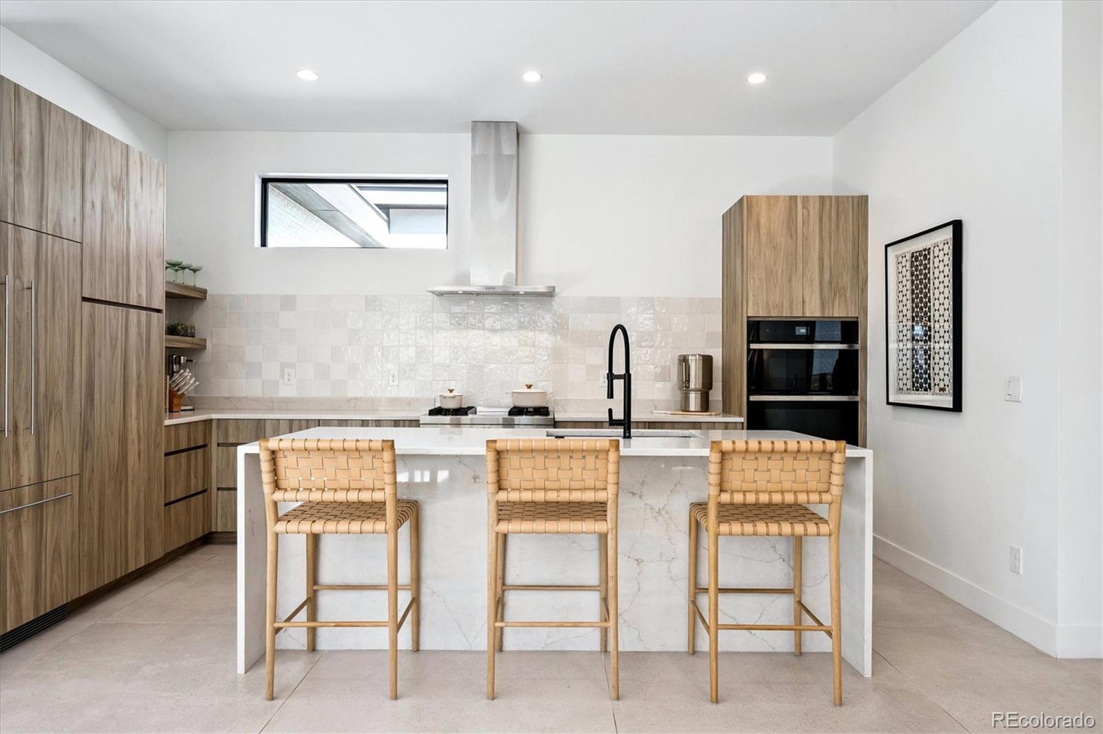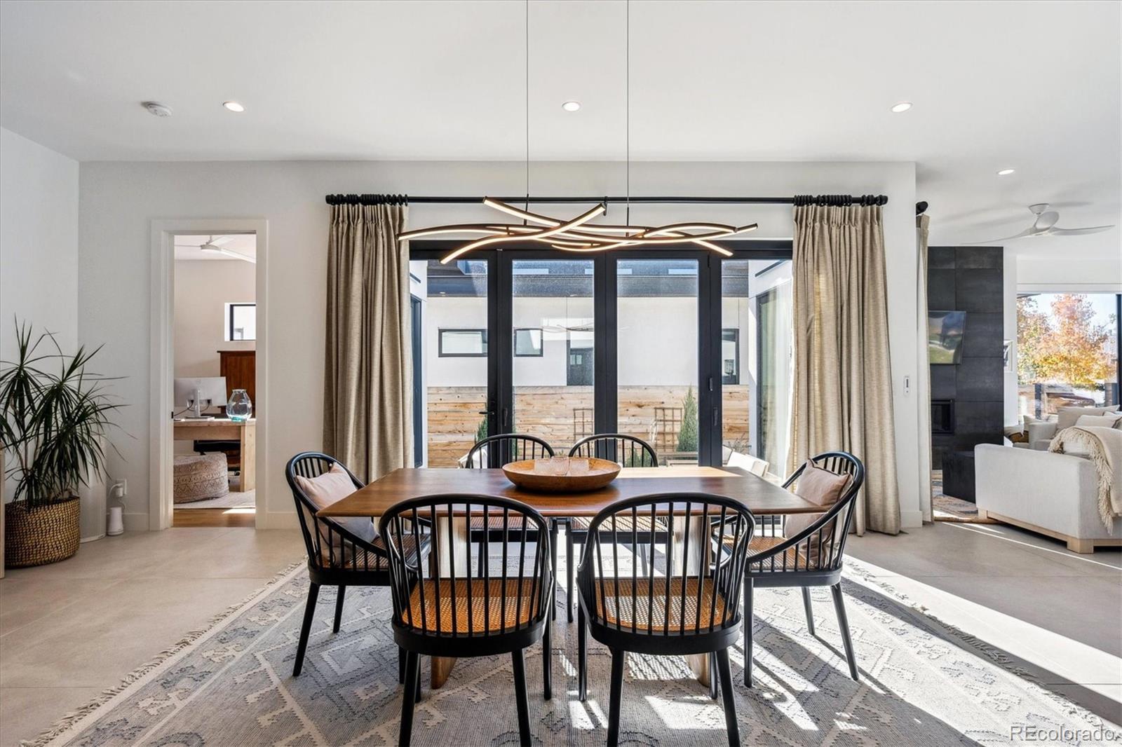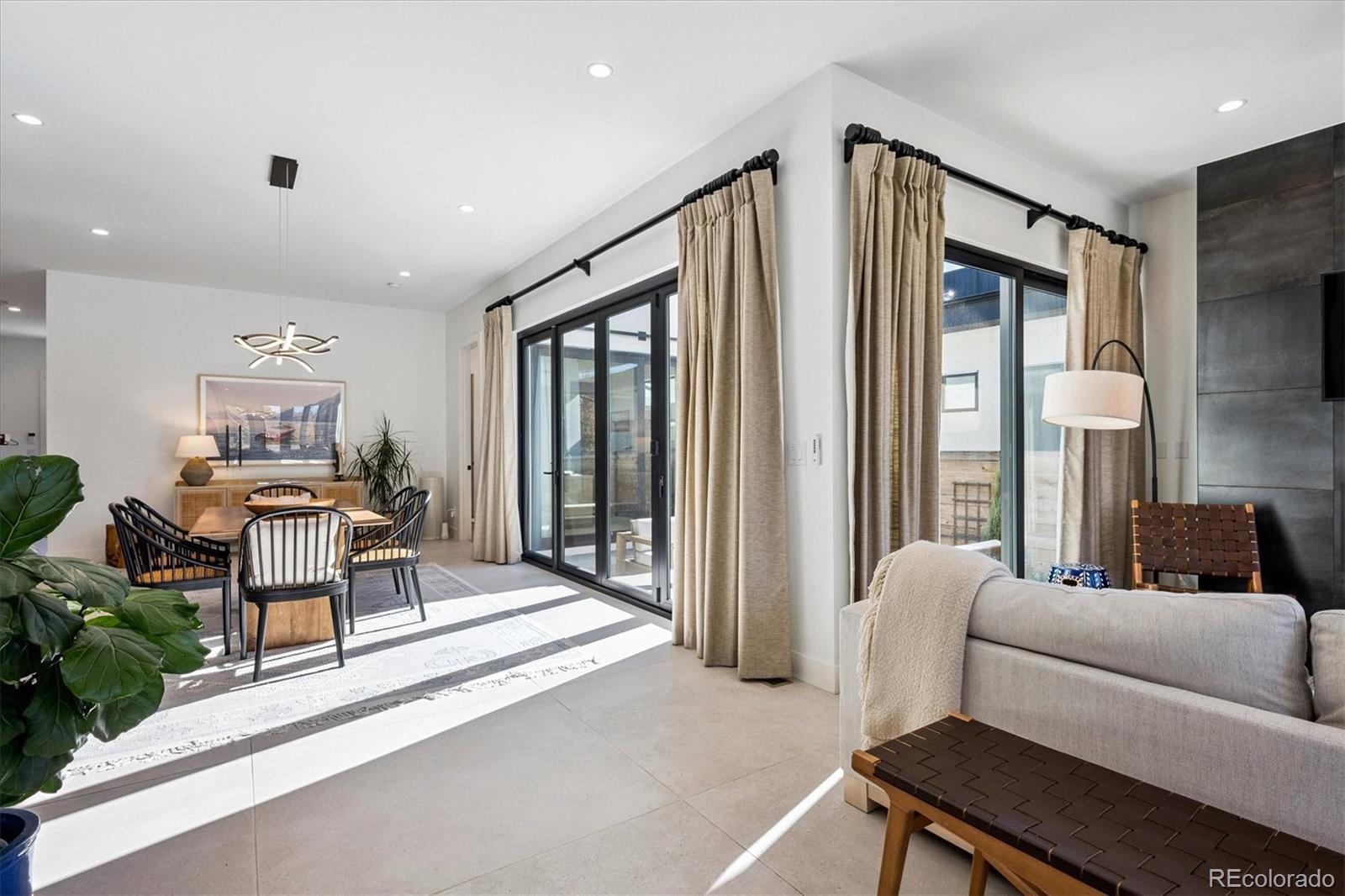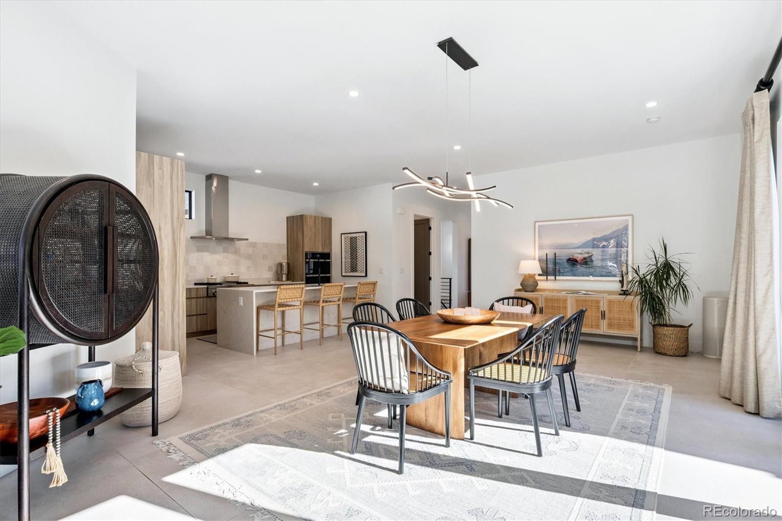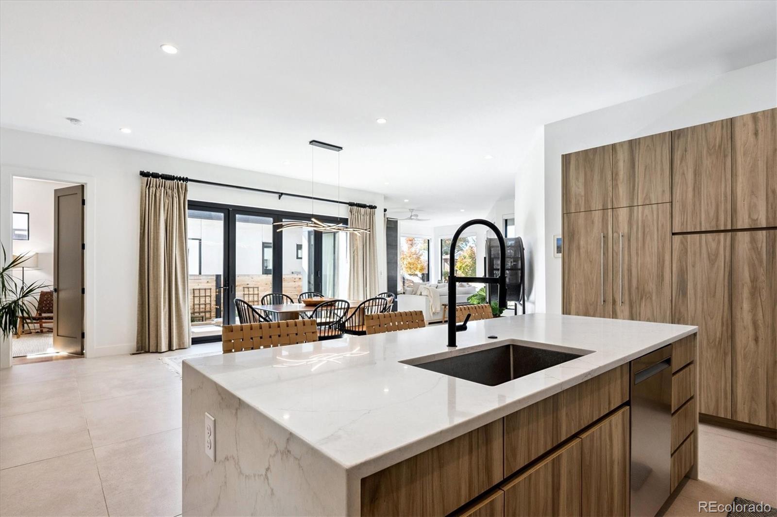 Stunning Mid-Century Modern masterpiece in the heart of Sunnyside, offering ranch-style living at its finest. Filled with natural light from expansive windows, this home showcases an open floor plan designed for effortless everyday living and elegant entertaining. Accordion-style doors create a seamless transition for indoor-outdoor living, leading to a private terrace perfect for relaxing or hosting guests. Designer finishes abound, featuring high-end Porcelanosa tile and thoughtfully curated details throughout. At the heart of the home, the chef’s kitchen impresses with quartz countertops, a waterfall island, Dacor French Door refrigerator, JennAir range top and oven/microwave combo, custom tile backsplash, and upgraded lighting selections—ideal for both cooking and entertaining. The main level includes a luxurious primary suite with walk-in closet and spa-inspired bath complete with standalone tub, dual vanities, and walk-in shower. Two additional bedrooms share a Jack-and-Jill bath, while an exquisite powder room showcases designer wallpaper. Custom curtains in select rooms, Hunter Douglas Roman shades in all bedrooms, and remote-control shades in the primary suite and living room add both function and sophistication, complemented by a whole-house Honeywell steam humidifier. The fully finished basement extends the living space with an expansive recreation room, wet bar with refrigerator and dishwasher, three additional bedrooms, full bath, second laundry hookup, and plush wool carpeting—just another of the home’s many upgrades. Outside, enjoy a professionally designed and landscaped backyard with a custom garden box, perfect for outdoor dining and relaxation. Completing this exceptional property is a detached three-car garage. Ideally located just steps from Rocky Mountain Lake Park and Berkeley Lake Park, and near Tennyson Street, the Highlands, and downtown Denver, this home combines modern elegance, thoughtful upgrades, and an unbeatable Colorado lifestyle.