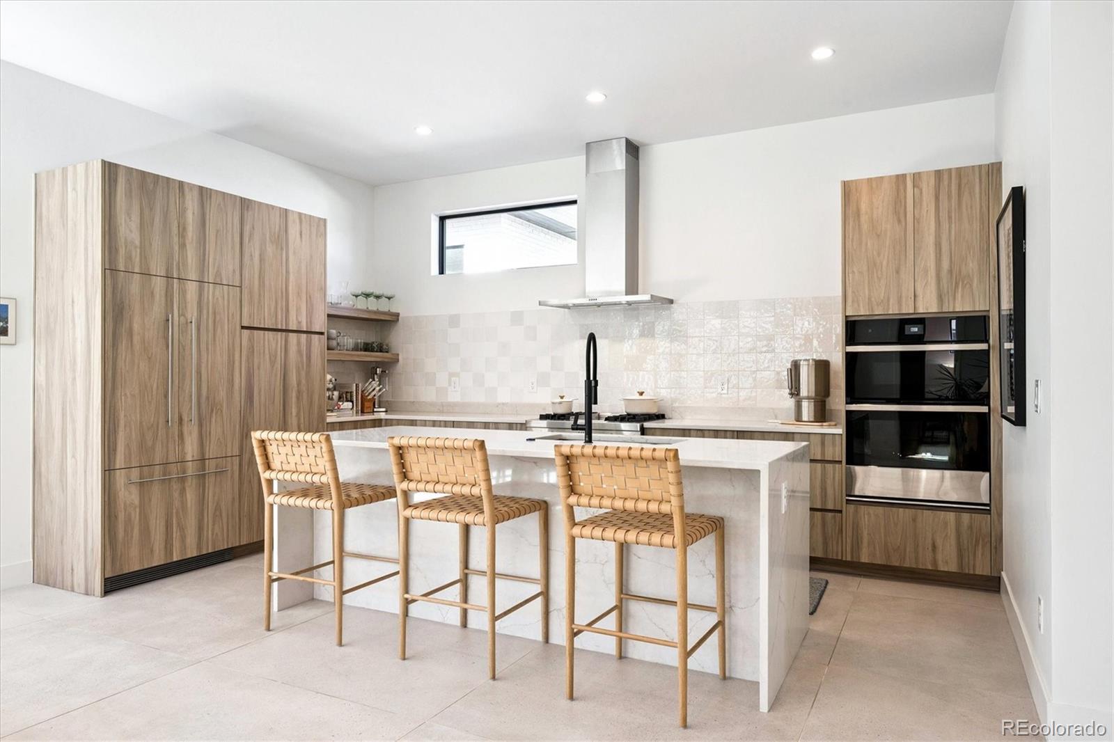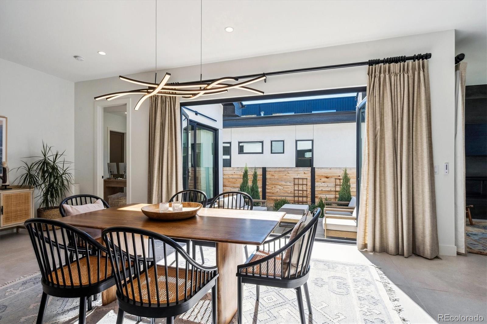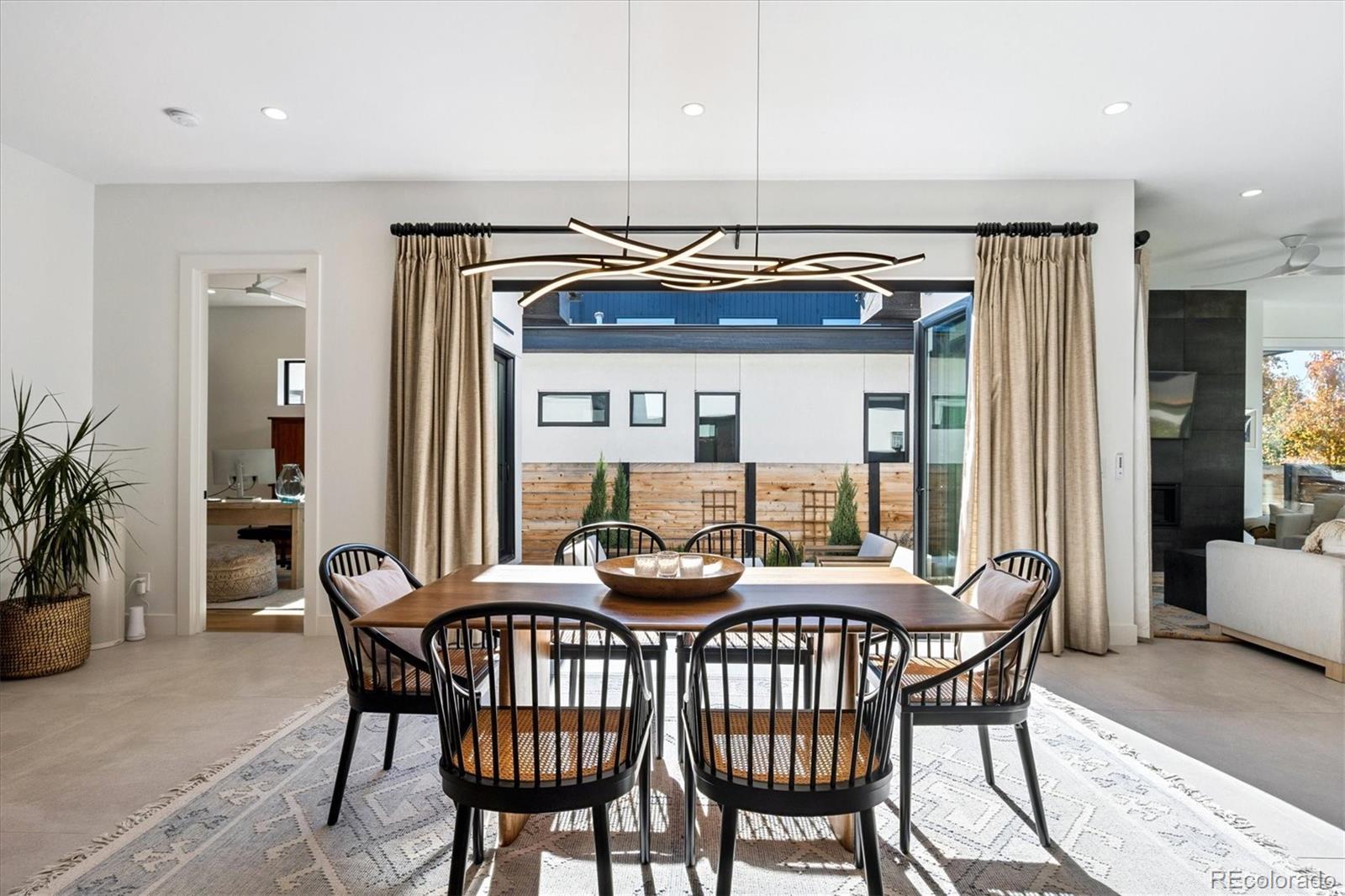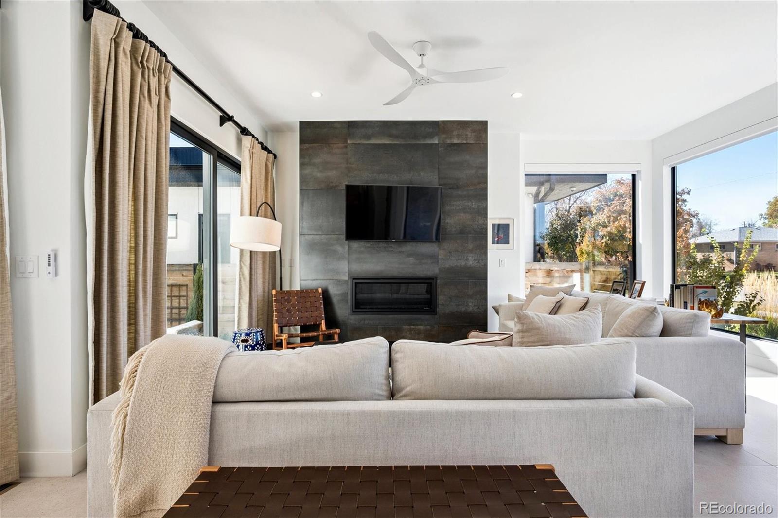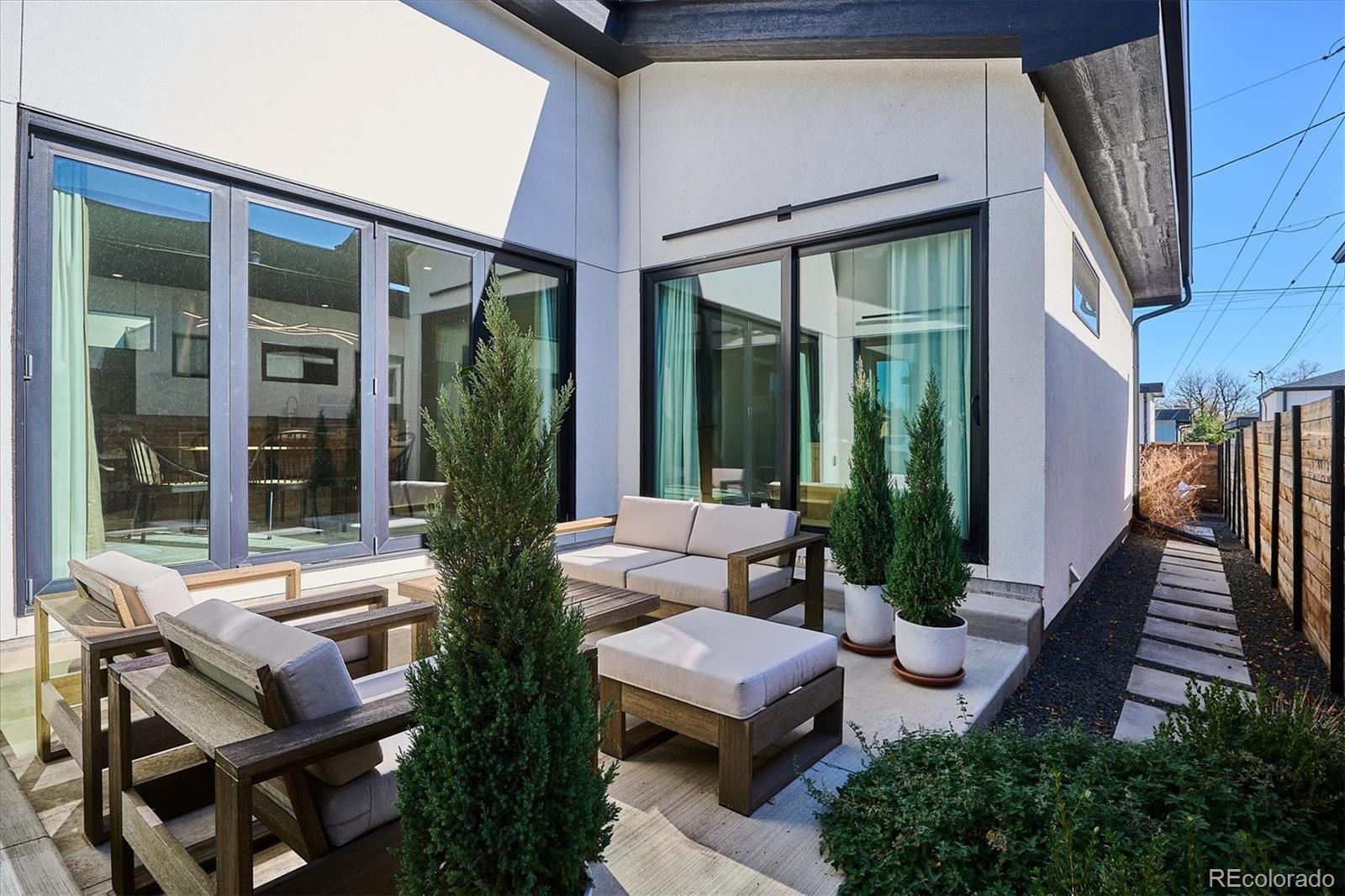 Stunning Mid-Century Modern masterpiece in the heart of Sunnyside, offering ranch-style living at its finest. Filled with natural light from expansive windows, this home showcases an open floor plan designed for effortless everyday living and elegant entertaining. Accordion-style doors create a seamless transition for indoor-outdoor living, leading to a private terrace perfect for relaxing or hosting guests. Designer finishes abound, featuring high-end Porcelanosa tile and thoughtfully curated details throughout. At the heart of the home, the chef’s kitchen impresses with quartz countertops, a waterfall island, Dacor French Door refrigerator, JennAir range top and oven/microwave combo, custom tile backsplash, and upgraded lighting selections—ideal for both cooking and entertaining. The main level includes a luxurious primary suite with walk-in closet and spa-inspired bath complete with standalone tub, dual vanities, and walk-in shower. Two additional bedrooms share a Jack-and-Jill bath, while an exquisite powder room showcases designer wallpaper. Custom curtains in select rooms, Hunter Douglas Roman shades in all bedrooms, and remote-control shades in the primary suite and living room add both function and sophistication, complemented by a whole-house Honeywell steam humidifier. The fully finished basement extends the living space with an expansive recreation room, wet bar with refrigerator and dishwasher, three additional bedrooms, full bath, second laundry hookup, and plush wool carpeting—just another of the home’s many upgrades. Outside, enjoy a professionally designed and landscaped backyard with a custom garden box, perfect for outdoor dining and relaxation. Completing this exceptional property is a detached three-car garage. Ideally located just steps from Rocky Mountain Lake Park and Berkeley Lake Park, and near Tennyson Street, the Highlands, and downtown Denver, this home combines modern elegance, thoughtful upgrades, and an unbeatable Colorado lifestyle.