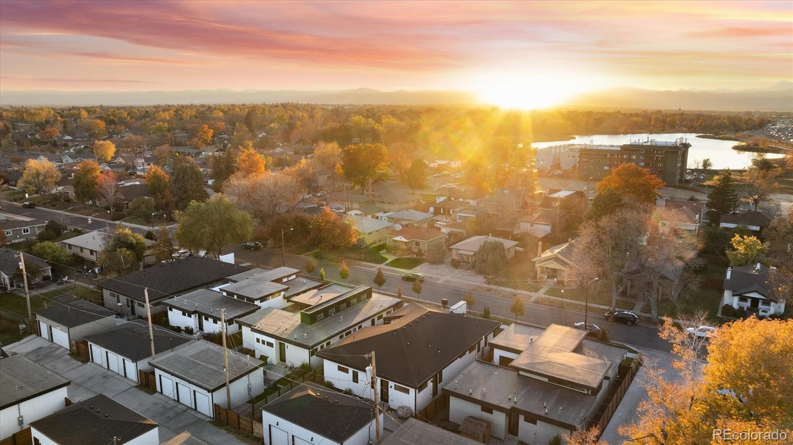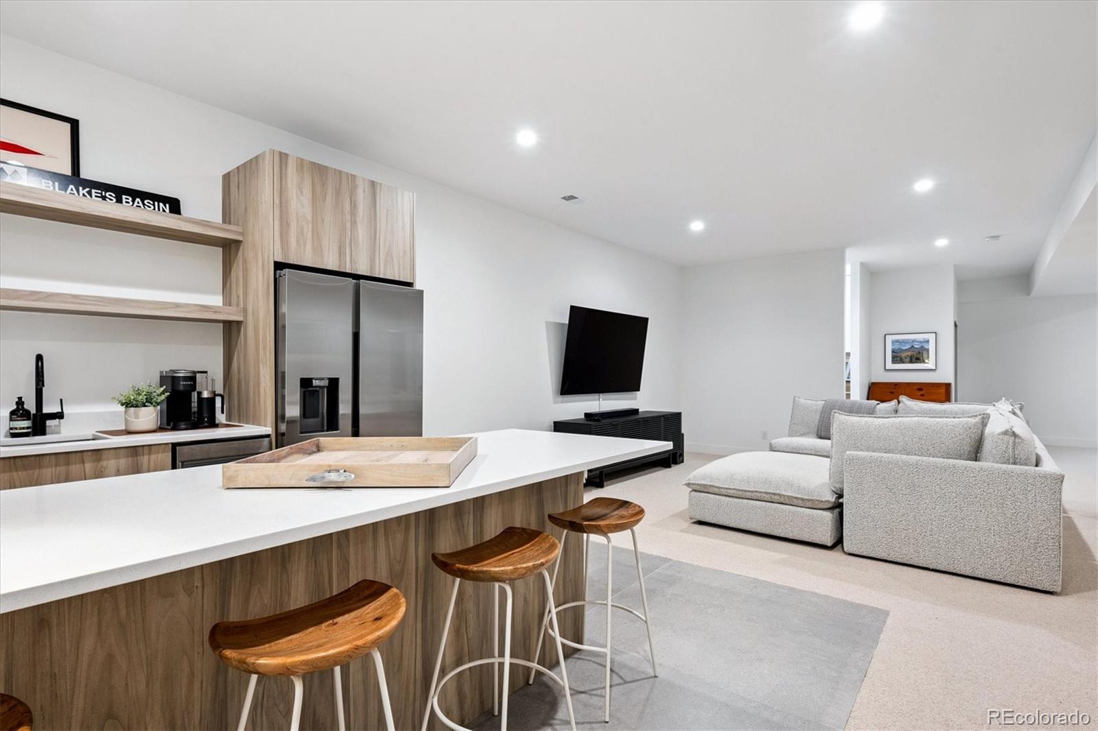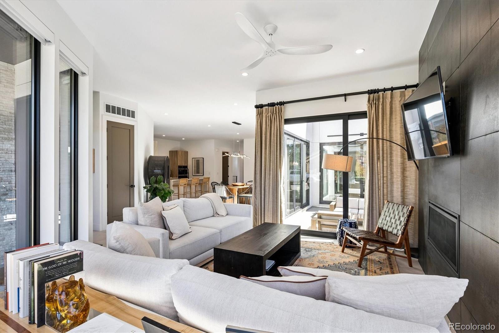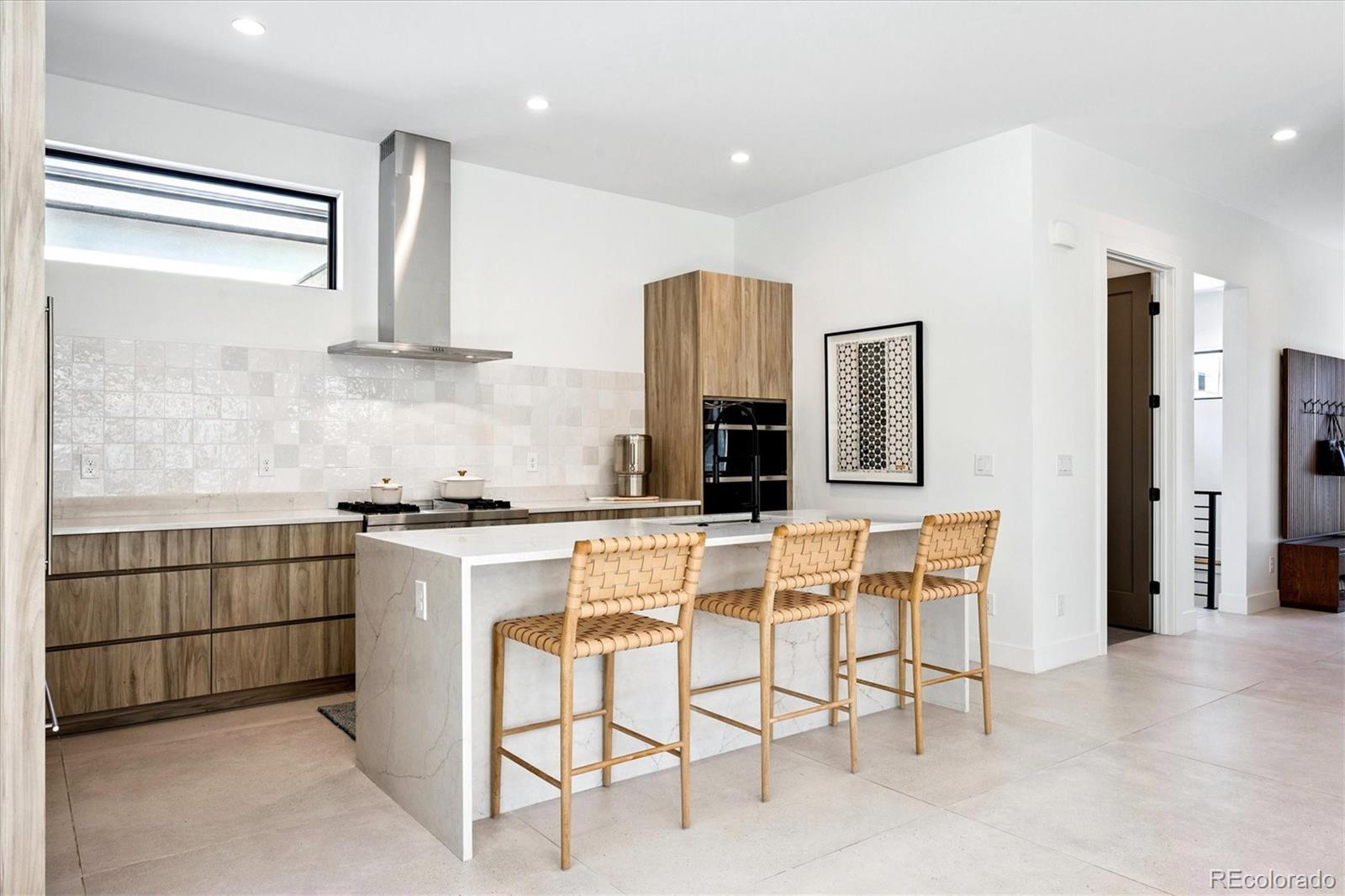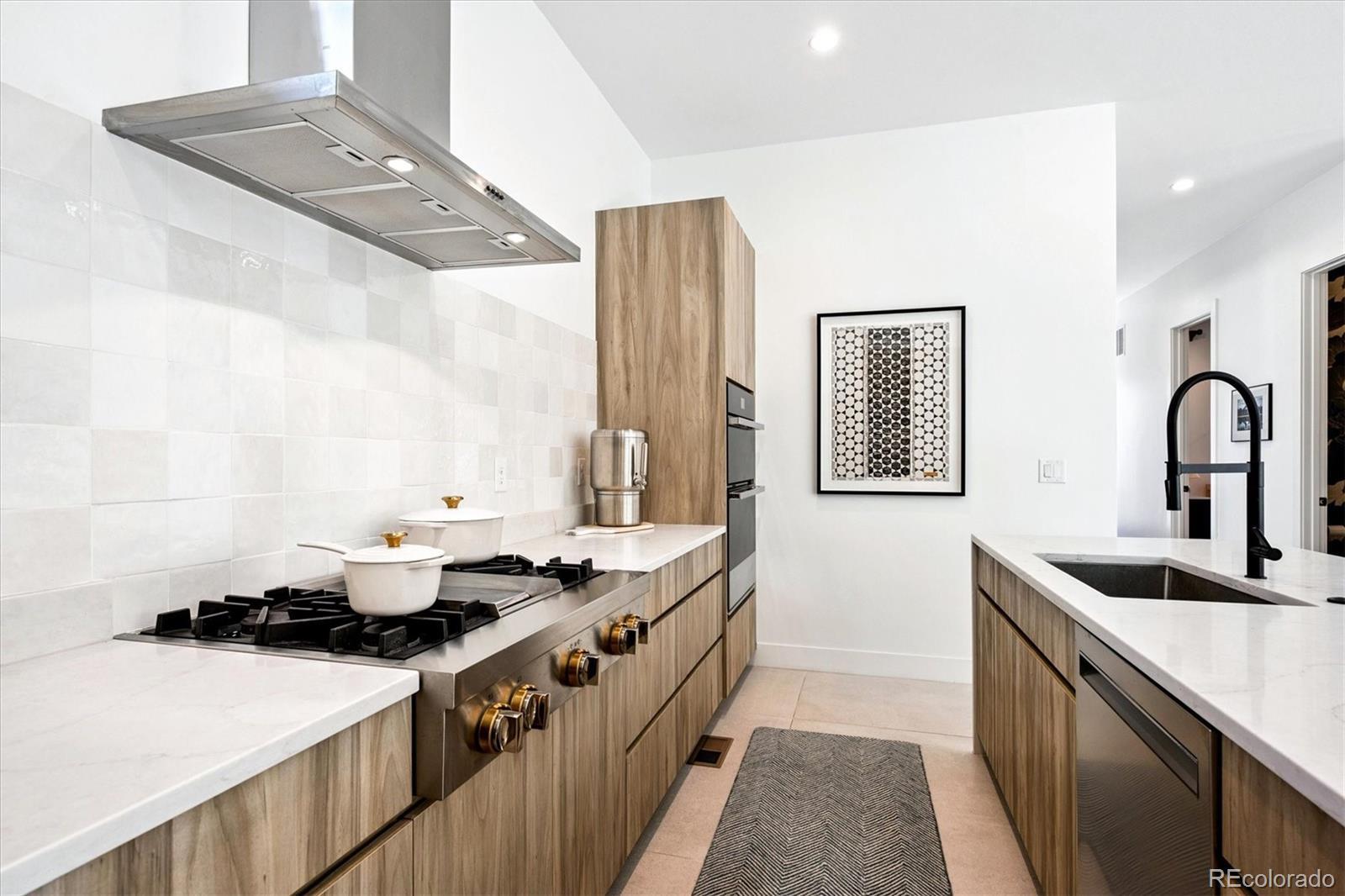Stunning Mid-Century Modern masterpiece in the heart of Sunnyside, offering ranch-style living at its finest. Filled with natural light from expansive windows, this home showcases an open floor plan designed for effortless everyday living and elegant entertaining. Accordion-style doors create a seamless transition for indoor-outdoor living, leading to a private terrace perfect for relaxing or hosting guests. Designer finishes abound, featuring high-end Porcelanosa tile and thoughtfully curated details throughout. At the heart of the home, the chef’s kitchen impresses with quartz countertops, a waterfall island, Dacor French Door refrigerator, JennAir range top and oven/microwave combo, custom tile backsplash, and upgraded lighting selections—ideal for both cooking and entertaining. The main level includes a luxurious primary suite with walk-in closet and spa-inspired bath complete with standalone tub, dual vanities, and walk-in shower. Two additional bedrooms share a Jack-and-Jill bath, while an exquisite powder room showcases designer wallpaper. Custom curtains in select rooms, Hunter Douglas Roman shades in all bedrooms, and remote-control shades in the primary suite and living room add both function and sophistication, complemented by a whole-house Honeywell steam humidifier. The fully finished basement extends the living space with an expansive recreation room, wet bar with refrigerator and dishwasher, three additional bedrooms, full bath, second laundry hookup, and plush wool carpeting—just another of the home’s many upgrades. Outside, enjoy a professionally designed and landscaped backyard with a custom garden box, perfect for outdoor dining and relaxation. Completing this exceptional property is a detached three-car garage. Ideally located just steps from Rocky Mountain Lake Park and Berkeley Lake Park, and near Tennyson Street, the Highlands, and downtown Denver, this home combines modern elegance, thoughtful upgrades, and an unbeatable Colorado lifestyle.