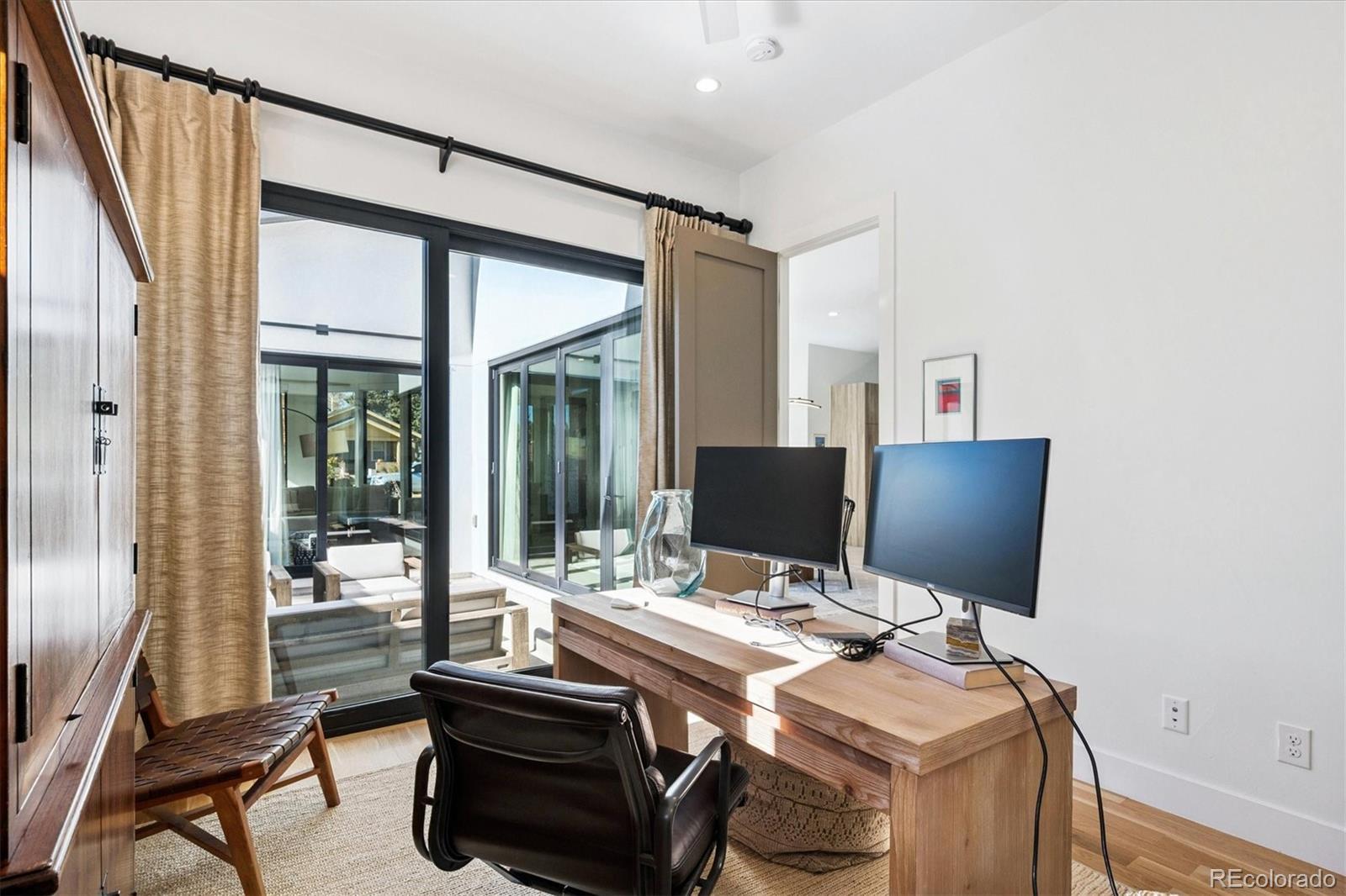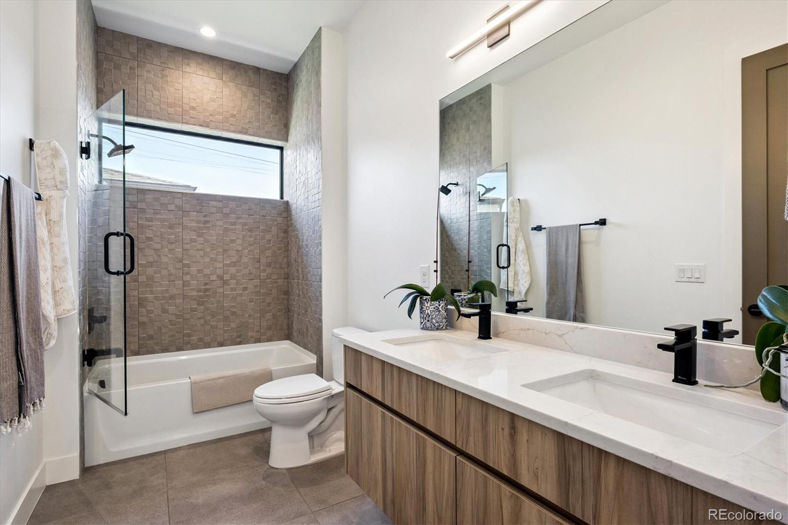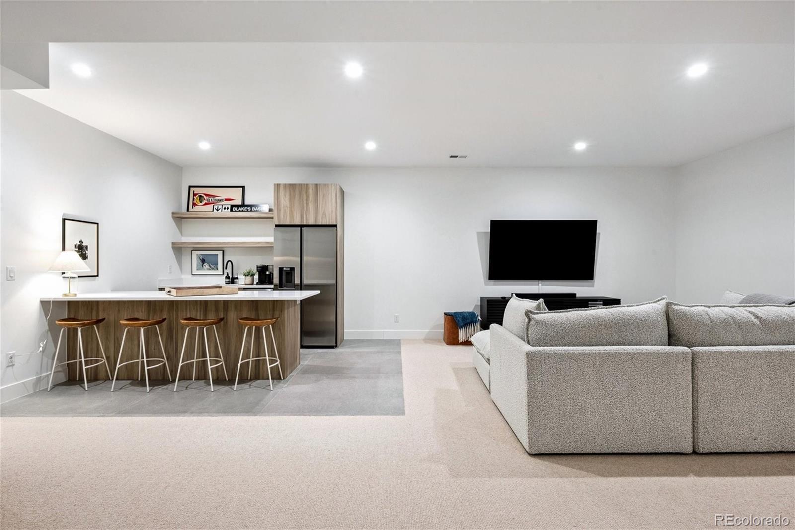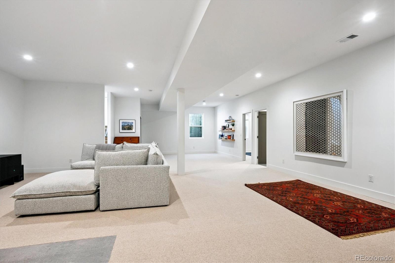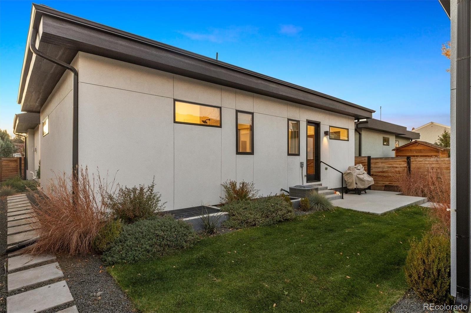 Stunning Mid-Century Modern masterpiece in the heart of Sunnyside, offering ranch-style living at its finest. Filled with natural light from expansive windows, this home showcases an open floor plan designed for effortless everyday living and elegant entertaining. Accordion-style doors create a seamless transition for indoor-outdoor living, leading to a private terrace perfect for relaxing or hosting guests. Designer finishes abound, featuring high-end Porcelanosa tile and thoughtfully curated details throughout. At the heart of the home, the chef’s kitchen impresses with quartz countertops, a waterfall island, Dacor French Door refrigerator, JennAir range top and oven/microwave combo, custom tile backsplash, and upgraded lighting selections—ideal for both cooking and entertaining. The main level includes a luxurious primary suite with walk-in closet and spa-inspired bath complete with standalone tub, dual vanities, and walk-in shower. Two additional bedrooms share a Jack-and-Jill bath, while an exquisite powder room showcases designer wallpaper. Custom curtains in select rooms, Hunter Douglas Roman shades in all bedrooms, and remote-control shades in the primary suite and living room add both function and sophistication, complemented by a whole-house Honeywell steam humidifier. The fully finished basement extends the living space with an expansive recreation room, wet bar with refrigerator and dishwasher, three additional bedrooms, full bath, second laundry hookup, and plush wool carpeting—just another of the home’s many upgrades. Outside, enjoy a professionally designed and landscaped backyard with a custom garden box, perfect for outdoor dining and relaxation. Completing this exceptional property is a detached three-car garage. Ideally located just steps from Rocky Mountain Lake Park and Berkeley Lake Park, and near Tennyson Street, the Highlands, and downtown Denver, this home combines modern elegance, thoughtful upgrades, and an unbeatable Colorado lifestyle.