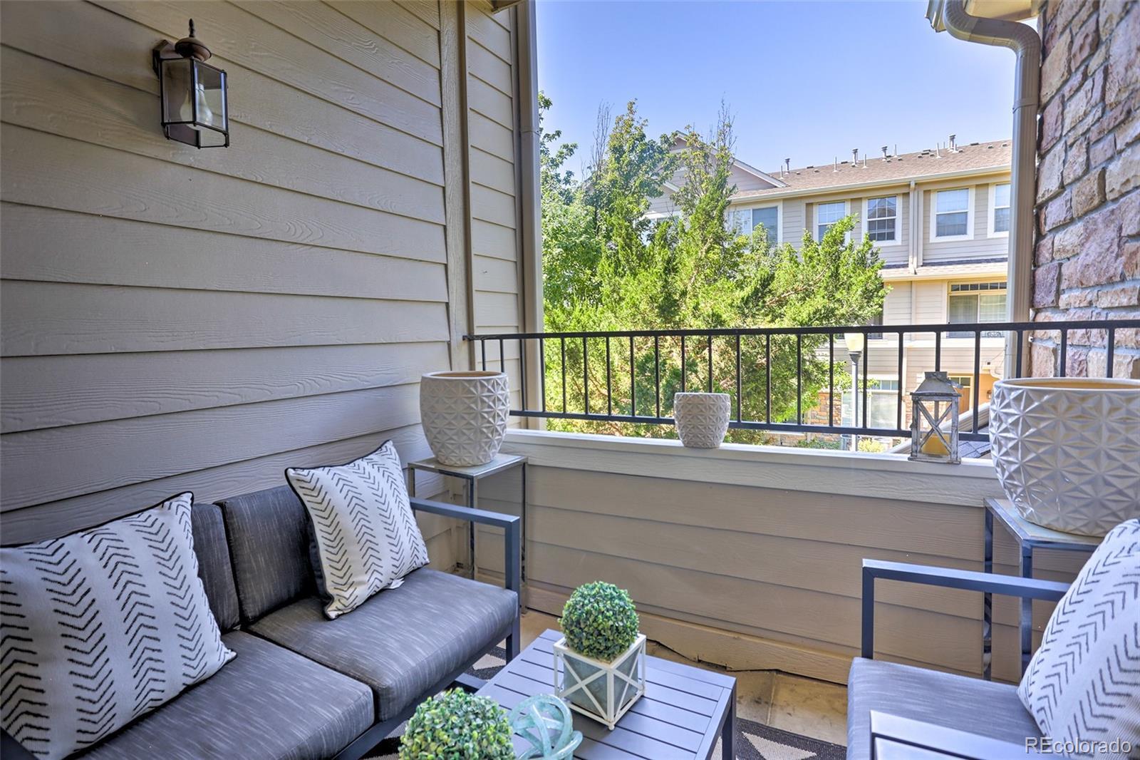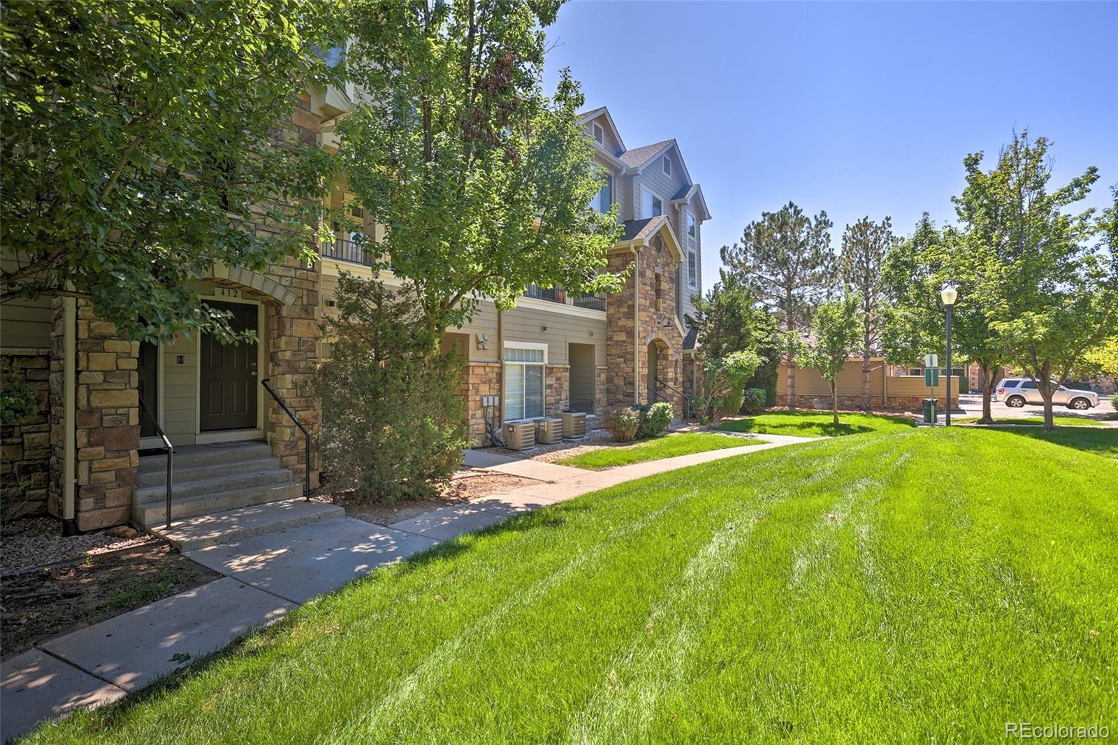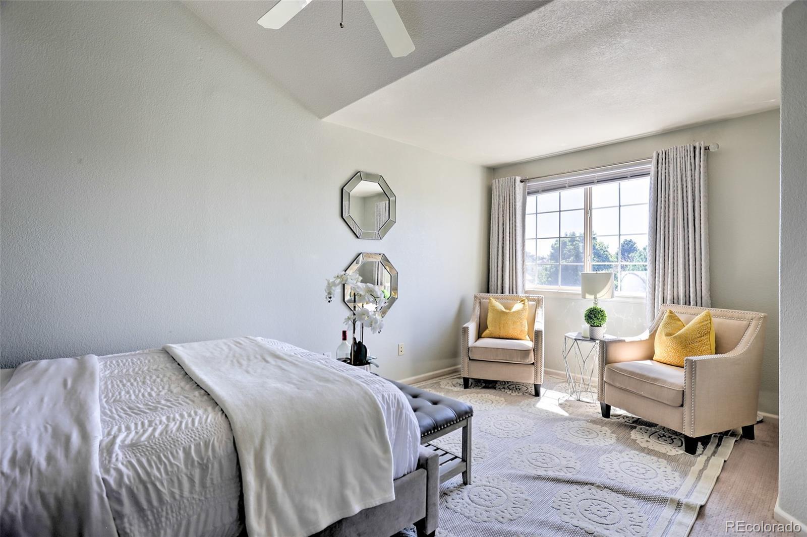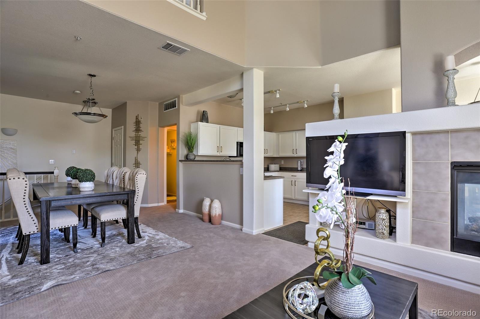 Welcome home to this show-stopping, top-floor unit in this well-maintained community zoned for the highly sought-after Cherry Creek school system. One quick flight of stairs welcomes you to the open-design living area with a gas fireplace for cozy Winter days, stunning high ceilings, a private covered patio, large windows with south-facing natural light flooding in, gorgeous and clean carpet, as well as a guest bath. The lofted second floor features two full baths and bedrooms including a primary suite with walk-in closet. Two reserved parking spots included, one in a private one-car garage and one uncovered outdoor. The community features a gorgeous outdoor pool and manicured green areas as well as the convenience of being close to Costco, Target, and numerous dining options, along with parks, playgrounds and easy access to highway 225 and public transportation. Well-behaved pets welcome. Contact us today to schedule your showing! The pictures don't do it justice, it's even better in person!