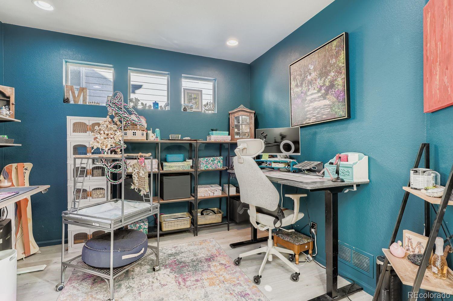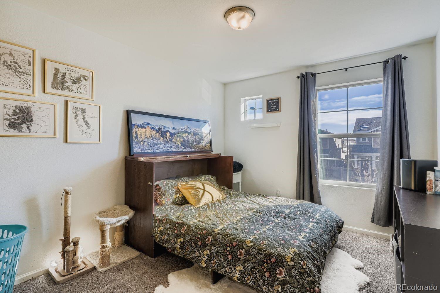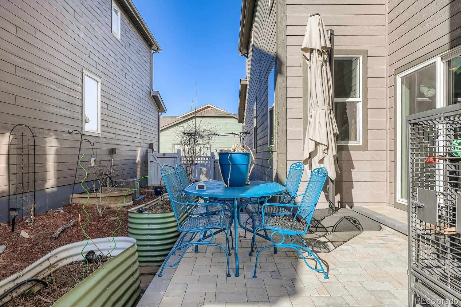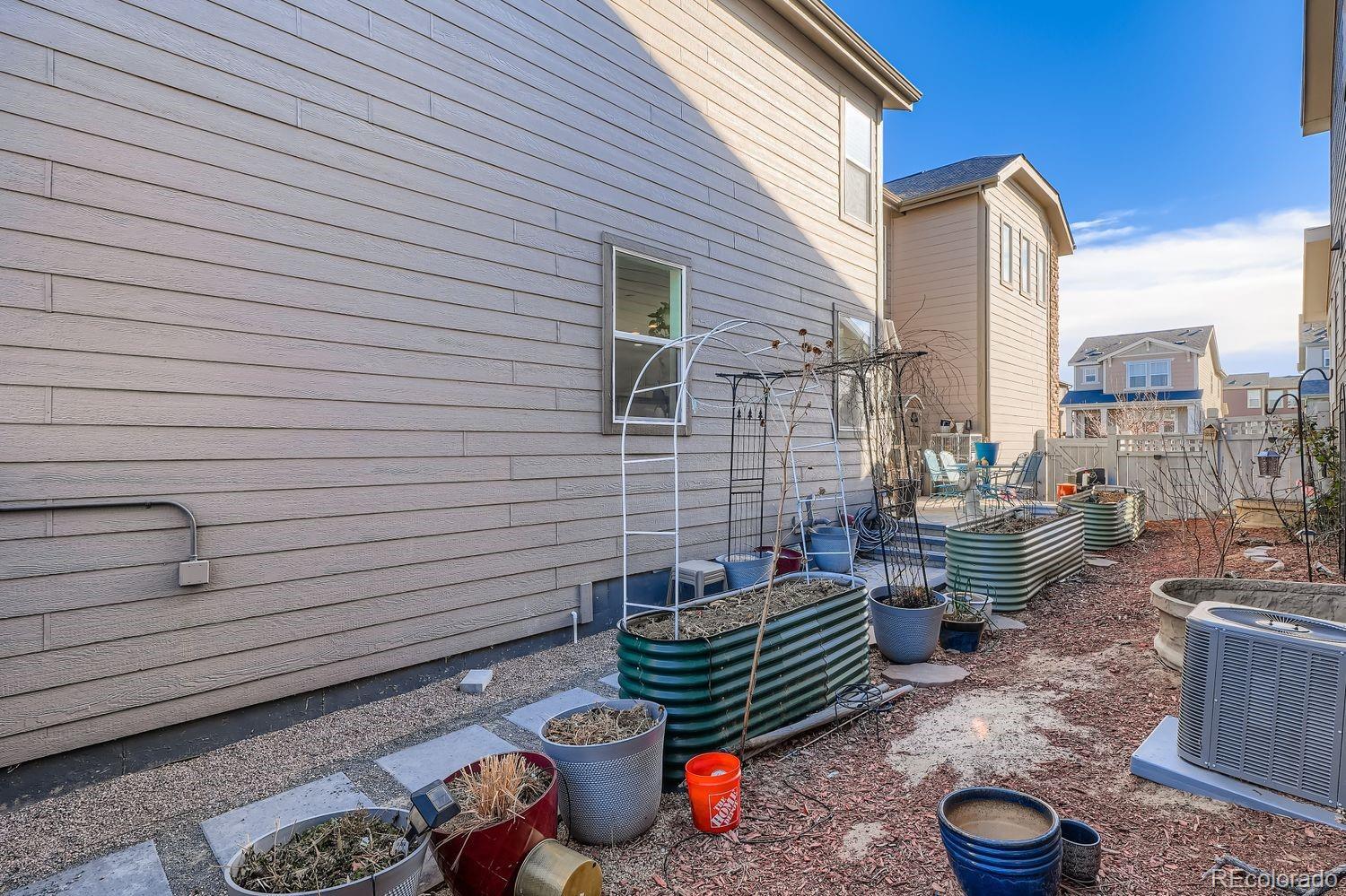 Welcome home to this fabulous 2021 home that is filled with abundant east and south-facing natural light, perfect for plant lovers and quicker snow melt. This thoughtfully designed home blends beautiful finishes, smart upgrades, low-maintenance living, comfort, functionality, and modern convenience to fit anyone’s lifestyle. The state-of-the-art kitchen flows seamlessly into the main living area, and is ideal for everyday living and entertaining. The kitchen island and counters glimmer with white quartz, and the island has bar seating and extra storage adding to the already-generous storage space. The natural light pours through the home and highlights the eye-catching staircase that opens to a cozy loft, perfect for a gaming area, media space, or additional lounge. A dedicated downstairs office is ideal for remote work, home library, etc. The spacious primary suite is drenched in natural light, and includes a custom closet, offering style and thoughtful organization. Smart convenience continues with keyless garage entry and keyless front door entry with fingerprint access, combining ease and security. The solar panels reduce energy costs and improve energy efficiency. The deliberately designed outdoor space features mostly drought-tolerant landscaping that provides vibrant summer color with little upkeep. A peaceful garden area in the side yard is accessible through the glass sliding door just feet from the kitchen, and opens to a patio perfect for a grill and outdoor dining. Irrigated raised garden boxes make it easy to grow flowers, herbs, or vegetables. The nearby walking paths in this welcoming neighborhood are perfect for enjoying the outdoors, and nature lovers will never tire of being just a short drive from the Rocky Mountain Arsenal National Wildlife Refuge. This prime location is close to Denver International Airport, the Gaylord, Costco, and restaurants. You’ll also benefit from a new Target and recreation center coming soon.