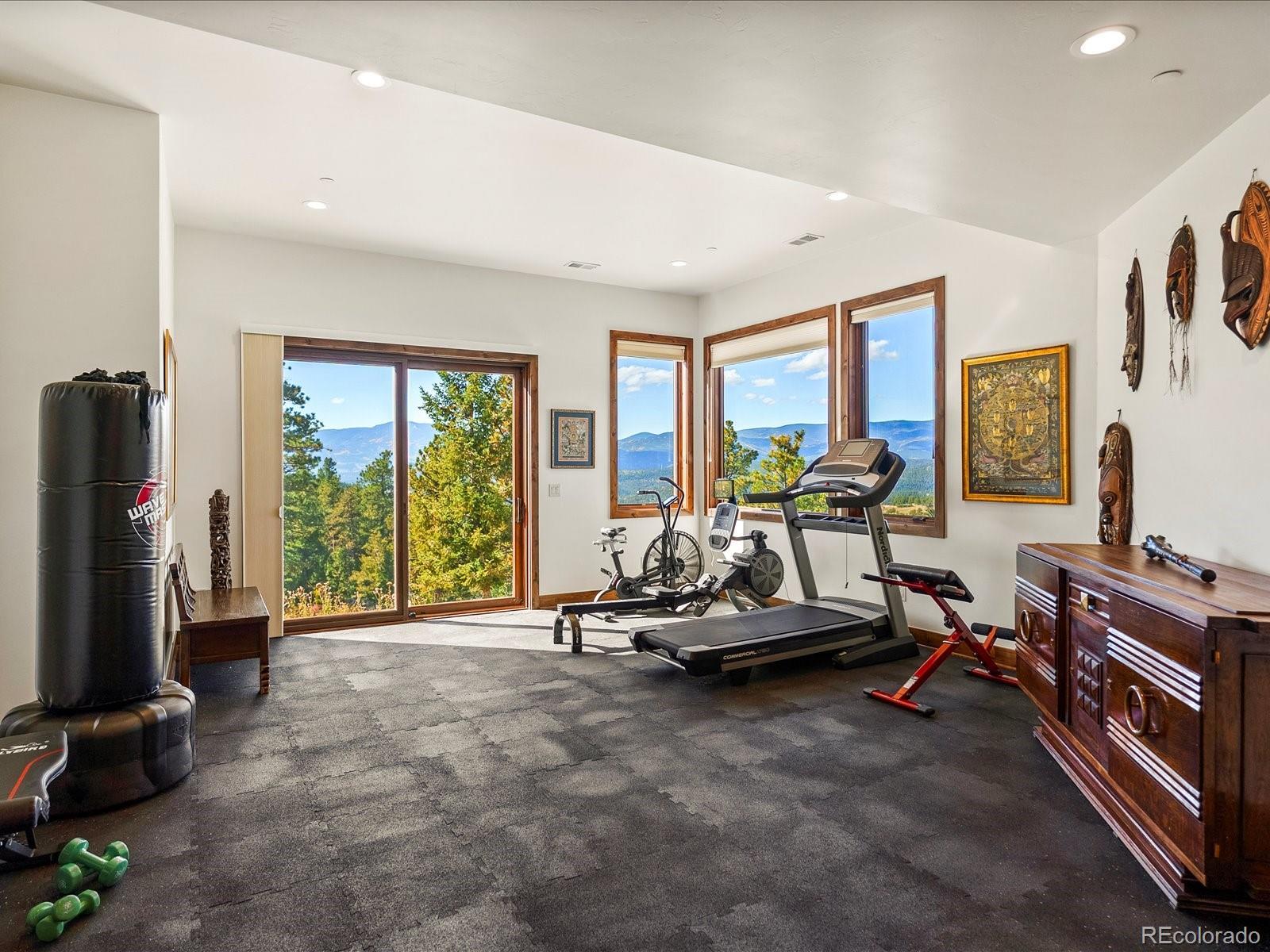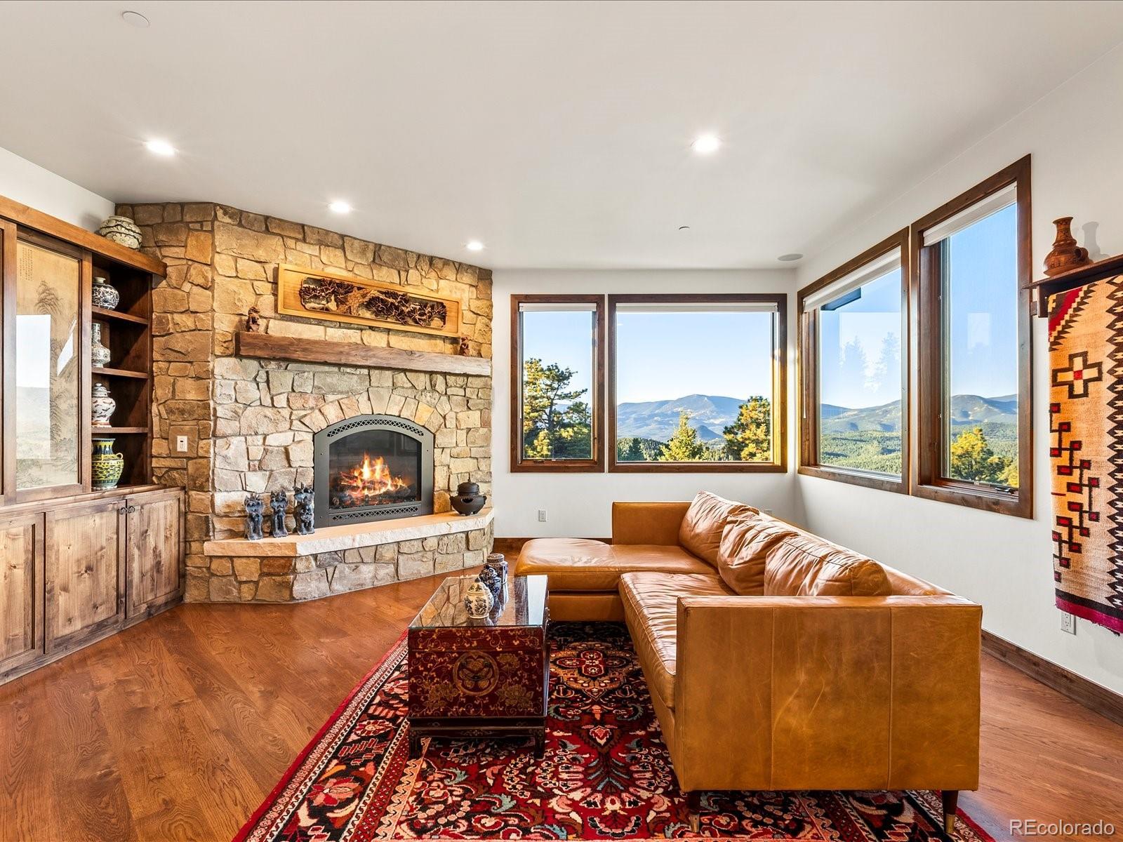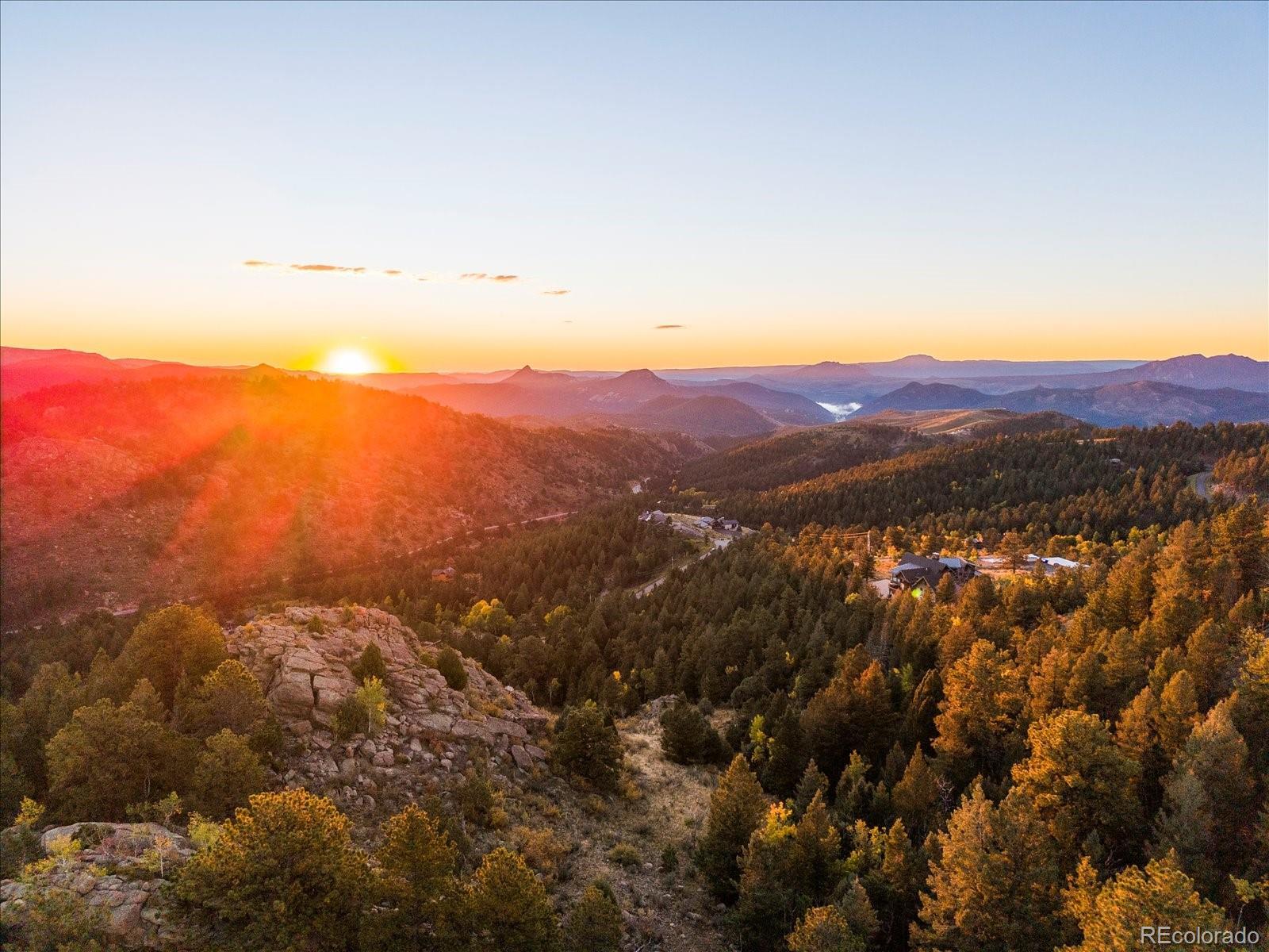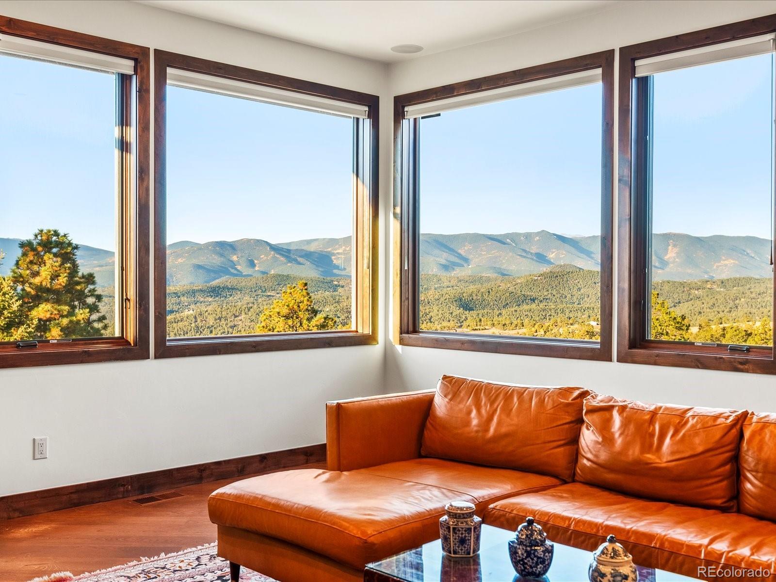 Welcome to 33958 Running Bear Trail, a one-of-a-kind mountain retreat where privacy, artistry, and modern luxury converge. Set atop 20 private acres in the prestigious Reserve at Brauch Ranch, this 2019 masterpiece was custom built to capture awe-inspiring views from nearly every room. With over 7,500 square feet of living space, the residence feels like both a modern gallery and a warm retreat, designed for those who value refined architecture, thoughtful craftsmanship, and an unparalleled connection to nature. Walls of glass frame endless mountain ranges, flooding the interiors with natural light and bringing the outdoors in. Entertaining is elevated with expansive living and dining areas that flow seamlessly onto a covered deck overlooking dramatic vistas. The chef’s kitchen features artistic quartz surfaces, custom cabinetry, a statement island, and a walk-in pantry with rolling ladder. A spa-like primary suite on the main level offers private deck access and a tranquil retreat. Upstairs, generous bedrooms with ensuite and Jack-and-Jill baths offer luxury and privacy for family or guests, alongside a massive loft space ready for creative expression or recreation. The walk-out lower level was designed for living well, complete with a theater, custom library, large office, exercise room, second living space, and abundant storage. This property delivers the rare combination of seclusion and accessibility: less than an hour to downtown Denver yet a world away in atmosphere. If you were to build this home today on this setting, the cost and wait would far exceed its offering. Every element speaks to someone who truly appreciates art, design, and the exclusivity of a private retreat.