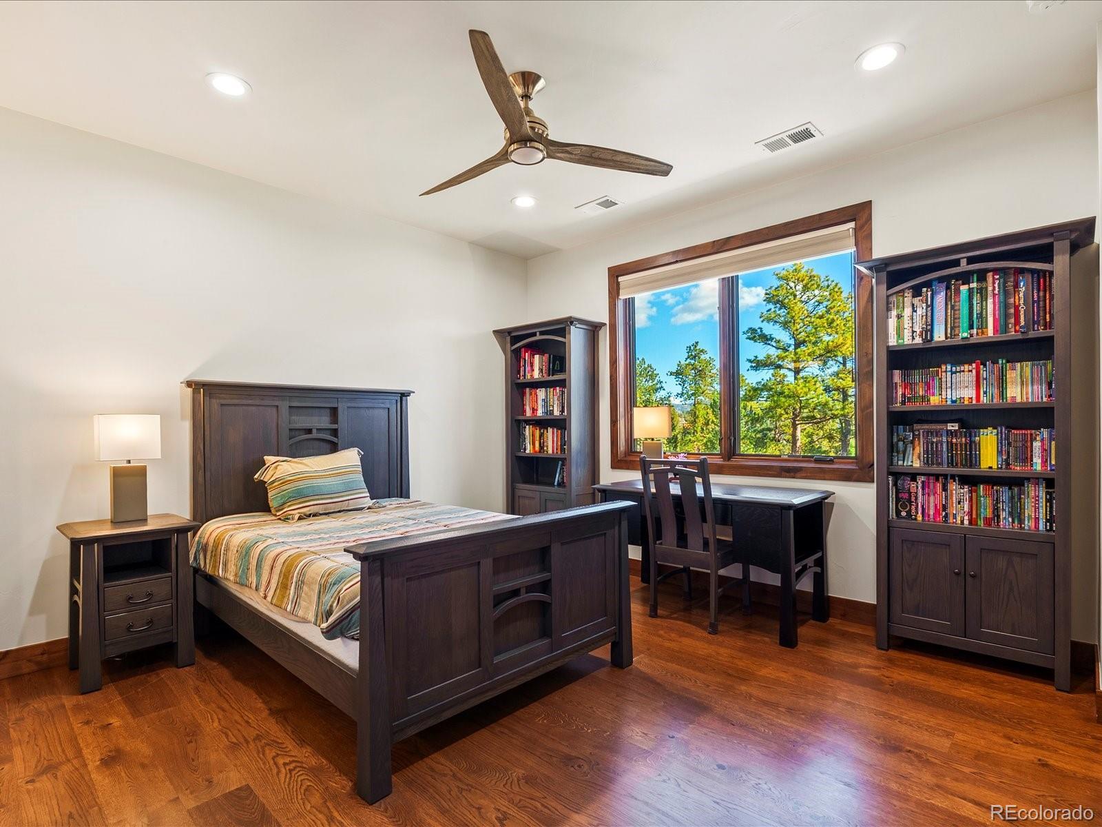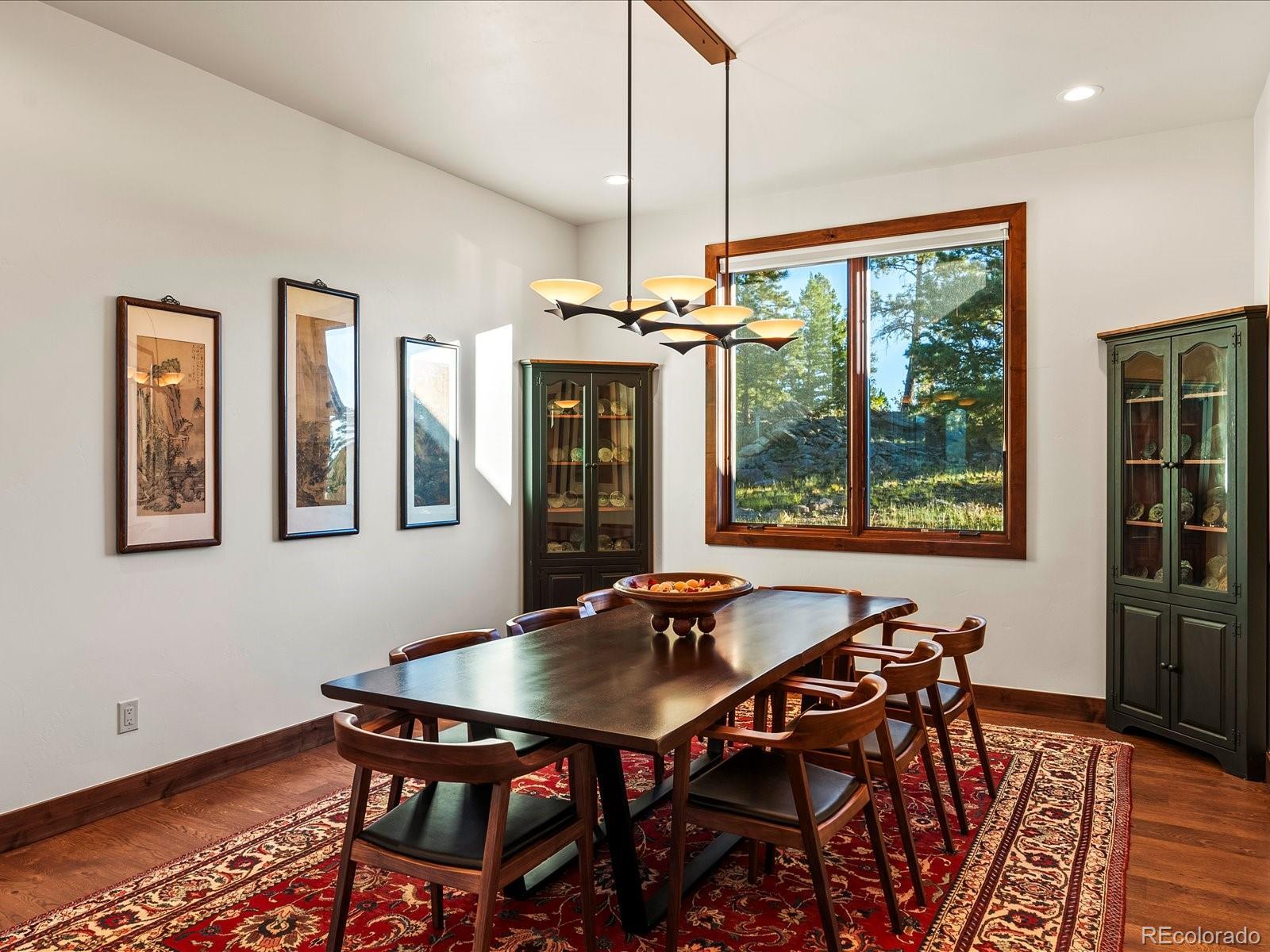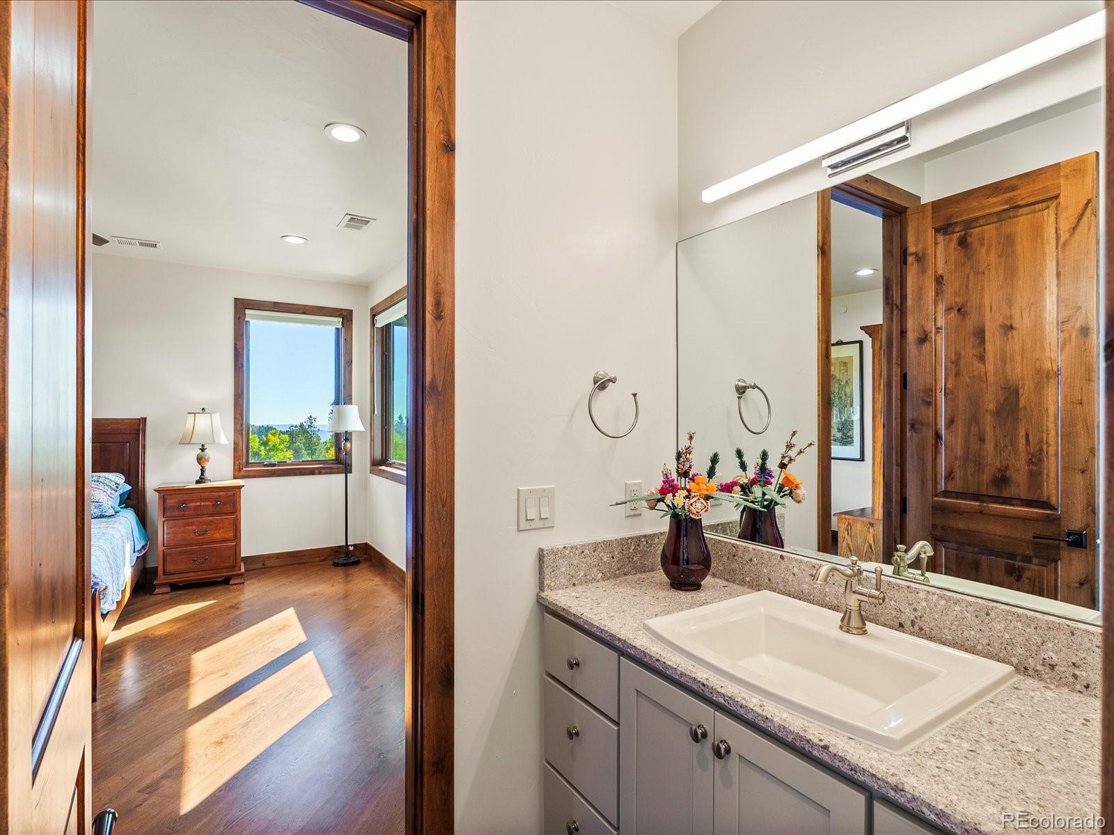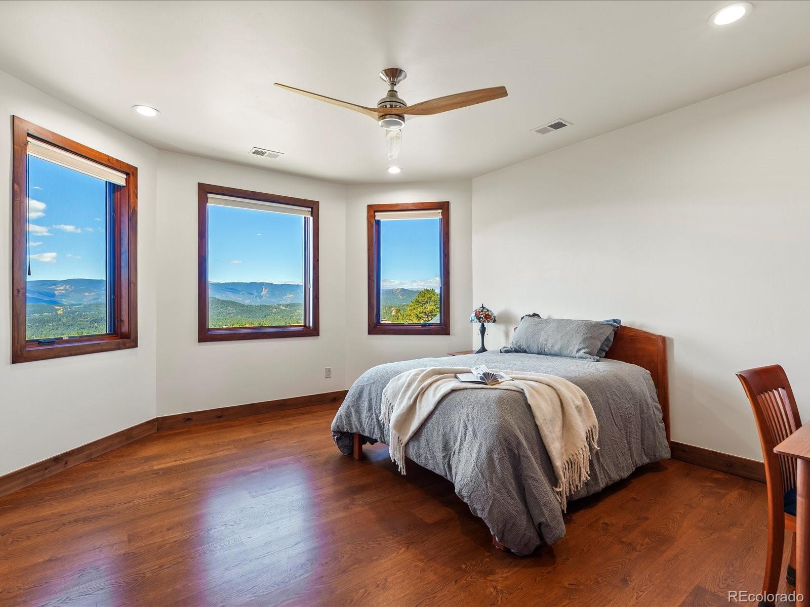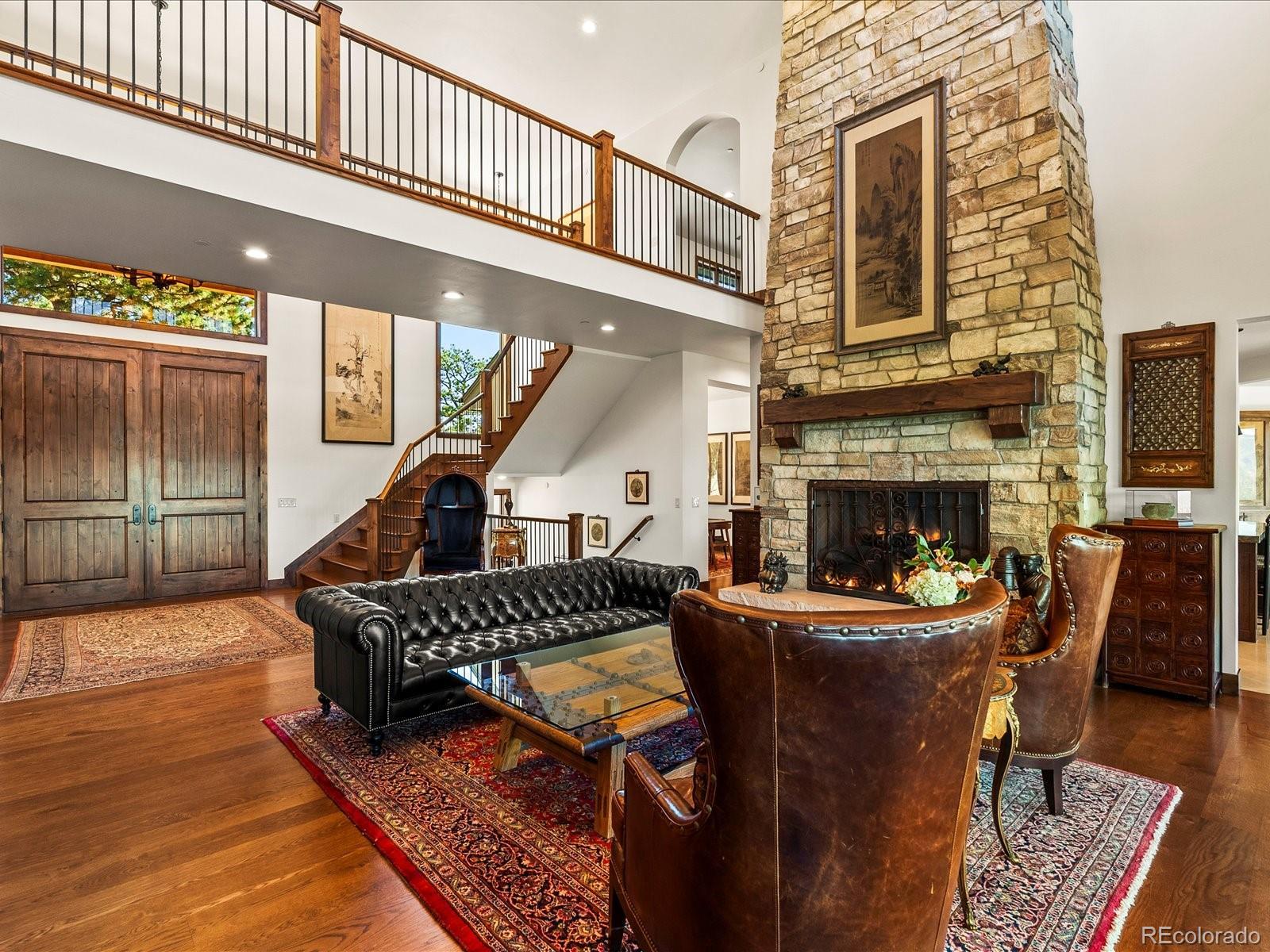 Welcome to 33958 Running Bear Trail, a one-of-a-kind mountain retreat where privacy, artistry, and modern luxury converge. Set atop 20 private acres in the prestigious Reserve at Brauch Ranch, this 2019 masterpiece was custom built to capture awe-inspiring views from nearly every room. With over 7,500 square feet of living space, the residence feels like both a modern gallery and a warm retreat, designed for those who value refined architecture, thoughtful craftsmanship, and an unparalleled connection to nature. Walls of glass frame endless mountain ranges, flooding the interiors with natural light and bringing the outdoors in. Entertaining is elevated with expansive living and dining areas that flow seamlessly onto a covered deck overlooking dramatic vistas. The chef’s kitchen features artistic quartz surfaces, custom cabinetry, a statement island, and a walk-in pantry with rolling ladder. A spa-like primary suite on the main level offers private deck access and a tranquil retreat. Upstairs, generous bedrooms with ensuite and Jack-and-Jill baths offer luxury and privacy for family or guests, alongside a massive loft space ready for creative expression or recreation. The walk-out lower level was designed for living well, complete with a theater, custom library, large office, exercise room, second living space, and abundant storage. This property delivers the rare combination of seclusion and accessibility: less than an hour to downtown Denver yet a world away in atmosphere. If you were to build this home today on this setting, the cost and wait would far exceed its offering. Every element speaks to someone who truly appreciates art, design, and the exclusivity of a private retreat.