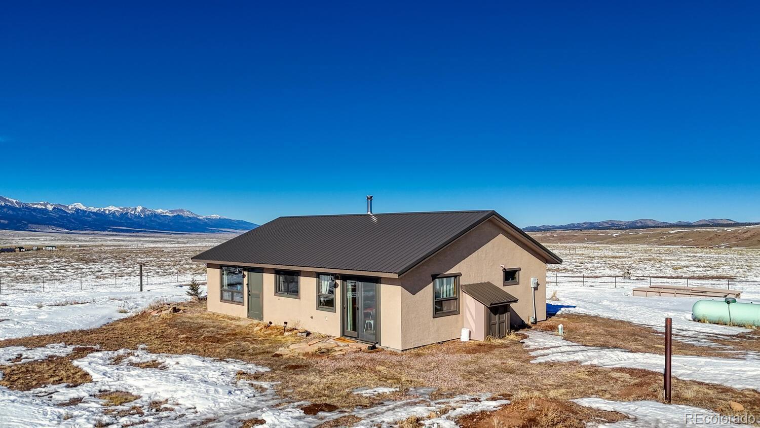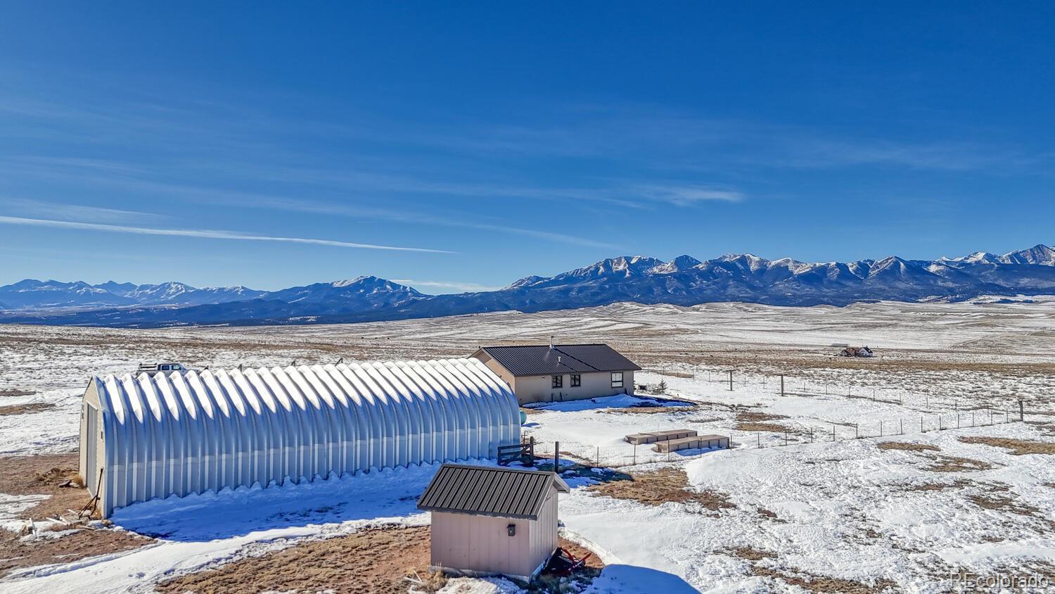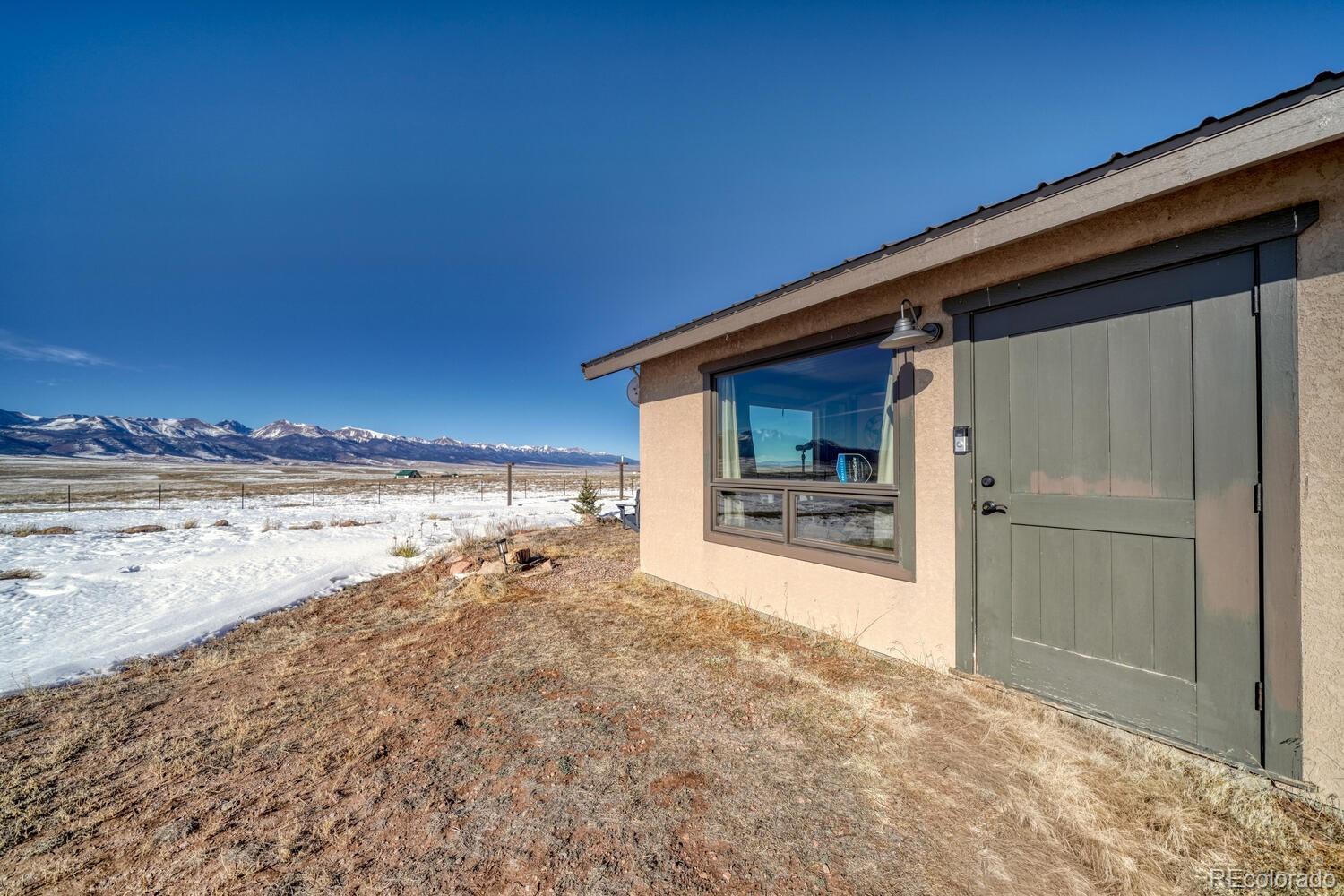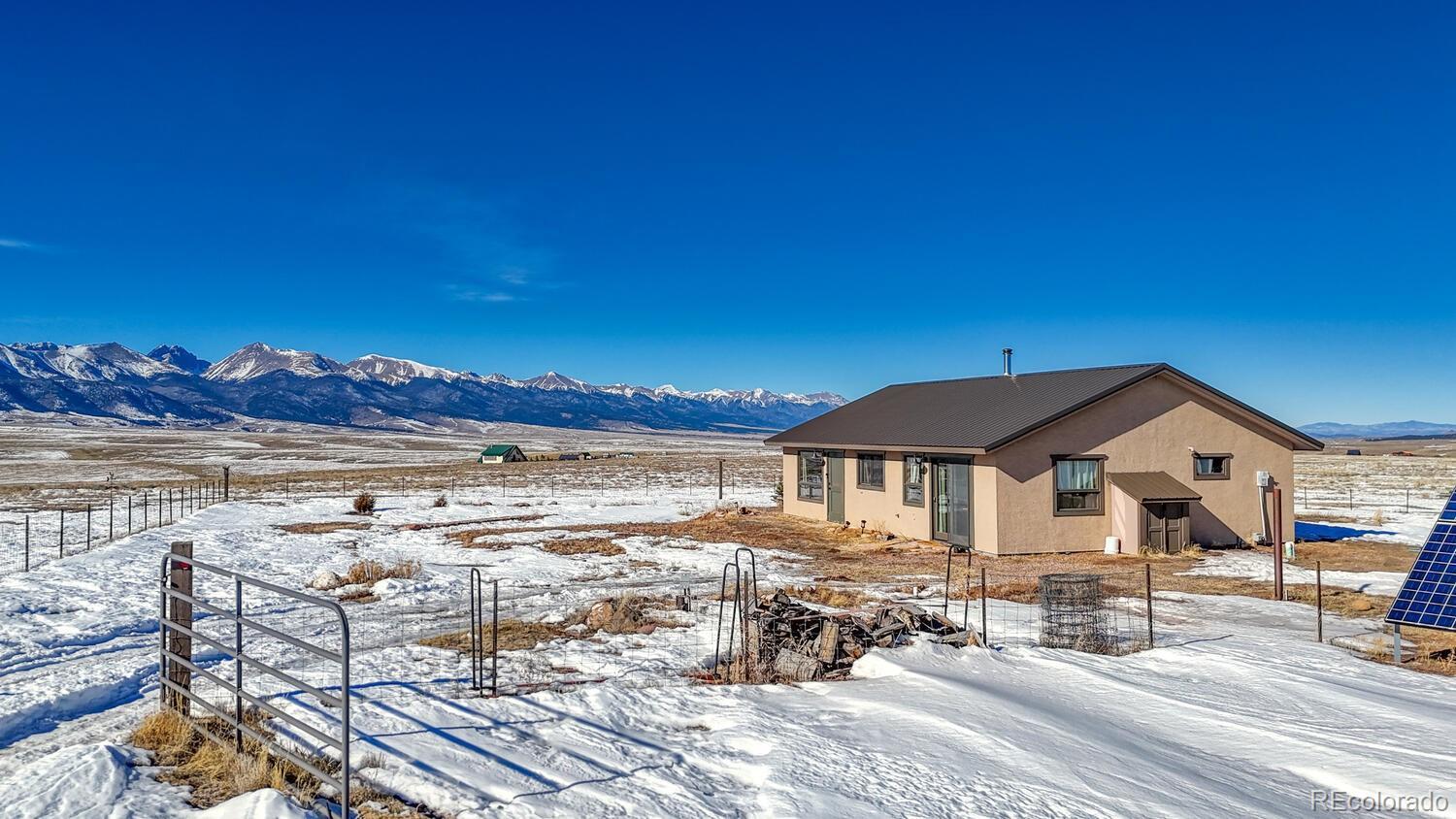 Set on 35 sweeping acres with uninterrupted views of the Sangre de Cristo Mountains, this thoughtfully designed 2-bedroom, 2-bath home offers a rare blend of privacy, simplicity, and wide-open Colorado beauty. The landscape stretches in every direction, where rolling terrain meets expansive skies and the rhythm of daily life naturally slows. Inside, tongue-and-groove wood ceilings run throughout the home, creating a warm, cohesive atmosphere that feels timeless and unmistakably Colorado. Large windows frame the surrounding valley and mountain range from nearly every room, making the views a constant and calming presence. Natural light fills the living spaces, enhancing the home’s comfortable, well-balanced layout. The living area is anchored by a substantial wood stove—designed for real warmth and long winter evenings—while the open flow between the living room and kitchen keeps the home functional and inviting. The kitchen offers generous counter space, distinctive wood cabinetry, and a layout that supports both everyday living and relaxed gatherings, all set against a backdrop of expansive mountain views. Both bedrooms are well-proportioned and filled with natural light, offering peaceful retreats at the end of the day. The bathrooms are clean, practical, and thoughtfully designed to align with the home’s grounded mountain aesthetic. Outside, the land truly defines the experience. Thirty-five acres provide space, privacy, and opportunity—ideal for those seeking room to roam, breathe, and live more intentionally. A large metal outbuilding and solar array support a more self-sufficient lifestyle, while the open terrain and panoramic vistas create a sense of freedom. Quietly impressive, deeply grounding, and rooted in the Colorado landscape, this home invites you to settle in and live connected—to the land, the seasons, and the space around you. Call today to schedule a tour!