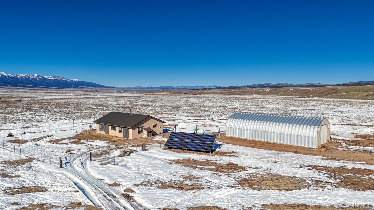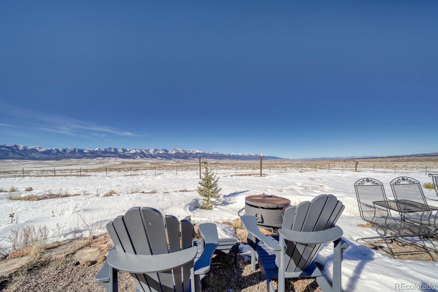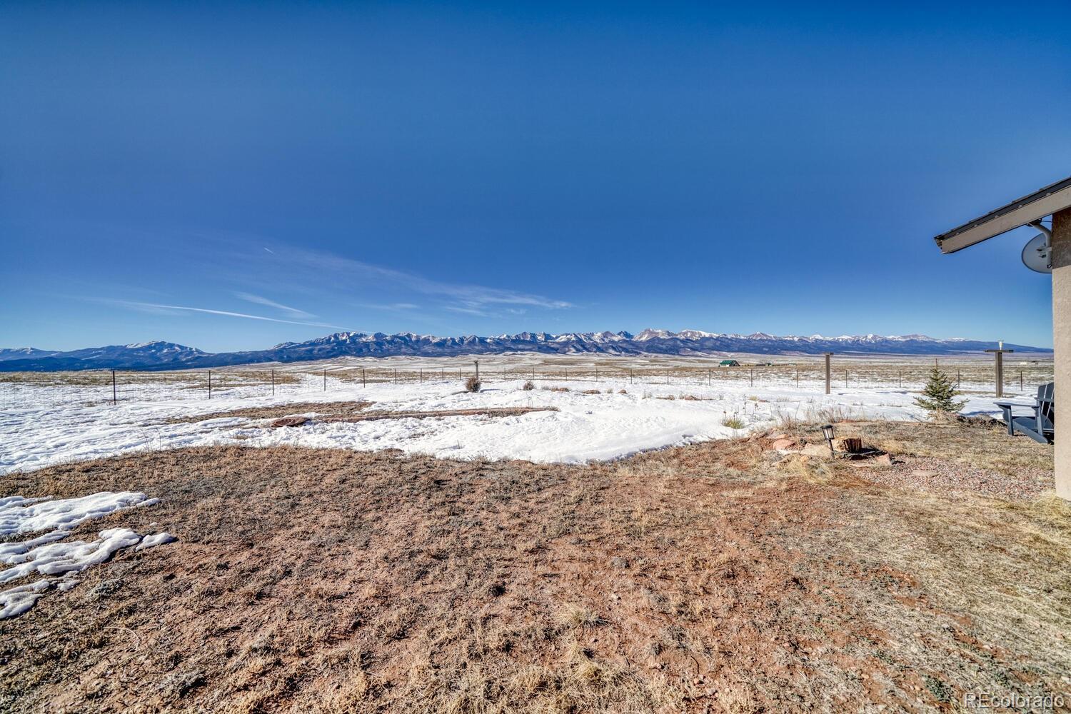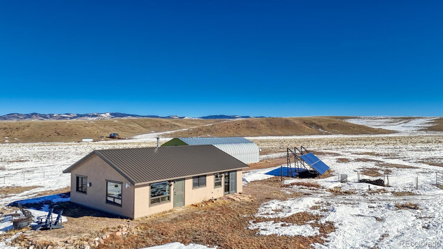 Set on 35 sweeping acres with uninterrupted views of the Sangre de Cristo Mountains, this thoughtfully designed 2-bedroom, 2-bath home offers a rare blend of privacy, simplicity, and wide-open Colorado beauty. The landscape stretches in every direction, where rolling terrain meets expansive skies and the rhythm of daily life naturally slows. Inside, tongue-and-groove wood ceilings run throughout the home, creating a warm, cohesive atmosphere that feels timeless and unmistakably Colorado. Large windows frame the surrounding valley and mountain range from nearly every room, making the views a constant and calming presence. Natural light fills the living spaces, enhancing the home’s comfortable, well-balanced layout. The living area is anchored by a substantial wood stove—designed for real warmth and long winter evenings—while the open flow between the living room and kitchen keeps the home functional and inviting. The kitchen offers generous counter space, distinctive wood cabinetry, and a layout that supports both everyday living and relaxed gatherings, all set against a backdrop of expansive mountain views. Both bedrooms are well-proportioned and filled with natural light, offering peaceful retreats at the end of the day. The bathrooms are clean, practical, and thoughtfully designed to align with the home’s grounded mountain aesthetic. Outside, the land truly defines the experience. Thirty-five acres provide space, privacy, and opportunity—ideal for those seeking room to roam, breathe, and live more intentionally. A large metal outbuilding and solar array support a more self-sufficient lifestyle, while the open terrain and panoramic vistas create a sense of freedom. Quietly impressive, deeply grounding, and rooted in the Colorado landscape, this home invites you to settle in and live connected—to the land, the seasons, and the space around you. Call today to schedule a tour!