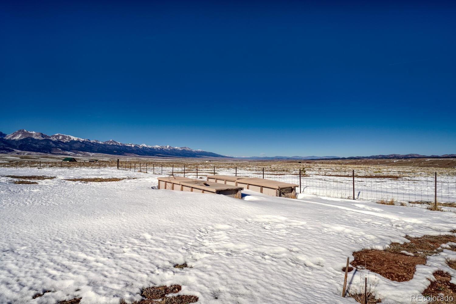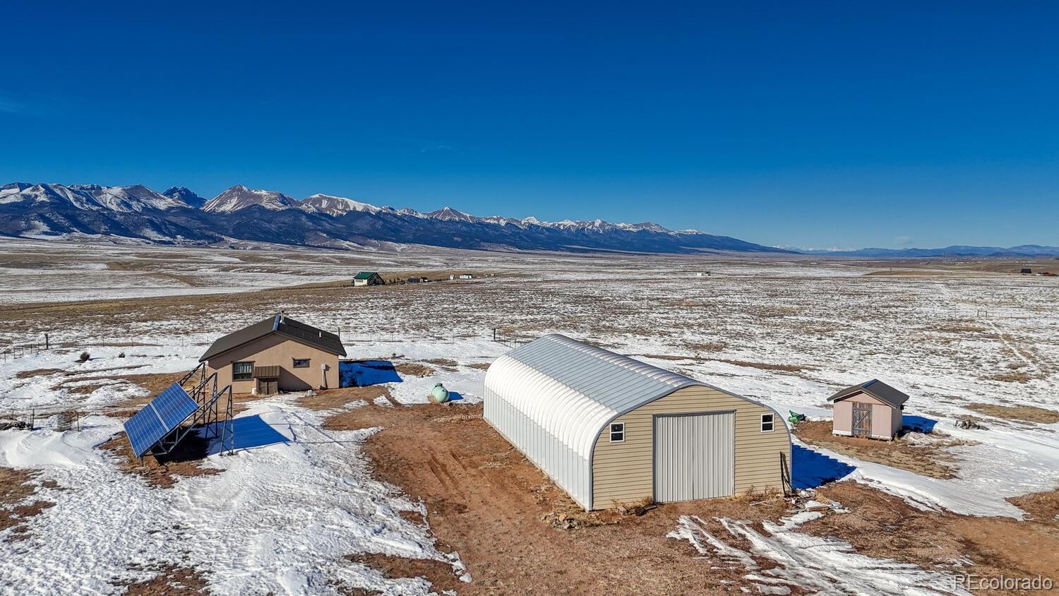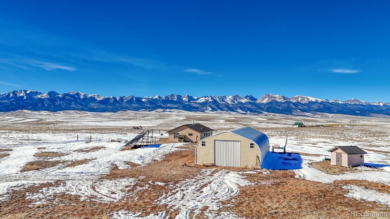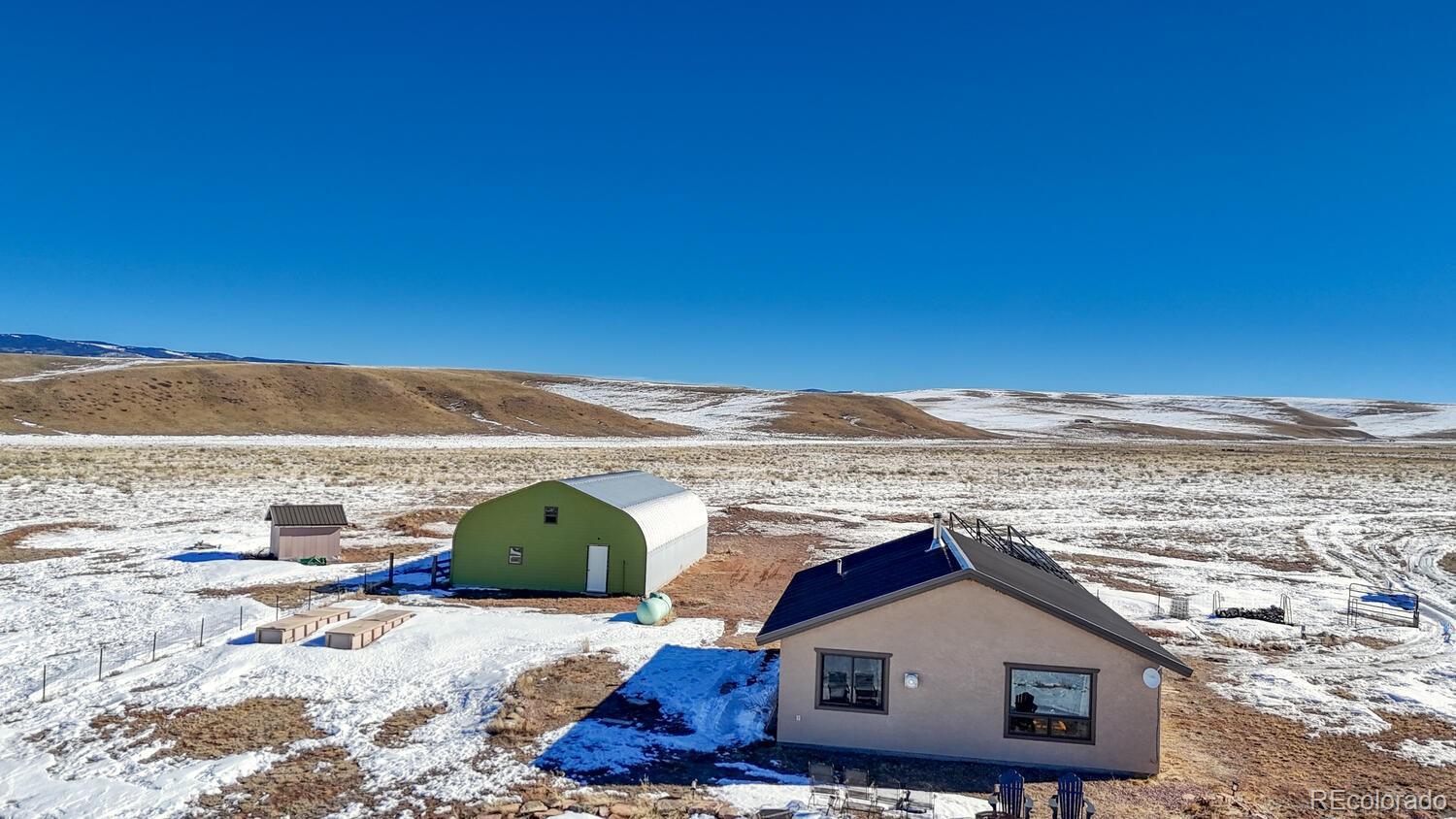 Set on 35 sweeping acres with uninterrupted views of the Sangre de Cristo Mountains, this thoughtfully designed 2-bedroom, 2-bath home offers a rare blend of privacy, simplicity, and wide-open Colorado beauty. The landscape stretches in every direction, where rolling terrain meets expansive skies and the rhythm of daily life naturally slows. Inside, tongue-and-groove wood ceilings run throughout the home, creating a warm, cohesive atmosphere that feels timeless and unmistakably Colorado. Large windows frame the surrounding valley and mountain range from nearly every room, making the views a constant and calming presence. Natural light fills the living spaces, enhancing the home’s comfortable, well-balanced layout. The living area is anchored by a substantial wood stove—designed for real warmth and long winter evenings—while the open flow between the living room and kitchen keeps the home functional and inviting. The kitchen offers generous counter space, distinctive wood cabinetry, and a layout that supports both everyday living and relaxed gatherings, all set against a backdrop of expansive mountain views. Both bedrooms are well-proportioned and filled with natural light, offering peaceful retreats at the end of the day. The bathrooms are clean, practical, and thoughtfully designed to align with the home’s grounded mountain aesthetic. Outside, the land truly defines the experience. Thirty-five acres provide space, privacy, and opportunity—ideal for those seeking room to roam, breathe, and live more intentionally. A large metal outbuilding and solar array support a more self-sufficient lifestyle, while the open terrain and panoramic vistas create a sense of freedom. Quietly impressive, deeply grounding, and rooted in the Colorado landscape, this home invites you to settle in and live connected—to the land, the seasons, and the space around you. Call today to schedule a tour!