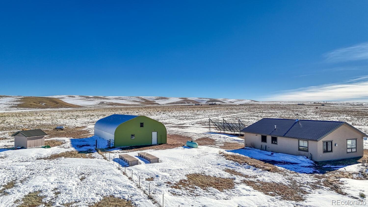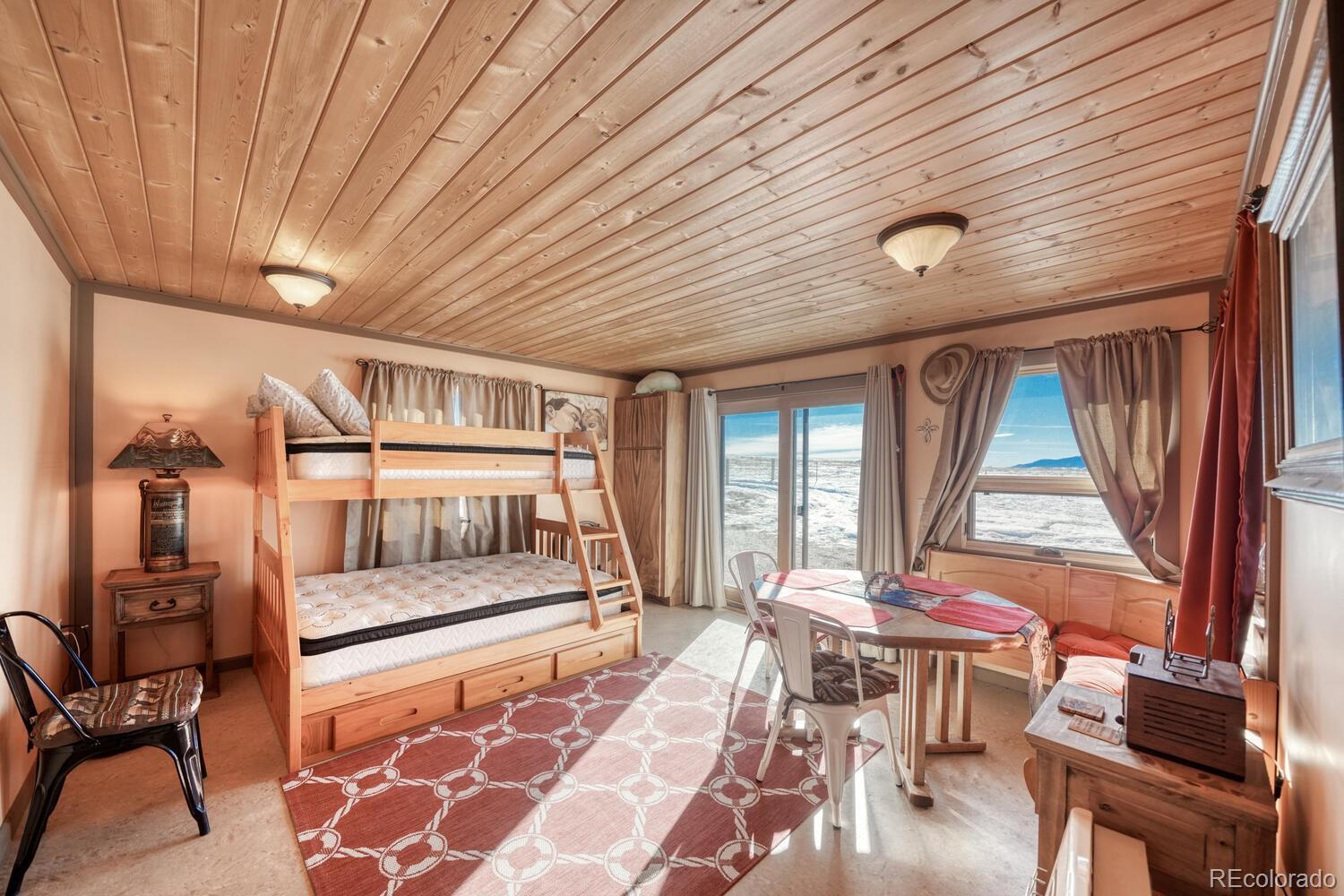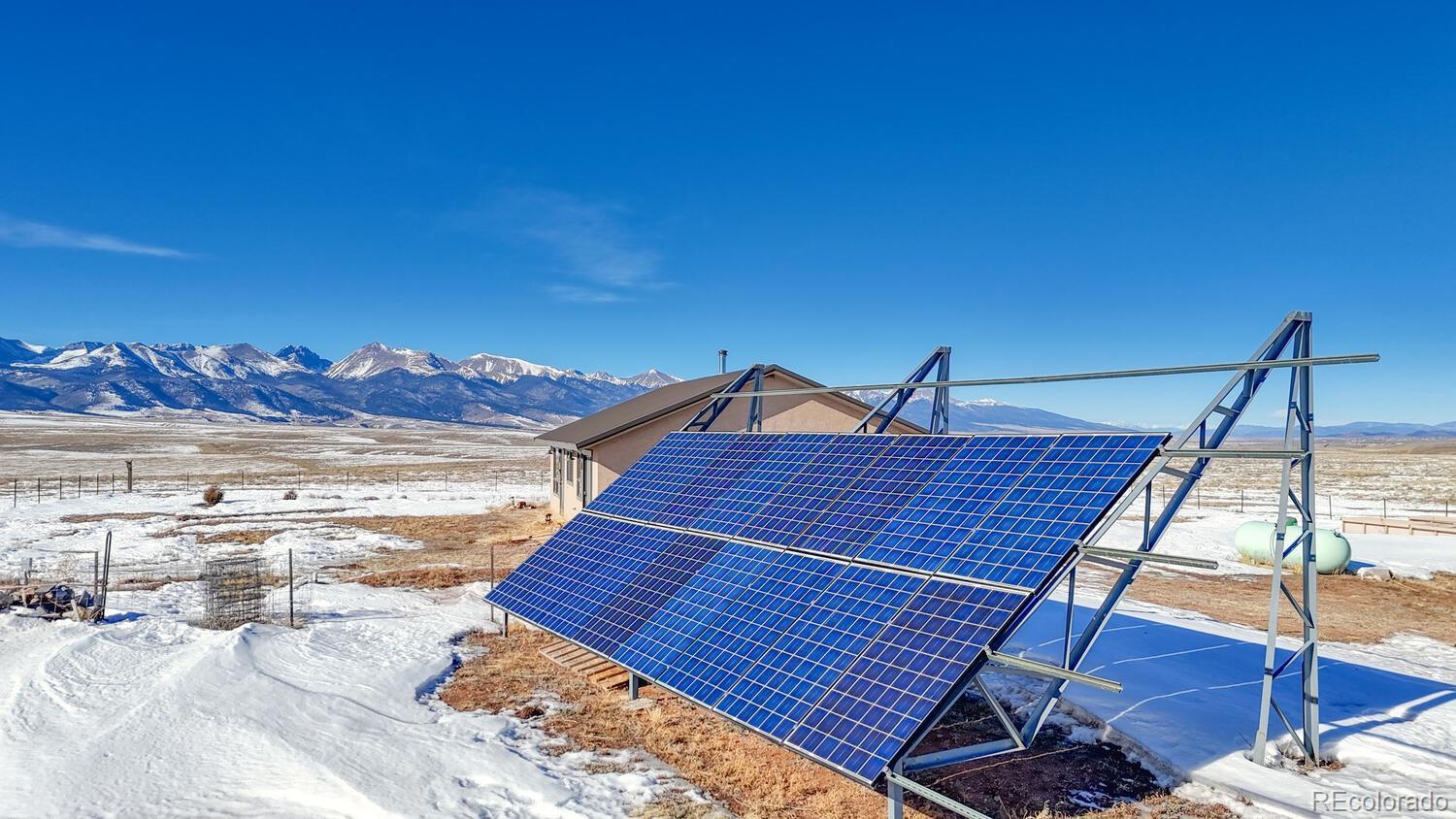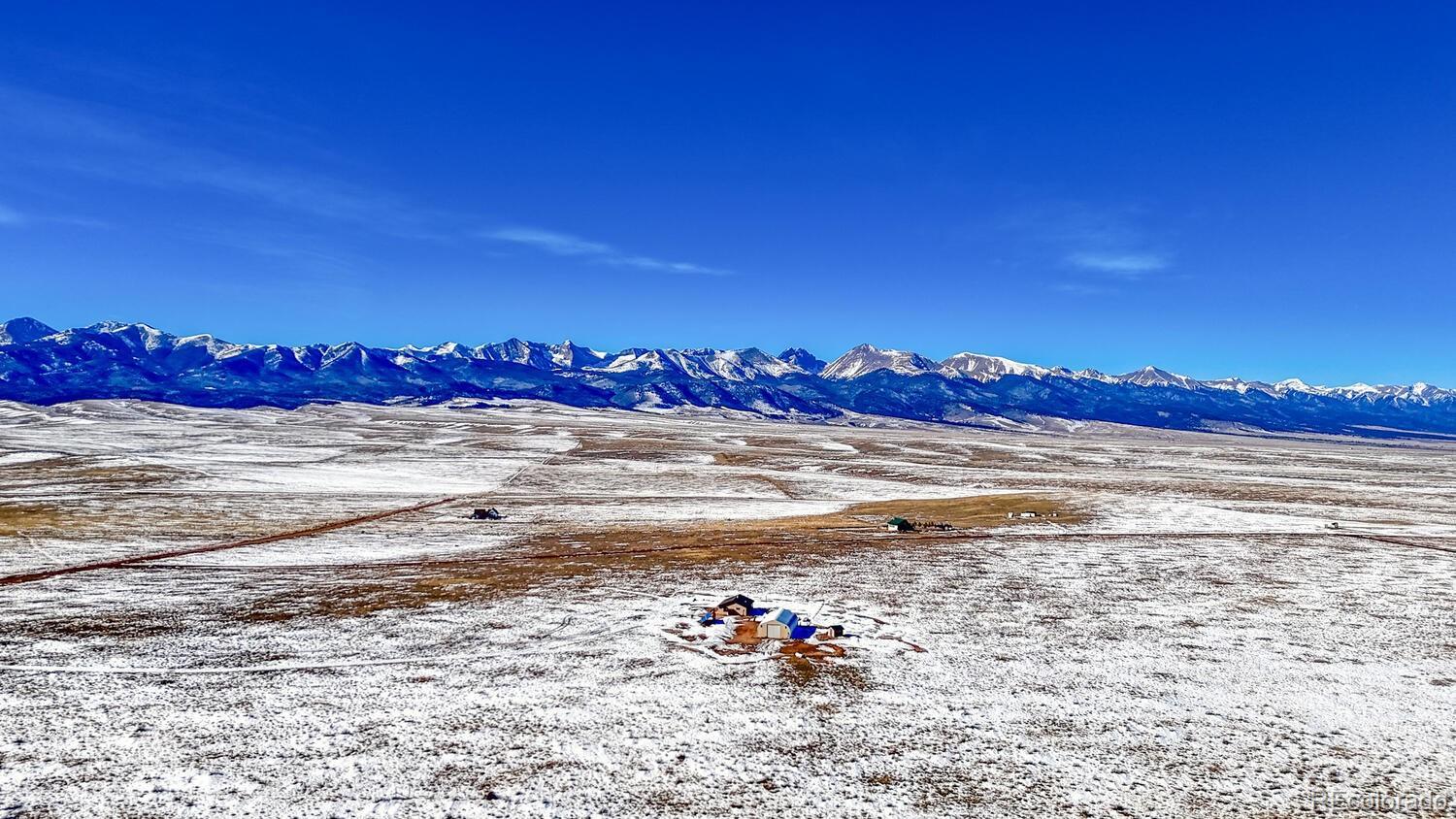 Set on 35 sweeping acres with uninterrupted views of the Sangre de Cristo Mountains, this thoughtfully designed 2-bedroom, 2-bath home offers a rare blend of privacy, simplicity, and wide-open Colorado beauty. The landscape stretches in every direction, where rolling terrain meets expansive skies and the rhythm of daily life naturally slows. Inside, tongue-and-groove wood ceilings run throughout the home, creating a warm, cohesive atmosphere that feels timeless and unmistakably Colorado. Large windows frame the surrounding valley and mountain range from nearly every room, making the views a constant and calming presence. Natural light fills the living spaces, enhancing the home’s comfortable, well-balanced layout. The living area is anchored by a substantial wood stove—designed for real warmth and long winter evenings—while the open flow between the living room and kitchen keeps the home functional and inviting. The kitchen offers generous counter space, distinctive wood cabinetry, and a layout that supports both everyday living and relaxed gatherings, all set against a backdrop of expansive mountain views. Both bedrooms are well-proportioned and filled with natural light, offering peaceful retreats at the end of the day. The bathrooms are clean, practical, and thoughtfully designed to align with the home’s grounded mountain aesthetic. Outside, the land truly defines the experience. Thirty-five acres provide space, privacy, and opportunity—ideal for those seeking room to roam, breathe, and live more intentionally. A large metal outbuilding and solar array support a more self-sufficient lifestyle, while the open terrain and panoramic vistas create a sense of freedom. Quietly impressive, deeply grounding, and rooted in the Colorado landscape, this home invites you to settle in and live connected—to the land, the seasons, and the space around you. Call today to schedule a tour!
