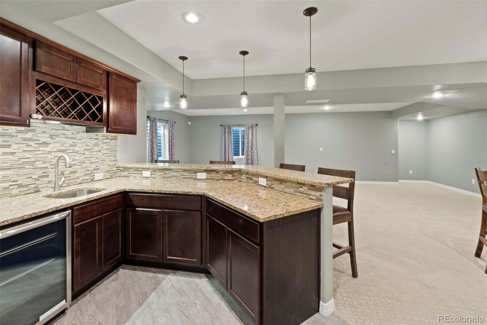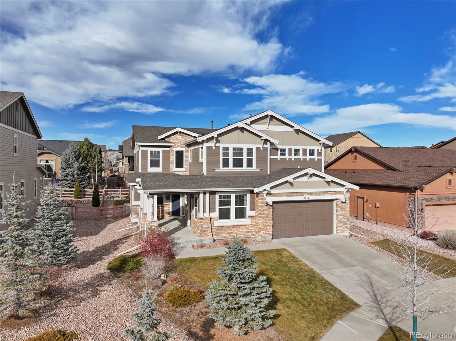 Spacious 5-bedroom, 5-bath two-story home with finished basement and 3-car tandem garage in Wolf Ranch in District 20, set on a low-maintenance cul-de-sac lot. A dramatic two-story entry with niches and curved staircase leads into the heart of the home, gourmet island kitchen with counter bar, cabinets with pullouts, granite counters, walk-in pantry, stainless appliances including a gas range and double ovens, open to the dining nook and great room with gas fireplace, built-in shelves, and rich wood floors that carry through much of the main level. Upstairs, the primary suite features a tray ceiling, walk-in closet, a spa-like 5-piece bath with separate vanities, make-up area, soaking tub, and oversized shower with seat. Two additional bedrooms share a Jack-and-Jill bath and each have walk-in closets, while a third upper bedroom enjoys its own en-suite bath; convenient upper-level laundry with tile floor sits near the bedrooms, along with a large walk-in storage closet. On the main level, a large front office with adjacent powder bath and its own exterior entrance is ideal for a home-based business, private workspace, guest space, caregiver, or client meetings. A formal dining room with tray ceiling and buffet recess sits just off the kitchen, and a mud room with custom cubbies connects to the garage and offers a convenient landing zone. The finished basement adds a large rec room with a cozy niche for media or play and a custom wet bar with driftwood-look tile, granite counters, bar fridge, and wine rack, plus a spacious fifth bedroom and full bath for guests or longer stays. Central air, two furnaces, whole-house air purifier and humidifier, upgraded window wells and covers, a covered front porch, and a location in the planned Wolf Ranch community with neighborhood parks, walking trails, pool, splash park, community events, and quick access to District 20 schools, shopping, restaurants, hospitals, the Powers corridor, and I-25 complete this well-appointed home.